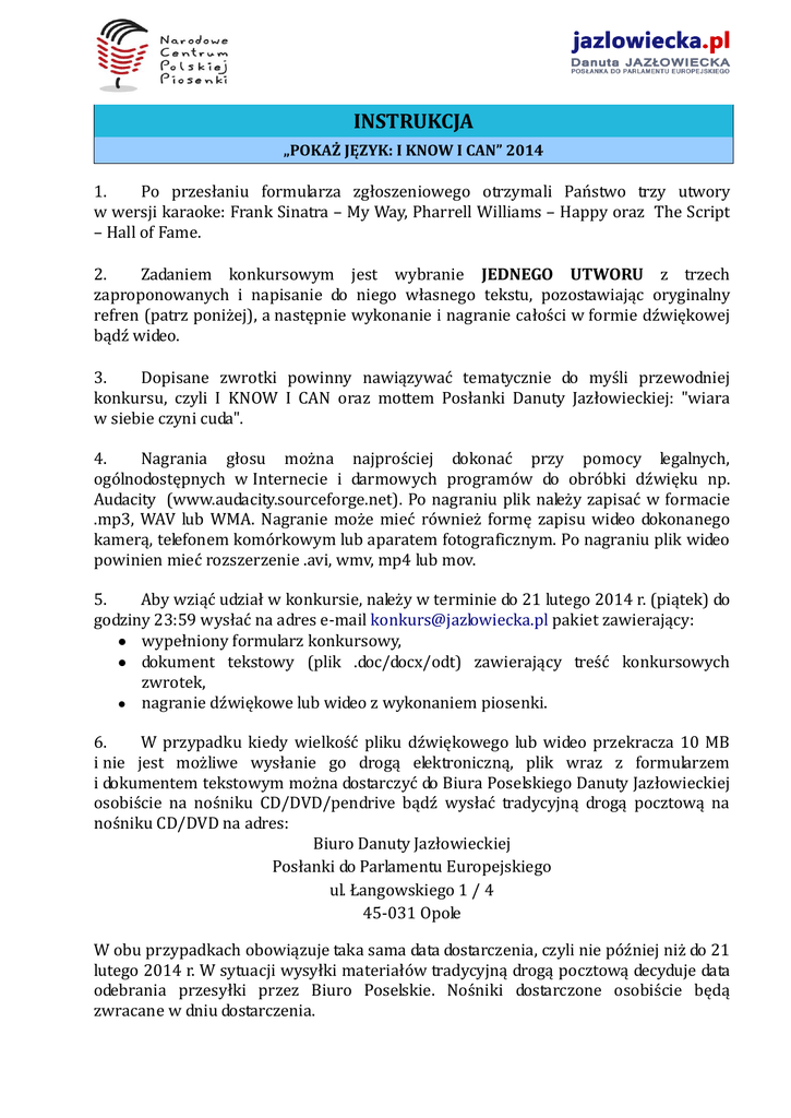 INSTRUKCJA „POKAŻ JĘZYK: I KNOW I CAN” 2014 1. Po przesłaniu formularza zgłoszeniowego otrzymali Państwo trzy utwory w wersji karaoke: Frank Sinatra – My Way, Pharrell Williams – Happy oraz The Script – Hall of Fame. 2. Zadaniem konkursowym jest wybranie JEDNEGO UTWORU z trzech zaproponowanych i napisanie do niego własnego tekstu, pozostawiając oryginalny refren (patrz poniżej), a następnie wykonanie i nagranie całości w formie dźwiękowej bądź wideo. 3. Dopisane zwrotki powinny nawiązywać tematycznie do myśli przewodniej konkursu, czyli I KNOW I CAN oraz mottem Posłanki Danuty Jazłowieckiej: "wiara w siebie czyni cuda". 4. Nagrania głosu można najprościej dokonać przy pomocy legalnych, ogólnodostępnych w Internecie i darmowych programów do obróbki dźwięku np. Audacity (www.audacity.sourceforge.net). Po nagraniu plik należy zapisać w formacie .mp3, WAV lub WMA. Nagranie może mieć również formę zapisu wideo dokonanego kamerą, telefonem komórkowym lub aparatem fotograficznym. Po nagraniu plik wideo powinien mieć rozszerzenie .avi, wmv, mp4 lub mov. 5. Aby wziąć udział w konkursie, należy w terminie do 21 lutego 2014 r. (piątek) do godziny 23:59 wysłać na adres e-mail [email protected] pakiet zawierający: wypełniony formularz konkursowy, dokument tekstowy (plik .doc/docx/odt) zawierający treść konkursowych zwrotek, nagranie dźwiękowe lub wideo z wykonaniem piosenki. 6. W przypadku kiedy wielkość pliku dźwiękowego lub wideo przekracza 10 MB i nie jest możliwe wysłanie go drogą elektroniczną, plik wraz z formularzem i dokumentem tekstowym można dostarczyć do Biura Poselskiego Danuty Jazłowieckiej osobiście na nośniku CD/DVD/pendrive bądź wysłać tradycyjną drogą pocztową na nośniku CD/DVD na adres: Biuro Danuty Jazłowieckiej Posłanki do Parlamentu Europejskiego ul. Łangowskiego 1 / 4 45-031 Opole W obu przypadkach obowiązuje taka sama data dostarczenia, czyli nie później niż do 21 lutego 2014 r. W sytuacji wysyłki materiałów tradycyjną drogą pocztową decyduje data odebrania przesyłki przez Biuro Poselskie. Nośniki dostarczone osobiście będą zwracane w dniu dostarczenia. 7. Wszelkie pytania i wątpliwości prosimy kierować drogą telefoniczną pod numer: 77 453-10-38 bądź elektroniczną na adres: [email protected]. UWAGA: Należy wybrać tylko jeden z poniższych utworów, zachowując w tekście oryginalny refren. Frank Sinatra – My Way _____________________________________________________ _____________________________________________________ _____________________________________________________ _____________________________________________________ _____________________________________________________ _____________________________________________________ And more, much more than this I did it my way (refren) itd. Pharrell Williams – Happy _____________________________________________________ _____________________________________________________ _____________________________________________________ _____________________________________________________ _____________________________________________________ _____________________________________________________ Because I’m happy Clap along if you feel like a room without a roof Because I’m happy Clap along if you feel like happiness is the truth Because I’m happy Clap along if you know what happiness is in you Because I’m happy Clap along if you feel like that’s what you want to do (refren) itd. The Script – Hall of Fame ____________________________________________________ _____________________________________________________ _____________________________________________________ _____________________________________________________ _____________________________________________________ _____________________________________________________ Standing in the Hall of Fame And the world’s gonna know your name Cause you burn with the brightest flame And the world’s gonna know your name And you’ll be on the walls of the Hall of Fame (refren) itd.