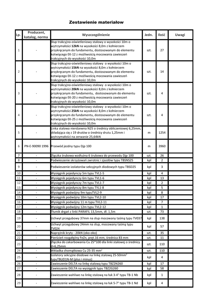 Zestawienie materiałow Lp. Producent, katalog, norma 1 - 2 - 3 - 4 - 5 - 6 Wyszczególnienie Słup trakcyjno-oświetleniowy stalowy o wysokości 10m o wytrzymałości 12kN na wysokości 8,0m z kołnierzem przykręcanym do fundamentu, dostosowanym do elementu kotwiącego EK-12 z możliwością mocowania zawieszeń trakcyjnych do wysokości 10,0m Słup trakcyjno-oświetleniowy stalowy o wysokości 10m o wytrzymałości 15kN na wysokości 8,0m z kołnierzem przykręcanym do fundamentu, dostosowanym do elementu kotwiącego EK-12 z możliwością mocowania zawieszeń trakcyjnych do wysokości 10,0m Słup trakcyjno-oświetleniowy stalowy o wysokości 10m o wytrzymałości 20kN na wysokości 8,0m z kołnierzem przykręcanym do fundamentu, dostosowanym do elementu kotwiącego EK-20 z możliwością mocowania zawieszeń trakcyjnych do wysokości 10,0m Słup trakcyjno-oświetleniowy stalowy o wysokości 10m o wytrzymałości 25kN na wysokości 8,0m z kołnierzem przykręcanym do fundamentu, dostosowanym do elementu kotwiącego EK-25 z możliwością mocowania zawieszeń trakcyjnych do wysokości 10,0m Linka stalowa nierdzewna N25 o średnicy obliczeniowej 6,25mm, składająca się z 19 drutów o średnicy drutu 1,25mm i wytrzymałości na zerwanie 25,64kN PN-E-90090 1996 Przewód jezdny typu Djp 100 Jedn. Ilość szt. 27 szt. 14 szt. 4 szt. 4 m 1254 m 3960 7 8 - Złączka śrubowa wzdłużna 6 śrubowa do przewodu Djp 100 Podwieszenie skrzyżowań zwrotnic i zjazdów typu TBSNS25 szt. kpl 26 2 9 - Podwieszenie izolatorów sekcyjnych diodowych typu TBSD25 kpl 3 10 11 12 13 14 15 16 17 18 - Wysięgnik pojedynczy 5m typu TVL1-5 Wysięgnik pojedynczy 6m typu TVL1-6 Wysięgnik pojedynczy 7m typu TVL1-7 Wysięgnik pojedynczy 8m typu TYL1-8 Wysięgnik podwójny 9m typuTVL2-9 Wysięgnik podwójny 10m typu TVL2-10 Wysięgnik podwójny 11 m typu TVL2-11 Wysięgnik podwójny 12m typu TVL2-12 Tłumik drgań z linki PARAFIL 13,5mm, dł. 1,5m kpl kpl kpl kpl kpl kpl kpl kpl szt. 4 13 2 5 8 17 7 1 73 19 - Uchwyt przegubowy 37mm na słup mocowany taśmą typu TV037 kpl 138 20 - kpl 57 21 22 - szt. szt. 35 11 23 - szt. 110 24 - szt. 110 25 - kpl 4 26 27 - Uchwyt przegubowy 24mm na słup, mocowany taśmą typu TV024 Naprężnik kryty - 20kN (oko-oko) Pierścień rozgałęźny FeZn, pręt.16 mm, średnica 83 mm Złączka do zakarbowania Cu 25*100 dla linki stalowej o średnicy d=6,25mm Wkładka chomątkowa Cu 25-35 mm2 Izolatory sekcyjne diodowe na linkę stalową 25-50mm2 typuTBUD1N-M (plus i minus) Zawieszenie DELTA na linkę stalową typu TBZ2N260 Zawieszenie DELTA na wysięgnik typu TBZ2G260 kpl kpl 17 58 28 - Zawieszenie wahliwe na linkę stalową na łuk 3-4° typu TB-1 Nb kpl 1 29 - Zawieszenie wahliwe na linkę stalową na łuk 5-7° typu TB-1 Nd kpl 4 Uwagi Lp. Producent, katalog, norma Wyszczególnienie Jedn. Ilość 30 - Zawieszenie wahliwe na linkę stalową na łuk 7-10° typu TB-1 Ne kpl 10 31 - Zawieszenie wahliwe na linkę stalową na łuk 10-13° typu TB-1 Nf kpl 3 32 - Zawieszenie wahliwe na linkę stalową na łuk 13-30° typu TB-1 Ng kpl 6 33 34 35 36 - Zawieszenie wahliwe na wysięgnik na łuk 3-4° typu TB-1 Gb Zawieszenie wahliwe na wysięgnik na łuk 4-5° typu TB-1 Gc Zawieszenie wahliwe na wysięgnik na łuk 5-7 typu TB-1 Gd Zawieszenie wahliwe na wysięgnik na łuk 7-10° typu TB-1 Ge kpl kpl kpl kpl 7 2 7 2 37 - Zawieszenie wahliwe na wysięgnik na łuk 10-13° typu TB-1 Gf kpl 4 38 - kpl 1 39 - kpl 1 40 Elektroline kpl 1 41 Elektroline kpl 2 42 43 44 Elektroline - kpl m m 2 416 124 45 - m 12 46 - szt. 12 47 48 49 Wg rys. 08 szt. szt. kpl 24 56 3 50 - szt. 140 51 - szt. 70 52 - Zawieszenie wahliwe na wysięgnik na łuk 13-30° typu TB-IGg Zjazd mechaniczny, niesymetryczny, prawy 2,5/7,5° typu TBSM10P Zwrotnica elektryczna automatyczna, niesymetryczna, lewa 7,5/2,5° typu TBSE10-L VETRA Odłącznik 2 biegunowy 2000A typu U z podwójną izolacją, z napędem silnikowym 24V DC, z baterią akumulatorów ładowaną przetwornicą 660/24V DC z konstrukcją pod odłącznik mocowaną na słupie Sterownik do napędów odłączników typu ORMMPA2G Przewód miedziany typu LgYd 1x120, 750V Przewód miedziany typu LgYd 1 x95,750V Rura ochronna HDPE fi 75 na wysięgnik dla przewodów wyrównawczych Opaski do zamocowania rury ochronnej HDPE fi 75 na wysięgniku 4,8*375 Końcówki kablowe Cu 120 pobielane Zacisk zasilający TBUS, Konstrukcja pod przewody LgYd Wkładka gumowa podwieszenia 4 kabli o srednicy 24mm z paskiem mocującym, Wkładka gumowa podwieszenia 2 kabli o srednicy 27mm z paskiem mocującym, Łącznik podwójny nierdzewny sworzeń 16 mm kpl 100 Uwagi