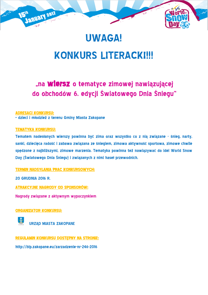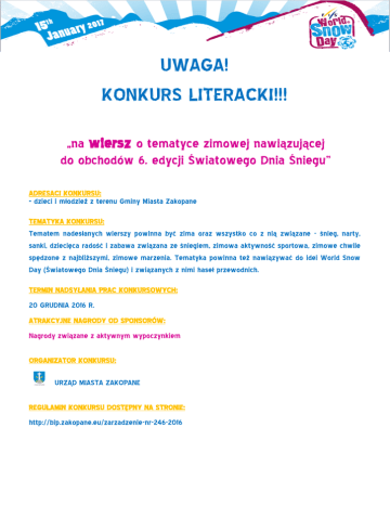 UWAGA! KONKURS LITERACKI!!! „na wiersz o tematyce zimowej nawiązującej do obchodów 6. edycji Światowego Dnia Śniegu” ADRESACI KONKURSU: - dzieci i młodzież z terenu Gminy Miasta Zakopane TEMATYKA KONKURSU: Tematem nadesłanych wierszy powinna być zima oraz wszystko co z nią związane - śnieg, narty, sanki, dziecięca radość i zabawa związana ze śniegiem, zimowa aktywność sportowa, zimowe chwile spędzone z najbliższymi, zimowe marzenia. Tematyka powinna też nawiązywać do idei World Snow Day (Światowego Dnia Śniegu) i związanych z nimi haseł przewodnich. TERMIN NADSYŁANIA PRAC KONKURSOWYCH: 20 GRUDNIA 2016 R. ATRAKCYJNE NAGRODY OD SPONSORÓW: Nagrody związane z aktywnym wypoczynkiem ORGANIZATOR KONKURSU: URZĄD MIASTA ZAKOPANE REGULAMIN KONKURSU DOSTĘPNY NA STRONIE: http://bip.zakopane.eu/zarzadzenie-nr-246-2016