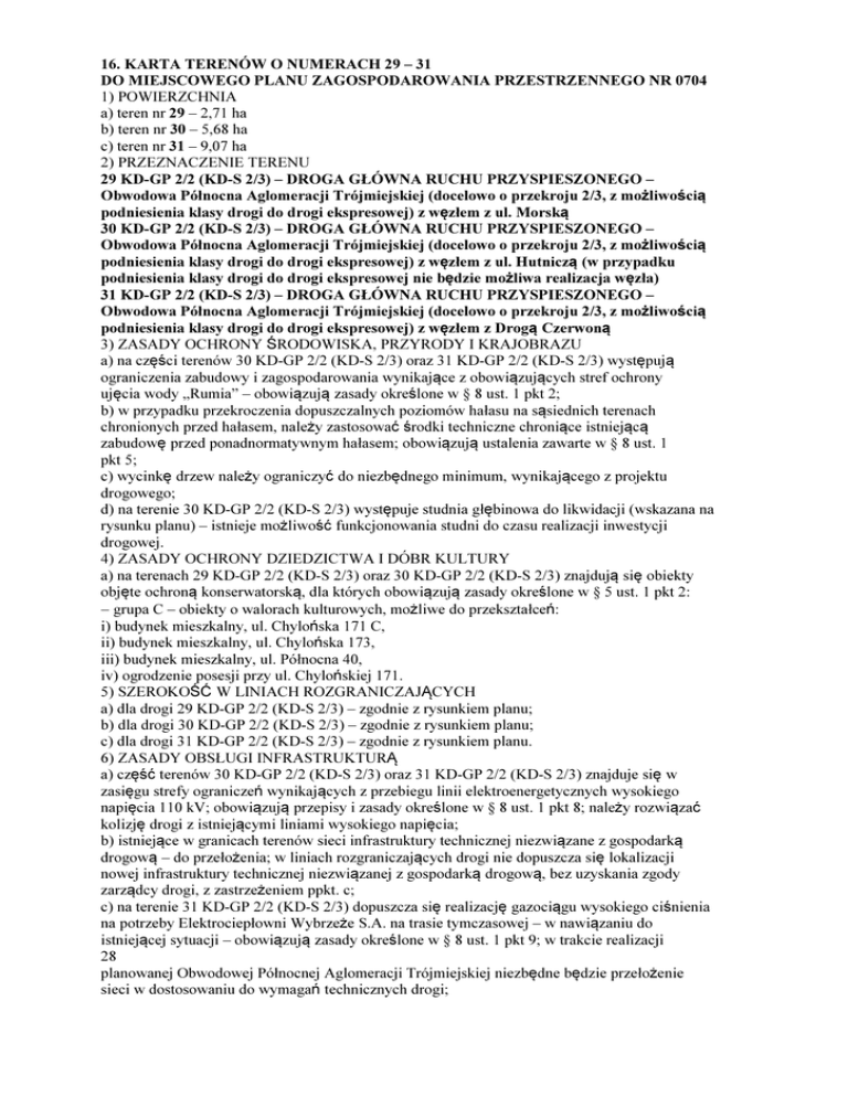16. KARTA TERENÓW O NUMERACH 29 – 31 DO MIEJSCOWEGO PLANU ZAGOSPODAROWANIA PRZESTRZENNEGO NR 0704 1) POWIERZCHNIA a) teren nr 29 – 2,71 ha b) teren nr 30 – 5,68 ha c) teren nr 31 – 9,07 ha 2) PRZEZNACZENIE TERENU 29 KD-GP 2/2 (KD-S 2/3) – DROGA GŁÓWNA RUCHU PRZYSPIESZONEGO – Obwodowa Północna Aglomeracji Trójmiejskiej (docelowo o przekroju 2/3, z możliwością podniesienia klasy drogi do drogi ekspresowej) z węzłem z ul. Morską 30 KD-GP 2/2 (KD-S 2/3) – DROGA GŁÓWNA RUCHU PRZYSPIESZONEGO – Obwodowa Północna Aglomeracji Trójmiejskiej (docelowo o przekroju 2/3, z możliwością podniesienia klasy drogi do drogi ekspresowej) z węzłem z ul. Hutniczą (w przypadku podniesienia klasy drogi do drogi ekspresowej nie będzie możliwa realizacja węzła) 31 KD-GP 2/2 (KD-S 2/3) – DROGA GŁÓWNA RUCHU PRZYSPIESZONEGO – Obwodowa Północna Aglomeracji Trójmiejskiej (docelowo o przekroju 2/3, z możliwością podniesienia klasy drogi do drogi ekspresowej) z węzłem z Drogą Czerwoną 3) ZASADY OCHRONY ŚRODOWISKA, PRZYRODY I KRAJOBRAZU a) na części terenów 30 KD-GP 2/2 (KD-S 2/3) oraz 31 KD-GP 2/2 (KD-S 2/3) występują ograniczenia zabudowy i zagospodarowania wynikające z obowiązujących stref ochrony ujęcia wody „Rumia” – obowiązują zasady określone w § 8 ust. 1 pkt 2; b) w przypadku przekroczenia dopuszczalnych poziomów hałasu na sąsiednich terenach chronionych przed hałasem, należy zastosować środki techniczne chroniące istniejącą zabudowę przed ponadnormatywnym hałasem; obowiązują ustalenia zawarte w § 8 ust. 1 pkt 5; c) wycinkę drzew należy ograniczyć do niezbędnego minimum, wynikającego z projektu drogowego; d) na terenie 30 KD-GP 2/2 (KD-S 2/3) występuje studnia głębinowa do likwidacji (wskazana na rysunku planu) – istnieje możliwość funkcjonowania studni do czasu realizacji inwestycji drogowej. 4) ZASADY OCHRONY DZIEDZICTWA I DÓBR KULTURY a) na terenach 29 KD-GP 2/2 (KD-S 2/3) oraz 30 KD-GP 2/2 (KD-S 2/3) znajdują się obiekty objęte ochroną konserwatorską, dla których obowiązują zasady określone w § 5 ust. 1 pkt 2: − grupa C – obiekty o walorach kulturowych, możliwe do przekształceń: i) budynek mieszkalny, ul. Chylońska 171 C, ii) budynek mieszkalny, ul. Chylońska 173, iii) budynek mieszkalny, ul. Północna 40, iv) ogrodzenie posesji przy ul. Chylońskiej 171. 5) SZEROKOŚĆ W LINIACH ROZGRANICZAJĄCYCH a) dla drogi 29 KD-GP 2/2 (KD-S 2/3) – zgodnie z rysunkiem planu; b) dla drogi 30 KD-GP 2/2 (KD-S 2/3) – zgodnie z rysunkiem planu; c) dla drogi 31 KD-GP 2/2 (KD-S 2/3) – zgodnie z rysunkiem planu. 6) ZASADY OBSŁUGI INFRASTRUKTURĄ a) część terenów 30 KD-GP 2/2 (KD-S 2/3) oraz 31 KD-GP 2/2 (KD-S 2/3) znajduje się w zasięgu strefy ograniczeń wynikających z przebiegu linii elektroenergetycznych wysokiego napięcia 110 kV; obowiązują przepisy i zasady określone w § 8 ust. 1 pkt 8; należy rozwiązać kolizję drogi z istniejącymi liniami wysokiego napięcia; b) istniejące w granicach terenów sieci infrastruktury technicznej niezwiązane z gospodarką drogową – do przełożenia; w liniach rozgraniczających drogi nie dopuszcza się lokalizacji nowej infrastruktury technicznej niezwiązanej z gospodarką drogową, bez uzyskania zgody zarządcy drogi, z zastrzeżeniem ppkt. c; c) na terenie 31 KD-GP 2/2 (KD-S 2/3) dopuszcza się realizację gazociągu wysokiego ciśnienia na potrzeby Elektrociepłowni Wybrzeże S.A. na trasie tymczasowej – w nawiązaniu do istniejącej sytuacji – obowiązują zasady określone w § 8 ust. 1 pkt 9; w trakcie realizacji 28 planowanej Obwodowej Północnej Aglomeracji Trójmiejskiej niezbędne będzie przełożenie sieci w dostosowaniu do wymagań technicznych drogi; d) pozostałe zasady obsługi infrastrukturą wg § 10 ust. 2. 7) STAWKA PROCENTOWA – 0%. 8) INNE ZAPISY a) do czasu zagospodarowania zgodnie z docelowym przeznaczeniem, dopuszcza się na terenach 29-31 KD-GP 2/2 (KD-S 2/3) tymczasowy sposób zagospodarowania terenu i istniejących obiektów na cele usługowo-produkcyjne z dopuszczeniem ich przebudowy, lecz bez możliwości ich rozbudowy lub nadbudowy, oraz dojazd w sposób dotychczasowy – w uzgodnieniu z zarządcą drogi, z zastrzeżeniem ppkt. b; b) do czasu realizacji inwestycji drogowej – Obwodnicy Północnej Aglomeracji Trójmiejskiej oraz inwestycji infrastrukturalnych, dopuszcza się na terenie 29 KD-GP 2/2 (KD-S 2/3), w rejonie ul. Północnej, tymczasowy sposób zagospodarowania terenu jako lokalizacji Gdyńskiego Muzeum Motoryzacji; powierzchnia zabudowy obiektu do 660 m2, wysokość zabudowy do 1 kondygnacji nadziemnej, powierzchnia biologicznie czynna min. 10% powierzchni działki budowlanej, obsługa komunikacyjna w uzgodnieniu z zarządcą dróg publicznych; c) dopuszcza się korektę linii rozgraniczających Obwodnicy Północnej Aglomeracji Trójmiejskiej, pod warunkiem szczegółowego rozstrzygnięcia docelowego przebiegu układu drogowego i zagospodarowania ulicy – zgodnie z projektem drogowym; d) w przypadku realizacji Obwodnicy Północnej Aglomeracji Trójmiejskiej w tunelu, dopuszcza się zagospodarowanie sportowo-rekreacyjne terenu nad tunelem; e) dopuszcza się przeprowadzenie dróg dojazdowych, lokalnych i/lub ścieżek rowerowych przez tereny 29-31 KD-GP 2/2 (KD-S 2/3) w sposób bezkolizyjny w stosunku do Obwodnicy Północnej Aglomeracji Trójmiejskiej (przebiegi wskazane orientacyjnie na rysunku planu); f) w miejscach kolizji przebiegu projektowanej drogi z ciekami wodnymi i rowami melioracyjnymi, dopuszcza się zmianę przebiegu ich koryt oraz skanalizowanie w niezbędnym zakresie, przyjmując parametry przepustu umożliwiające swobodny dostęp do skanalizowanej części cieków w celach konserwacyjnych oraz zachowanie ciągłości ekosystemów; należy zastosować rozwiązania zapewniające możliwość przejść drobnym zwierzętom wzdłuż cieków; g) na terenach 29 KD-GP 2/2 (KD-S 2