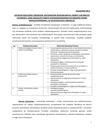 ZAŁĄCZNIK NR 2 KATALOG RZECZOWY URZĄDZEŃ, MATERIAŁÓW BUDOWLANYCH, ROBÓT LUB INNYCH CZYNNOŚCI, JAKIE MOGĄ BYĆ OBJĘTE DOFINANSOWANIEM NA WNIOSEK OSOBY NIEPEŁNOSPRAWNEJ, W SZCZEGÓLNOŚCI OBEJMUJE: Bariery architektoniczne - wszelkie utrudnienia występujące w budynku i w jego najbliższej okolicy, które ze względu na rozwiązania techniczne, konstrukcyjne lub warunki użytkowania uniemożliwiają lub utrudniają swobodę ruchu osobom niepełnosprawnym. Ponadto osoba niepełnosprawna musi być właścicielem nieruchomości lub użytkownikiem wieczystym nieruchomości albo posiadać zgodę właściciela lokalu lub budynku mieszkalnego, w którym stale zamieszkuje. Przykład: podjazd, przystosowanie łazienki, przystosowanie pomieszczenia na łazienkę. Lp. 1. Rodzaj schorzenia Osoby poruszające się przy użyciu wózka inwalidzkiego Elementy likwidacji bariery • • • • • 2. Osoby poruszające się przy pomocy kuli • • • • • 3. Osoby z dysfunkcją narządu wzroku • • • • Przystosowanie pomieszczenia, w tym łazienki lub kuchni (niskie blaty z możliwością wjazdu wózkiem pod blat, obniżenie i obudowanie zlewozmywaka), Pochylnie, windy i podjazdy umożliwiające samodzielne opuszczanie i powrót do miejsca zamieszkania, Oporęczowanie ciągów komunikacyjnych w całym mieszkaniu, Likwidacja progów i zróżnicowanych poziomów posadzek w mieszkaniu, Dostosowanie otworów drzwiowych (o szerokości w świetle ościeżnicy co najmniej 90 cm) Posadzki antypoślizgowe w ciągu komunikacyjnym Drzwi przesuwane Przystosowanie łazienki do potrzeb osoby niepełnosprawnej, Oporęczowanie w ciągu komunikacyjnych w całym mieszkaniu, Likwidacja progów i zróżnicowanych poziomów posadzek w mieszkaniu, Posadzki antypoślizgowe w ciągu komunikacyjnym. Likwidacja progów, Posadzki antypoślizgowe, Oporęczowanie w ciągu komunikacyjnym w całym mieszkaniu. Bariery techniczne - przeszkody wynikające z braku zastosowania lub niedostosowania, odpowiednich do rodzaju niepełnosprawności, przedmiotów lub urządzeń; likwidacja tej bariery powinna powodować sprawniejsze działanie osoby niepełnosprawnej w społeczeństwie i umożliwić wydajniejsze jej funkcjonowanie. Przykład: schodołazy, platformy, kuchenka gazowa, pralka automatyczna, lodówka, piec centralnego ogrzewania, kocioł gazowy, siedzisko łazienkowe, uchwyty w ciągu komunikacyjnym. 1 Lp. 1. 2. 3. 4. Rodzaj schorzenia Osoby poruszające się przy użyciu wózka inwalidzkiego Osoby poruszające się przy pomocy kuli Osoby z dysfunkcją narządu wzroku Choroby psychiczne Elementy likwidacji bariery • Podnośniki, platformy schodowe, transportery schodowe, • Zakup i montaż urządzeń do ogrzewania z własnym źródłem ciepła na paliwo gazowe, olejowe lub energię elektryczną w lokalu lub budynku mieszkalnym osoby niepełnosprawnej zamieszkałej samotnie lub z inną osobą niepełnosprawną z powodu dysfunkcji narządu ruchu, • Pralka automatyczna w przypadku jej braku, • Miksery, roboty w przypadku ich braku, dla osoby niepełnosprawnej zamieszkałej samotnie lub z inną osobą niepełnosprawną • Zakup i montaż urządzeń do ogrzewania z własnym źródłem ciepła na paliwo gazowe, olejowe lub energię elektryczną w lokalu lub budynku mieszkalnym osoby niepełnosprawnej zamieszkałej samotnie lub z inną osobą niepełnosprawną z powodu dysfunkcji narządu ruchu, • Pralka automatyczna w przypadku jej braku, • Miksery, roboty kuchenne w przypadku ich braku, dla osoby niepełnosprawnej zamieszkałej samotnie lub z inną osobą niepełnosprawną. • Kuchenka gazowo – elektryczna z zabezpieczeniem przeciw wypływowym lub czujnik dźwiękowy w przypadku jej braku, • Zakup i montaż urządzeń do ogrzewania z własnym źródłem ciepła na paliwo gazowe, olejowe lub energię elektryczną w lokalu lub budynku mieszkalnym osoby niepełnosprawnej zamieszkałej samotnie lub z inną osobą niepełnosprawną z powodu dysfunkcji narządu ruchu, • Miksery, roboty kuchenne, kuchenki mikrofalowe w przypadku ich braku, dla osoby niepełnosprawnej zamieszkałej samotnie lub z inną osobą niepełnosprawną. • kuchenka gazowo – elektryczna z zabezpieczeniem przeciw wypływowym lub czujnik dźwiękowy w 2 przypadku jej braku 5. Cukrzyca • lodówka w przypadku jej braku 6. Osoby leżące, porażenie czterokończynowe, dysfunkcja narządu ruchu, kręgosłup • Łóżko rehabilitacyjne • Pralka automatyczna w przypadku jej braku 7. Osoby z chorobami układu moczowo – płciowego • Pralka automatyczna w przypadku jej braku 8. Osoby z chorobą układu oddechowego, układu krążenia • Odkurzacz z nawilżaczem powietrza 9. Choroby układu pokarmowego • Lodówka w przypadku jej braku 10. Dysfunkcja kończyn górnych (np. po amputacji, po udarze mózgu) • Zmywarka do naczyń Bariery w komunikowaniu się - ograniczenia uniemożliwiające lub utrudniające osobie niepełnosprawnej swobodne porozumiewanie się i/lub przekazywanie informacji. Przykład: komputer, telefon. Lp. 1. 2. Rodzaj schorzenia Osoby z dysfunkcją narządu wzroku Osoby z dysfunkcją słuchu lub mowy Elementy likwidacji bariery • Instalacja dźwiękowa sygnalizująca i alarmująca • Zakup telefonu z odpowiednim oprogramowaniem dla osób z tego typu rodzajem dysfunkcji (klawiatura brajlowska) • Zakup radia, radiomagnetofonu z odtwarzaczem CD • Zakup maszyny do pisania Braila • Zakup cyfrowej książki mówiącej • Zakup programów i urządzeń brajlowskich • Zakup syntezatora mowy • Usługi lektorów i przewodników, elektryczne słowniki • Identyfikator kolorów • Symbian do telefonu komórkowego • Wyposażenie dzwonka do drzwi w sygnalizację świetlną • Wyposażenie telefonu w sygnalizację wizualną 3 • Zakup faxu (osoby czynne zawodowo) • Zakup budzików świetlnych i wibracyjnych 3. Choroby psychiczne, upośledzenie umysłowe • Zakup radia, magnetofonu 4. Osoby z deficytem ro