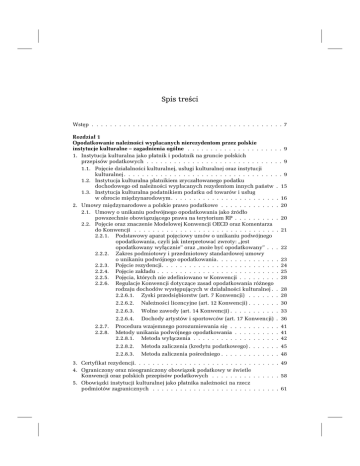 Spis treści Wstęp . . . . . . . . . . . . . . . . . . . . . . . . . . . . . . . . . . . . . . . . . . 7 Rozdział 1 Opodatkowanie należności wypłacanych nierezydentom przez polskie instytucje kulturalne – zagadnienia ogólne . . . . . . . . . . . . . . . . . . . . . 9 1. Instytucja kulturalna jako płatnik i podatnik na gruncie polskich przepisów podatkowych . . . . . . . . . . . . . . . . . . . . . . . . . . . . . . 9 1.1. Pojęcie działalności kulturalnej, usługi kulturalnej oraz instytucji kulturalnej . . . . . . . . . . . . . . . . . . . . . . . . . . . . . . . . . . . 9 1.2. Instytucja kulturalna płatnikiem zryczałtowanego podatku dochodowego od należności wypłacanych rezydentom innych państw . 15 1.3. Instytucja kulturalna podatnikiem podatku od towarów i usług w obrocie międzynarodowym . . . . . . . . . . . . . . . . . . . . . . . . 16 2. Umowy międzynarodowe a polskie prawo podatkowe . . . . . . . . . . . . . 20 2.1. Umowy o unikaniu podwójnego opodatkowania jako źródło powszechnie obowiązującego prawa na terytorium RP . . . . . . . . . . 20 2.2. Pojęcie oraz znaczenie Modelowej Konwencji OECD oraz Komentarza do Konwencji . . . . . . . . . . . . . . . . . . . . . . . . . . . . . . . . 21 2.2.1. Podstawowy aparat pojęciowy umów o unikaniu podwójnego opodatkowania, czyli jak interpretować zwroty: „jest opodatkowany wyłącznie” oraz „może być opodatkowany” . . . 22 2.2.2. Zakres podmiotowy i przedmiotowy standardowej umowy o unikaniu podwójnego opodatkowania. . . . . . . . . . . . . . 23 2.2.3. Pojęcie rezydencji. . . . . . . . . . . . . . . . . . . . . . . . . . 24 2.2.4. Pojęcie zakładu . . . . . . . . . . . . . . . . . . . . . . . . . . . 25 2.2.5. Pojęcia, których nie zdefiniowano w Konwencji . . . . . . . . . 28 2.2.6. Regulacje Konwencji dotyczące zasad opodatkowania różnego rodzaju dochodów występujących w działalności kulturalnej . . 28 2.2.6.1. Zyski przedsiębiorstw (art. 7 Konwencji) . . . . . . . 28 2.2.7. 2.2.8. 2.2.6.2. Należności licencyjne (art. 12 Konwencji) . . . . . . . 30 2.2.6.3. Wolne zawody (art. 14 Konwencji) . . . . . . . . . . . 33 2.2.6.4. Dochody artystów i sportowców (art. 17 Konwencji) . 36 Procedura wzajemnego porozumiewania się . . . . . . . . . . . 41 Metody unikania podwójnego opodatkowania . . . . . . . . . . 41 2.2.8.1. Metoda wyłączenia . . . . . . . . . . . . . . . . . . . 42 2.2.8.2. Metoda zaliczenia (kredytu podatkowego) . . . . . . . 45 2.2.8.3. Metoda zaliczenia pośredniego . . . . . . . . . . . . . 48 3. Certyfikat rezydencji. . . . . . . . . . . . . . . . . . . . . . . . . . . . . . . . 49 4. Ograniczony oraz nieograniczony obowiązek podatkowy w świetle Konwencji oraz polskich przepisów podatkowych . . . . . . . . . . . . . . . 58 5. Obowiązki instytucji kulturalnej jako płatnika należności na rzecz podmiotów zagranicznych . . . . . . . . . . . . . . . . . . . . . . . . . . . . 61 4 Spis treści Rozdział 2 Praktyczne ujęcie problematyki opodatkowania należności wypłacanych nierezydentom świadczącym usługi kulturalne . . . . . . . . . . . . . . . . . . 71 1. Opodatkowanie usług świadczonych przez twórców-nierezydentów (osoby fizyczne) . . . . . . . . . . . . . . . . . . . . . . . . . . . . . . . . . . 71 1.1. Aktor/śpiewak/tancerz/muzyk. . . . . . . . . . . . . . . . . . . . . . . . 71 1.2. Dyrygent . . . . . . . . . . . . . . . . . . . . . . . . . . . . . . . . . . . 81 1.3. Reżyser . . . . . . . . . . . . . . . . . . . . . . . . . . . . . . . . . . . . 89 1.4. Choreograf . . . . . . . . . . . . . . . . . . . . . . . . . . . . . . . . . . 91 1.5. Asystent reżysera/asystent scenografa . . . . . . . . . . . . . . . . . . . 92 1.6. Scenograf . . . . . . . . . . . . . . . . . . . . . . . . . . . . . . . . . . . 93 1.7. Kostiumograf . . . . . . . . . . . . . . . . . . . . . . . . . . . . . . . . . 93 1.8. Autor projekcji . . . . . . . . . . . . . . . . . . . . . . . . . . . . . . . . 94 2. Opodatkowanie usług świadczonych przez instytucje kulturalne niebędące rezydentami na terytorium RP (osoby prawne) . . . . . . . . . . . . . . . . . 94 2.1. Wykonanie przedstawienia teatralnego/operowego/koncertu/imprezy artystycznej lub akcji performatywnej (w celu prezentacji na festiwalu/przeglądzie) . . . . . . . . . . . . . . . . . . . . . . . . . . 94 2.2. Sprzedaż usług wstępu (w formie biletów) na koncerty/imprezy artystyczne/ imprezy kulturalno-rozrywkowe/sportowe . . . . . . . . . 100 2.3. Przeniesienie praw autorskich do nagrania i kopiowania występów artystycznych . . . . . . . . . . . . . . . . . . . . . . . . . . . . . . . . 104 2.4. Reklama polskich usług kulturalnych za granicą . . . . . . . . . . . . . 110 2.5. Wynajem scenografii/eksponatów muzealnych. . . . . . . . . . . . . . 116 2.6. Licencja na wystawienie przedstawienia teatralnego/ /operowego/koncertu . . . . . . . . . . . . . . . . . . . . . . . . . . . . 118 2.7. Licencja na korzystanie z utworu literackiego/utworu muzycznego (nut) . . . . . . . . . . . . . . . . . . . . . . . . . . . . . 121 Rozdział 3 Opodatkowanie podatkiem VAT transgranicznych usług kulturalnych oraz międzynarodowego obrotu towarowego związanego z działalnością kulturalną – zagadnienia ogólne . . . . . . . . . . . . . . . . . . . . . . . . 1. Dyrektywy i Rozporządzenia Wspólnoty Europejskiej jako źródło prawa podatkowego (przedmiot regulacji, moc wiążąca) . . . . . . . . . . . . . 2. Miejsce świadczenia usług kulturalnych . . . . . . . . . . . . . . . . . . 3. Miejsce świadczenia innych usług wykorzystywanych w działalności kulturalnej . . . . . . . . . . . . . . . . . . . . . . . . . . . . . . . . . . 4. Import usług kulturalnych oraz usług niematerialnych . . . . . . . . . . 4.1. Definicja . . . . . . . . . . . . . . . . . . . . . . . . . . . . . . . . 4.2. Obowiązek podatkowy . . . . . . . . . . . . . . . . . . . . . . . . . 4.3. Podstawa opodatkowania . . . . . . . . . . . . . .