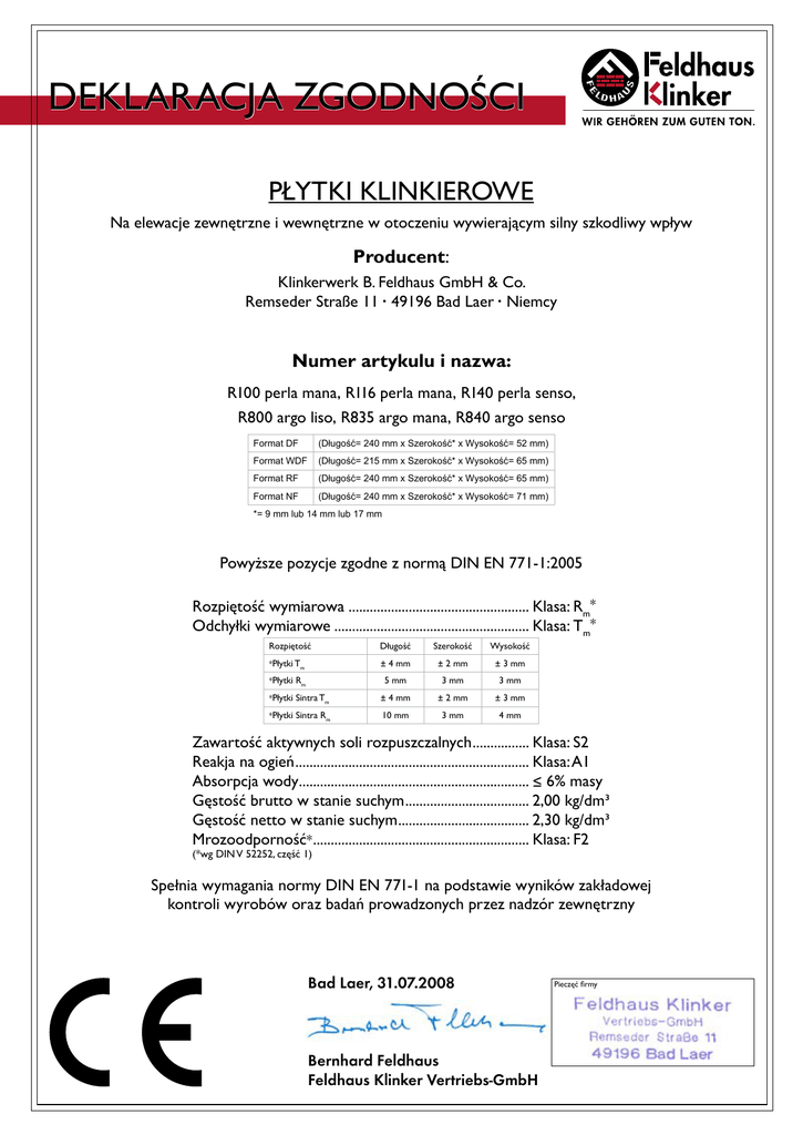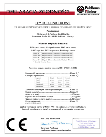 deklaracja Zgodności Płytki klinkierowe Na elewacje zewnętrzne i wewnętrzne w otoczeniu wywierającym silny szkodliwy wpływ Producent: Klinkerwerk B. Feldhaus GmbH & Co. Remseder Straße 11· 49196 Bad Laer· Niemcy Numer artykulu i nazwa: R100 perla mana, R116 perla mana, R140 perla senso, R800 argo liso, R835 argo mana, R840 argo senso Format DF (Długość= 240 mm x Szerokość* x Wysokość= 52 mm) Format WDF (Długość= 215 mm x Szerokość* x Wysokość= 65 mm) Format RF (Długość= 240 mm x Szerokość* x Wysokość= 65 mm) Format NF (Długość= 240 mm x Szerokość* x Wysokość= 71 mm) *= 9 mm lub 14 mm lub 17 mm Powyższe pozycje zgodne z normą DIN EN 771-1:2005 Rozpiętość wymiarowa.................................................... Klasa: Rm* Odchyłki wymiarowe........................................................ Klasa: Tm* Rozpiętość Długość Szerokość Wysokość *Płytki Tm ± 4 mm ± 2 mm ± 3 mm *Płytki Rm 5 mm 3 mm 3 mm *Płytki Sintra Tm ± 4 mm ± 2 mm ± 3 mm *Płytki Sintra Rm 10 mm 3 mm 4 mm Zawartość aktywnych soli rozpuszczalnych................. Klasa: S2 Reakja na ogień................................................................... Klasa: A1 Absorpcja wody.................................................................. ≤ 6% masy Gęstość brutto w stanie suchym.................................... 2,00 kg/dm³ Gęstość netto w stanie suchym...................................... 2,30 kg/dm³ Mrozoodporność*............................................................. Klasa: F2 (*wg DIN V 52252, część 1) Spełnia wymagania normy DIN EN 771-1 na podstawie wyników zakładowej kontroli wyrobów oraz badań prowadzonych przez nadzór zewnętrzny Bad Laer, 31.07.2008 Bernhard Feldhaus Feldhaus Klinker Vertriebs-GmbH Pieczęć firmy deklaracja Zgodności Płytki klinkierowe Na elewacje zewnętrzne i wewnętrzne w otoczeniu wywierającym silny szkodliwy wpływ Producent: Klinkerwerk B. Feldhaus GmbH & Co. Remseder Straße 11· 49196 Bad Laer· Niemcy Numer artykulu i nazwa: R200 amari liso, R287 amari rustico aubergine Format DF (Długość= 240 mm x Szerokość* x Wysokość= 52 mm) Format WDF (Długość= 215 mm x Szerokość* x Wysokość= 65 mm) Format RF (Długość= 240 mm x Szerokość* x Wysokość= 65 mm) Format NF (Długość= 240 mm x Szerokość* x Wysokość= 71 mm) *= 9 mm lub 14 mm lub 17 mm Powyższe pozycje zgodne z normą DIN EN 771-1:2005 Rozpiętość wymiarowa.................................................... Klasa: Rm* Odchyłki wymiarowe........................................................ Klasa: Tm* Rozpiętość Długość Szerokość Wysokość *Płytki Tm ± 4 mm ± 2 mm ± 3 mm *Płytki Rm 5 mm 3 mm 3 mm *Płytki Sintra Tm ± 4 mm ± 2 mm ± 3 mm *Płytki Sintra Rm 10 mm 3 mm 4 mm Zawartość aktywnych soli rozpuszczalnych................. Klasa: S2 Reakja na ogień................................................................... Klasa: A1 Absorpcja wody.................................................................. ≤ 6% masy Gęstość brutto w stanie suchym.................................... 1,90 kg/dm³ Gęstość netto w stanie suchym...................................... 2,30 kg/dm³ Mrozoodporność*............................................................. Klasa: F2 (*wg DIN V 52252, część 1) Spełnia wymagania normy DIN EN 771-1 na podstawie wyników zakładowej kontroli wyrobów oraz badań prowadzonych przez nadzór zewnętrzny Bad Laer, 31.07.2008 Bernhard Feldhaus Feldhaus Klinker Vertriebs-GmbH Pieczęć firmy deklaracja Zgodności Płytki klinkierowe Na elewacje zewnętrzne i wewnętrzne w otoczeniu wywierającym silny szkodliwy wpływ Producent: Klinkerwerk B. Feldhaus GmbH & Co. Remseder Straße 11· 49196 Bad Laer· Niemcy Numer artykulu i nazwa: R220 terracotta liso, R227 terracotta rustico, R228 terracotta rustico carbo, R480 terreno liso, R487 terreno rustico, R687 sintra terracotta linguro Format DF (Długość= 240 mm x Szerokość* x Wysokość= 52 mm) Format WDF (Długość= 215 mm x Szerokość* x Wysokość= 65 mm) Format RF (Długość= 240 mm x Szerokość* x Wysokość= 65 mm) Format NF (Długość= 240 mm x Szerokość* x Wysokość= 71 mm) *= 9 mm lub 14 mm lub 17 mm Powyższe pozycje zgodne z normą DIN EN 771-1:2005 Rozpiętość wymiarowa.................................................... Klasa: Rm* Odchyłki wymiarowe........................................................ Klasa: Tm* Rozpiętość Długość Szerokość Wysokość *Płytki Tm ± 4 mm ± 2 mm ± 3 mm *Płytki Rm 5 mm 3 mm 3 mm *Płytki Sintra Tm ± 4 mm ± 2 mm ± 3 mm *Płytki Sintra Rm 10 mm 3 mm 4 mm Zawartość aktywnych soli rozpuszczalnych................. Klasa: S2 Reakja na ogień................................................................... Klasa: A1 Absorpcja wody.................................................................. ≤ 6% masy Gęstość brutto w stanie suchym.................................... 2,05 kg/dm³ Gęstość netto w stanie suchym...................................... 2,30 kg/dm³ Mrozoodporność*............................................................. Klasa: F2 (*wg DIN V 52252, część 1) Spełnia wymagania normy DIN EN 771-1 na podstawie wyników zakładowej kontroli wyrobów oraz badań prowadzonych przez nadzór zewnętrzny Bad Laer, 31.07.2008 Bernhard Feldhaus Feldhaus Klinker Vertriebs-GmbH Pieczęć firmy deklaracja Zgodności Płytki klinkierowe Na elewacje zewnętrzne i wewnętrzne w otoczeniu wywierającym silny szkodliwy wpływ Producent: Klinkerwerk B. Feldhaus GmbH & Co. Remseder Straße 11· 49196 Bad Laer· Niemcy Numer artykulu i nazwa: R266 nolani mana, R267 nolani mana rosso, R268 nolani viva rustico, R286 nolani rustico carbo, R684 sintra nolani ocasa, R688 sintra sabioso Format DF (Długość= 240 mm x Szerokość* x Wysokość= 52 mm) Format WDF (Długość= 215 mm x Szerokość* x Wysokość= 65 mm) Format RF (D