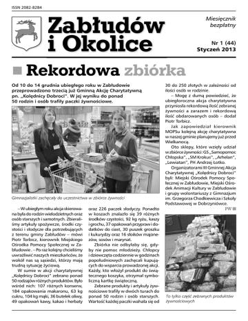 ISSN 2082-8284 Miesięcznik bezpłatny Zabłudów i Okolice Nr 1 (44) Styczeń 2013 Rekordowa zbiórka Od 10 do 14 grudnia ubiegłego roku w Zabłudowie przeprowadzono trzecią już Gminną Akcję Charytatywną pn. „Kolędnicy Dobroci”. W jej wyniku do ponad 50 rodzin i osób trafiły paczki żywnościowe. Gimnazjalistki zachęcały do uczestnictwa w zbiórce żywności – W ubiegłym roku akcja skierowana była do rodzin wielodzietnych oraz osób starszych i samotnych. Zbieraliśmy artykuły spożywcze, środki czystości i słodycze dla potrzebujących z terenu gminy Zabłudów – mówi Piotr Torbicz, kierownik Miejskiego Ośrodka Pomocy Społecznej w Zabłudowie . – Po raz kolejny chcieliśmy uwrażliwić naszych mieszkańców, że wokół nas są sąsiedzi, którzy mają trudną sytuację życiową. W sumie w akcji charytatywnej „Kolędnicy Dobroci” zebrano ponad 50 rodzajów różnych produktów. Było wśród nich: 107 różnych konserw, 184 opakowania makaronu, 63 kg cukru, 104 kg mąki, 36 butelek oliwy, 49 opakowań kawy, kakao i herbaty oraz 226 paczek słodyczy. Ponadto w koszach znalazło się 39 różnych środków czystości, 92 kg ryżu, kaszy i grochu, 37 opakowań przypraw i dodatków do ciast, 30 puszek groszku i kukurydzy oraz 16 słoików majonezów, sosów i marynat. Zbiórka nie odbyłaby się, gdyby nie pomoc młodzieży. Chłopcy i dziewczęta codziennie w godzinach popołudniowych zachęcali kupujących do wsparcia prowadzonej akcji. Każdy, kto włożył produkt do świątecznego koszyka, otrzymał symboliczną kartkę świąteczną. Zebrane produkty i artykuły żywnościowe trafiły w dwóch turach do ponad 50 rodzin i osób starszych. Wartość każdej paczki wahała się od 30 do 250 złotych w zależności od ilości osób w rodzinie. – Mogę z dumą powiedzieć, że ubiegłoroczna akcja charytatywna przyniosła rekordową ilość zebranej żywności a zarazem i rekordową ilość obdarowanych osób – dodał Piotr Torbicz. Jak zapowiedział kierownik MOPSu kolejną akcję charytatywna w naszej gminie planujemy już przed Wielkanocą. Oto sklepy, które wzięły udział w zbiórce żywności: GS „Samopomoc Chłopska”, „SM Krokus”, „Arhelan”, „Lewiatan”, PH Andrzej Łotko. Organizatorami III Gminnej Akcja Charytatywnej „Kolędnicy Dobroci” byli: Miejski Ośrodek Pomocy Społecznej w Zabłudowie, Miejski Ośrodek Animacji Kultury w Zabłudowie i grupy wolontariuszy z Gimnazjum im. Grzegorza Chodkiewicza i Szkoły Podstawowej w Dobrzyniówce. PW To tylko część zebranych produktów żywnościowych 2 Zabłudów i Okolice Śmieci po nowemu Temat zagospodarowania odpadów komunalnych zdominował obrady XIX sesji Rady Miejskiej w Zabłudowie. Odbyła się ona 28 grudnia 2012 roku. Na sesji uchwalono regulamin utrzymania czystości i porządku na terenie gminy, a także ustalono stawki opłat, jakie będą uiszczać mieszkańcy za zagospodarowanie swoich odpadów. Czy warto segregować? Radni spośród czterech możliwych metod wybrali sposób naliczania opłaty śmieciowej „od mieszkańca”. Opłata ta w przypadku, gdy będziemy segregować śmieci wyniesie 6 zł miesięcznie od jednej osoby zamieszkującej posesję. Jeżeli zaś będziemy wszystkie śmieci wrzucać do jednego pojemnika to za wywóz śmieci zapłacimy 15 zł za miesiąc, w przeliczeniu na 1 mieszkańca. Jak obliczyć wielkość pojemnika na śmieci ? Odpady zmieszane będą wrzucane do pojemnika, którego wielkość również jest zależna od liczby osób w gospodarstwie domowym. Jeżeli domownicy będą segregować odpady, to wyliczona norma śmieci zmieszanych na jedną osobę wyniesie 20l. Wówczas kubeł o pojemności 120l wystarczy dla sześcioosobowej rodziny. Jednakże w przypadku, gdy rodzina ta nie zechce segregować śmieci, będzie zmuszona do zakupu większego śmietnika. Wynika to z faktu, że uchwalona norma na mieszkańca niesegregującego śmieci wynosi 40l na osobę. Tak więc w tym przypadku dla sześcioosobowej rodziny będzie konieczny zakup 240 litrowego pojemnika. Wyżej opisaną zależność przedstawia poniższa tabela. Jak segregować odpady? Śmieci będą segregowane w specjalnie do tego celu przeznaczonych workach. W workach koloru niebieskiego będzie gromadzony papier, zielonego – szkło, żółtego – opakowania plastikowe oraz puszki aluminiowe, różowego – odpady wielomateriałowe, brązowego – odpady ulegające biodegradacji. Wyżej opisane, uchwalone przez Radę postanowienia będą obowiązywały w gminie Zabłudów od 1 lipca 2013 roku. Dlatego już w I kwartale br. mieszkańcy gminy zostaną poinformowani o konieczności złożenia stosownej deklaracji, w której poinformują w jaki sposób będą zbierane śmieci oraz przedstawią informację o liczbie osób zamieszkujących ich gospodarstwa domowe. Gdzie wyrzucić starą wersalkę, lodówkę i puszki po farbie? Część z nowouchwalonych przepisów będzie miała swoje zastosowanie już od nowego roku 2013r. Od 1 stycznia działa punkt selektywnego zbierania odpadów komunalnych, który będzie świadczył usługi od wtorku do soboty od godz.8.00 do godz. 15.30. Punkt, o którym mowa mieści się na terenie wysypiska śmieci w lesie koło Zabłudowa. Mieszkańcy gminy mogą tam zostawić posegregowane odpady takie jak m.in. przeterminowane leki, chemikalia (farby, rozpuszczalniki, oleje odpadowe, itd.), zużyte baterie i akumulatory, zużyty sprzęt elektryczny i elektroniczny, meble i inne odpady wielkogabarytowe, odpady budowlano – remontowe, zużyte opony. Nowym systemem gospodarowania odpadami będą obowiązkowo objęci wszyscy mieszkańcy oraz firmy i inne instytucje wytwarzające odpady komunalne, mające swoją siedzibę na terenie gminy. Zabłudów. W osobnych aktach prawnych, które są zamieszczone na stronie Biuletynu Informacji Publicznej UM w Zabłudowie określono wysokość opłat dla firm w zależności od wielkości pojemnika. Regulamin utrz