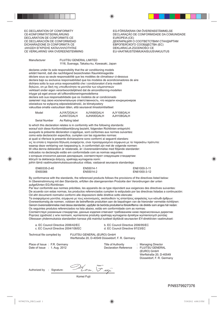 EC DECLARATION OF CONFORMITY CE-KONFORMITÄTSERKLÄRUNG DECLARATION DE CONFORMITE-CE CE DECLARACIÓN DE CONFORMIDAD DICHIARAZIONE DI CONFORMITÀ CE ∆ΗΛΩΣΗ ΕΓΚΡΙΣΗΣ ΚΑΤΑΛΛΗΛOΤΗΤΑΣ CE VERKLARING VAN OVEREENSTEMMING Manufacturer EG-FÖRSÄKRAN OM ÖVERENSSTÄMMELSE DECLARAÇÃO DE CONFORMIDADE DA COMUNIDADE EUROPEIA (CE) ДЕКЛАРАЦИЯ О СООТВЕТСТВИИ СТАНДАРТАМ ЕВРОПЕЙСКОГО СООБЩЕСТВА (ЕС) DEKLARACJA ZGODNOŚCI CE EU-VAATIMUSTENMUKAISUUSVAKUUTUS FUJITSU GENERAL LIMITED 1116, Suenaga, Takatsu-ku, Kawasaki, Japan declares under its sole responsibility that the air conditioning models erklärt hiermit, daß die nachfolgend bezeichneten Raumklimageräte déclare sous sa seule responsabilité que les modèles de climatiseur ci-dessous declara bajo su exclusiva responsabilidad que los modelos de acondicionadores de aire dichiara sotto la sua unica responsabilità che i condizionatori d’aria modelli δηλώνει, oτι με δική της υπευθυνότητα τα μoντέλα των κλιματιστικών verklaart onder eigen verantwoordelijkheid dat de airconditioning-modellen intygar på eget ansvar att luftkonditioneringsmodellerna declara sob sua responsabilidade que os modelos de ar condicionado заявляет под свою исключительную ответственность, что модели кондиционеров oświadcza na wyłączną odpowiedzialność, że klimatyzatory vakuuttaa omalla vastuullaan täten, että seuraavat ilmastointilaitteet Model AJYA72GALH AJHA72GALH Serial Number As Rating label AJYA90GALH AJHA90GALH AJY108GALH AJH108GALH to which this declaration relates is in conformity with the following standards: worauf sich diese Konformitätserklärung bezieht, folgenden Richtlinien entspricht: auxquels la présente déclaration s’applique, sont conformes aux normes suivantes: como esta declaración especifica, cumplen con las siguientes normas: ai quali si riferisce la presente dichiarazione sono conformi ai seguenti standars: εις τα oπoία η παρoύσα δήλωση αναφέρεται, είναι πρoσαρμoσμένα σύμφωνα με τα παρακάτω πρóτυπα: waarop deze verklaring van toepassing is, in conformiteit zijn met de volgende normen: till vilka denna deklaration är relaterade, är i överensstämmelse med följande standarder: indicados na declaração estão em conformidade com as normas seguintes: к которым относится данная декларация, соответствуют следующим стандартам: których ta deklaracja dotyczy, spełniają wymagania norm: joihin tämä vaatimustenmukaisuusvakuutus viittaa, vastaavat seuraavia standardeja: EN60335-2-40 EN50366 EN55014-1 EN55014-2 EN61000-3-11 EN61000-3-12 By conformance with the standards, the referenced products follows the provisions of the directives listed below: In Übereinstimmung mit den Standards, erfüllen die obengenannten Produkte den Verordnungen der unten aufgeführten EG-Richtlinien: Par leur conformité aux normes précitées, les appareils de ce type répondent aux exigences des directives suivantes: De acuerdo con estas normas, los productos referenciados cumplen lo estipulado por las directivas listadas a continuación: Od altri documenti normativi conformi alle disposizioni delle direttive sotto elencate: Τα αναφερóμενα μoντέλα, σύμφωνα με τoυς κανoνισμoύς, ακoλoυθoύν τις απαιτήσεις ασφαλείας των κάτωθι άρθρων: Overeenkomstig de normen, voldoen de betreffende produkten aan de bepalingen van de hieronder vermelde richtlijnen: Genom överensstämmelse med dessa standarder, uppfyller de berörda produkterna föreskrifterna i de direktiv som anges här nedan: Os seguintes produtos referenciados na lista abaixo, estão em conformidade com as normas: Соответствуя указанным стандартам, данные изделия отвечают требованиям ниже перечисленных директив: Poprzez zgodność z w/w normami, wymienione produkty spełniają wymagania dyrektyw wymienionych poniżej: Ollessaan yhdenmukaisia standardien kanssa yllä mainitut tuotteet täyttävät seuraavien EY-direktiivien vaatimukset: a. EC Council Directive 2006/42/EC c. EC Council Directive 2004/108/EC Technical file compiled by FUJITSU GENERAL (EURO) GmbH Werftstraße 20, D-40549 Düsseldorf, F. R. Germany Place of Issue : F.R. Germany Date of Issue : 1. Aug. 2012 Authorized by b. EC Council Directive 2006/95/EC d. EC Council Directive 97/23/EC Title of Authority Declaration Reference : Managing Director : FUJITSU GENERAL (EURO) GmbH Werftstraße 20, D-40549 Düsseldorf, F. R. Germany : Signature: Komei Fujii P/N9379927376 9379927376_DECL.indd 1 7/19/2012 4:08:15 PM According to Annex VII of Directive 97/23/EC-Pressure Equipment Gemäß Anhang VII der Druckgeräterichtlinie 97/23/EG Conformément à l’annexe VII de la directive 97/23/EC sur les équipements sous pression En correspondencia con el Anexo VII de la Directiva 97/23/EC – Equipo de presión In base all’allegato VII della Direttiva 97/23/CE - Attrezzature a pressione Σúμφωνα με τo Пαράρτημα VII της Oδηγίας 97/23/EOK - Eξoπλισμός υπό Пίεση Vo lgens bijlage VII van Richtlijn 97/23/EG - Drukapparatuur Enligt Tillägg VII i EU-direktivet 97/23/EC - Tryckutrustning De acordo com o Anexo VII da Directiva 97/23/CE – Equipamento sob pressão В соответствии с приложением VII предписания 97/23/EC о прессовом оборудовании Zgodnie z załącznikiem VII do dyrektywy 97/23/WE dotyczącej urządzeń ciśnieniowych Painelaitedirektiivin 97/23/EY liitteen VII mukaisesti Manufacturer: Manufacturing Plant: FUJITSU GENERAL LIMITED 1116, Suenaga, Takatsu-ku,