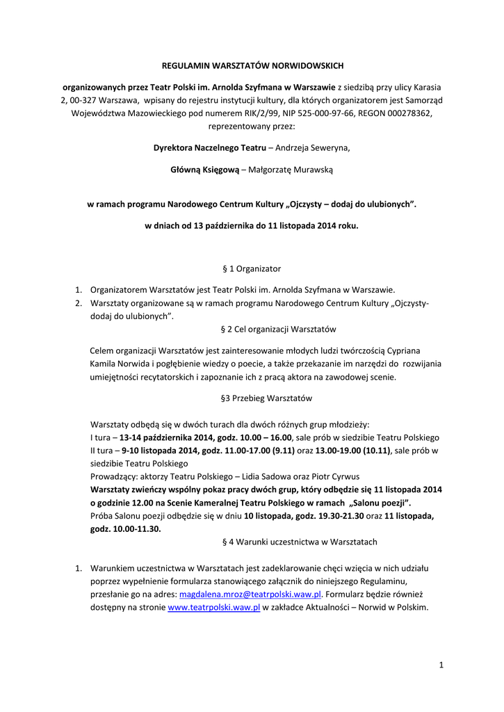 REGULAMIN WARSZTATÓW NORWIDOWSKICH organizowanych przez Teatr Polski im. Arnolda Szyfmana w Warszawie z siedzibą przy ulicy Karasia 2, 00-327 Warszawa, wpisany do rejestru instytucji kultury, dla których organizatorem jest Samorząd Województwa Mazowieckiego pod numerem RIK/2/99, NIP 525-000-97-66, REGON 000278362, reprezentowany przez: Dyrektora Naczelnego Teatru – Andrzeja Seweryna, Główną Księgową – Małgorzatę Murawską w ramach programu Narodowego Centrum Kultury „Ojczysty – dodaj do ulubionych”. w dniach od 13 października do 11 listopada 2014 roku. § 1 Organizator 1. Organizatorem Warsztatów jest Teatr Polski im. Arnolda Szyfmana w Warszawie. 2. Warsztaty organizowane są w ramach programu Narodowego Centrum Kultury „Ojczystydodaj do ulubionych”. § 2 Cel organizacji Warsztatów Celem organizacji Warsztatów jest zainteresowanie młodych ludzi twórczością Cypriana Kamila Norwida i pogłębienie wiedzy o poecie, a także przekazanie im narzędzi do rozwijania umiejętności recytatorskich i zapoznanie ich z pracą aktora na zawodowej scenie. §3 Przebieg Warsztatów Warsztaty odbędą się w dwóch turach dla dwóch różnych grup młodzieży: I tura – 13-14 października 2014, godz. 10.00 – 16.00, sale prób w siedzibie Teatru Polskiego II tura – 9-10 listopada 2014, godz. 11.00-17.00 (9.11) oraz 13.00-19.00 (10.11), sale prób w siedzibie Teatru Polskiego Prowadzący: aktorzy Teatru Polskiego – Lidia Sadowa oraz Piotr Cyrwus Warsztaty zwieńczy wspólny pokaz pracy dwóch grup, który odbędzie się 11 listopada 2014 o godzinie 12.00 na Scenie Kameralnej Teatru Polskiego w ramach „Salonu poezji”. Próba Salonu poezji odbędzie się w dniu 10 listopada, godz. 19.30-21.30 oraz 11 listopada, godz. 10.00-11.30. § 4 Warunki uczestnictwa w Warsztatach 1. Warunkiem uczestnictwa w Warsztatach jest zadeklarowanie chęci wzięcia w nich udziału poprzez wypełnienie formularza stanowiącego załącznik do niniejszego Regulaminu, przesłanie go na adres: [email protected]. Formularz będzie również dostępny na stronie www.teatrpolski.waw.pl w zakładce Aktualności – Norwid w Polskim. 1 2. Warsztaty przeznaczone są w pierwszej kolejności dla laureatów recytatorskich konkursów Norwidowskich odbywających się na terenie województwa mazowieckiego w latach 20112014 dla uczestników w wieku 13-20 lat. 3. Udział w Warsztatach ma charakter bezpłatny. 4. W przypadku osób niepełnoletnich należy okazać organizatorowi pisemne oświadczenie opiekuna prawnego uczestnika zawierające zgodę na udział w Warsztatach. Wzór zgody będzie dostępny na stronie www.teatrpolski.waw.pl w zakładce Aktualności – Norwid w Polskim. § 5 Nabór uczestników 1. Aby wziąć udział w Warsztatach organizowanych w dniach 13-14 października 2014 należy przesłać formularz zgłoszeniowy do dnia 1 października 2014 na adres mailowy wymieniony w § 4, pkt. 1. 2. Aby wziąć udział w warsztatach organizowanych w dniach 9-10 listopada 2014 należy przesłać formularz zgłoszeniowy do dnia 13 października 2014 na adres mailowy wymieniony w § 4, pkt. 1. Decyduje kolejność zgłoszeń. 3. Informacja o przyjęciu na Warsztaty zostanie przesłana mailem oraz przekazana telefonicznie przez koordynatora Warsztatów, na adres mailowy i numer telefoniczny wskazany w formularzu zgłoszeniowym. 4. Teatr zastrzega sobie możliwość przyjęcia do udziału w Warsztatach uczestników, którzy nie spełniają kryteriów wymienionych w § 4 pkt. 2 jeśli nie zbierze się wystarczająca ilość chętnych, którzy je spełniają. Dodatkowy nabór nastąpi poprzez ogłoszenie informacji na stronie internetowej Teatru. §6 Obowiązki Teatru 1. Teatr zobowiązuje się ubezpieczyć od nieszczęśliwych wypadków uczestników Warsztatów na czas pobytu na terenie Teatru. 2. W przypadku uczestników spoza Warszawy Teatr zobowiązuje się zapewnić nocleg oraz wyżywienie na czas pobytu w Warszawie: 13/14 października – jeden nocleg dla pierwszej grupy uczestników 9/10 listopada – jeden nocleg dla drugiej grupy uczestników 10/11 listopada – jeden nocleg dla uczestników Salonu poezji W przypadku uczestników z Warszawy, Teatr zapewnia obiad w dni Warsztatów. 3. Opiekę nad uczestnikami podczas pobytu w Warszawie sprawować będzie koordynator Warsztatów – Magdalena Mróz. 4. Teatr nie ponosi odpowiedzialności za uczestników niepełnoletnich w trakcie ich transportu do Warszawy i z powrotem oraz dojazdu i powrotu z miejsca zamieszkania do miejsca odbywania się Warsztatów. 5. Za występ w Salonie poezji, będący zwieńczeniem Warsztatów, uczestnikom nie należy się wynagrodzenie. 2 § 7 Dane kontaktowe 1. Wszelkich informacji dotyczących organizacji Warsztatów udziela koordynator projektu Magdalena Mróz [email protected], tel.: 512 356 943. 3