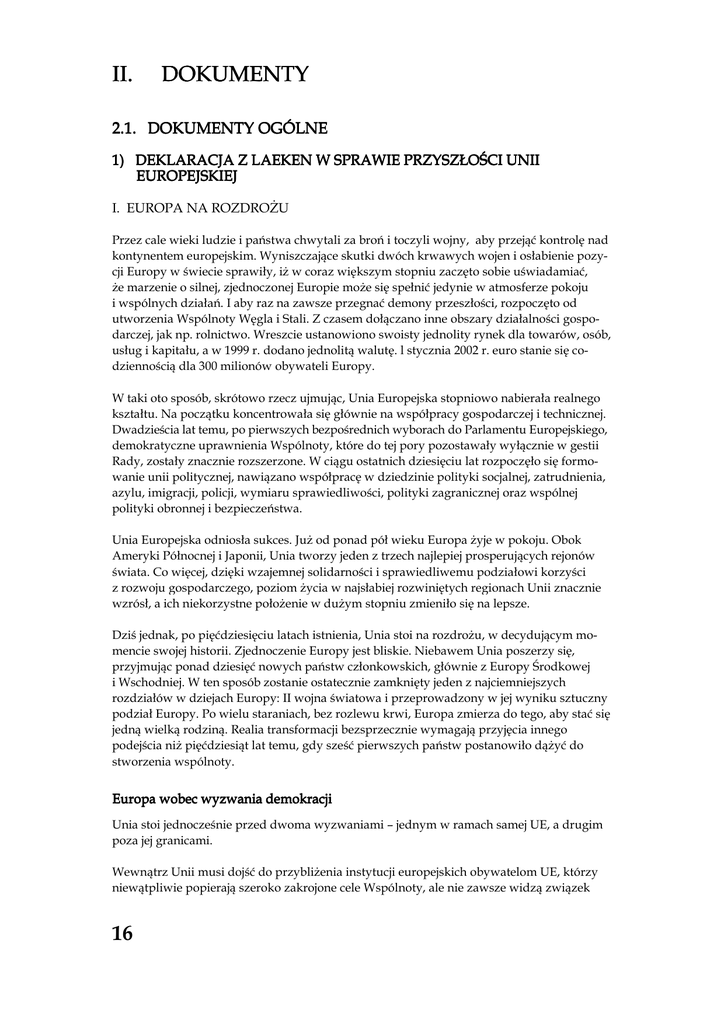II. DOKUMENTY 2.1. DOKUMENTY OGÓLNE 1) DEKLARACJA Z LAEKEN W SPRAWIE PRZYSZŁOŚCI UNII EURO EUROPEJSKIEJ I. EUROPA NA ROZDROŻU Przez cale wieki ludzie i państwa chwytali za broń i toczyli wojny, aby przejąć kontrolę nad kontynentem europejskim. Wyniszczające skutki dwóch krwawych wojen i osłabienie pozycji Europy w świecie sprawiły, iż w coraz większym stopniu zaczęto sobie uświadamiać, że marzenie o silnej, zjednoczonej Europie może się spełnić jedynie w atmosferze pokoju i wspólnych działań. I aby raz na zawsze przegnać demony przeszłości, rozpoczęto od utworzenia Wspólnoty Węgla i Stali. Z czasem dołączano inne obszary działalności gospodarczej, jak np. rolnictwo. Wreszcie ustanowiono swoisty jednolity rynek dla towarów, osób, usług i kapitału, a w 1999 r. dodano jednolitą walutę. l stycznia 2002 r. euro stanie się codziennością dla 300 milionów obywateli Europy. W taki oto sposób, skrótowo rzecz ujmując, Unia Europejska stopniowo nabierała realnego kształtu. Na początku koncentrowała się głównie na współpracy gospodarczej i technicznej. Dwadzieścia lat temu, po pierwszych bezpośrednich wyborach do Parlamentu Europejskiego, demokratyczne uprawnienia Wspólnoty, które do tej pory pozostawały wyłącznie w gestii Rady, zostały znacznie rozszerzone. W ciągu ostatnich dziesięciu lat rozpoczęło się formowanie unii politycznej, nawiązano współpracę w dziedzinie polityki socjalnej, zatrudnienia, azylu, imigracji, policji, wymiaru sprawiedliwości, polityki zagranicznej oraz wspólnej polityki obronnej i bezpieczeństwa. Unia Europejska odniosła sukces. Już od ponad pół wieku Europa żyje w pokoju. Obok Ameryki Północnej i Japonii, Unia tworzy jeden z trzech najlepiej prosperujących rejonów świata. Co więcej, dzięki wzajemnej solidarności i sprawiedliwemu podziałowi korzyści z rozwoju gospodarczego, poziom życia w najsłabiej rozwiniętych regionach Unii znacznie wzrósł, a ich niekorzystne położenie w dużym stopniu zmieniło się na lepsze. Dziś jednak, po pięćdziesięciu latach istnienia, Unia stoi na rozdrożu, w decydującym momencie swojej historii. Zjednoczenie Europy jest bliskie. Niebawem Unia poszerzy się, przyjmując ponad dziesięć nowych państw członkowskich, głównie z Europy Środkowej i Wschodniej. W ten sposób zostanie ostatecznie zamknięty jeden z najciemniejszych rozdziałów w dziejach Europy: II wojna światowa i przeprowadzony w jej wyniku sztuczny podział Europy. Po wielu staraniach, bez rozlewu krwi, Europa zmierza do tego, aby stać się jedną wielką rodziną. Realia transformacji bezsprzecznie wymagają przyjęcia innego podejścia niż pięćdziesiąt lat temu, gdy sześć pierwszych państw postanowiło dążyć do stworzenia wspólnoty. Europa wobec wyzwania demokracji Unia stoi jednocześnie przed dwoma wyzwaniami – jednym w ramach samej UE, a drugim poza jej granicami. Wewnątrz Unii musi dojść do przybliżenia instytucji europejskich obywatelom UE, którzy niewątpliwie popierają szeroko zakrojone cele Wspólnoty, ale nie zawsze widzą związek 16 Z kolei – rozpatrując sytuację UE zewnętrznie – Unia Europejska stoi w obliczu szybko zmieniającego się świata, który podlega coraz większej globalizacji. Po upadku muru berlińskiego przez chwilę wydawało się, że będziemy przez długie lata żyć w stabilnym, uporządkowanym świecie, wolnym od konfliktów, zbudowanym z poszanowaniem praw człowieka. Zaledwie kilka lat później okazało się jednak, że nie ma takiej gwarancji. Wydarzenia z 11 września przyniosły gwałtowne przebudzenie. Siły opozycji nie zniknęły ze sceny: fanatyzm religijny, nacjonalizm etniczny, rasizm i terroryzm wciąż się nasilają, a konflikty regionalne, ubóstwo i zacofanie w rozwoju nadal stanowią dla nich pożywkę. Jaka jest rola Europy w tym zmieniającym się świecie? Czy dziś, gdy Europa jest już wreszcie zjednoczona, nie ma ona do odegrania głównej roli w nowym porządku świata, a więc siły zdolnej odgrywać zarówno rolę stabilizatora na arenie światowej, jak i wskazywać drogę rozwoju wielu krajom i narodom? Europa jako kontynent będący kolebką wartości humanistycznych, Europa, gdzie narodziły się Magna Carta, Bili of Rights, Rewolucja Francuska i która była świadkiem upadku muru berlińskiego; kontynent wolności, solidarności, a przede wszystkim różnorodności, a to oznacza poszanowanie innych języków, kultur i tradycji. Jedyna granica Unii Europejskiej to demokracja i prawa człowieka. Unia jest otwarta jedynie dla tych państw, które stoją na straży fundamentalnych wartości, takich jak wolne wybory, poszanowanie praw mniejszości i respektowanie zasady prawa. Teraz, gdy już nastał koniec zimnej wojny i żyjemy w zglobalizowanym, choć nadal w dużym stopniu podzielonym świecie, Europa musi przejąć ciężar odpowiedzialności za zarządzanie tą globalizacją; musi odegrać rolę siły zdolnej zdecydowanie przeciwstawić się wszelkim formom przemocy, terroru i fanatyzmu, nie zamykając jednak oczu na rażące przejawy niesprawiedliwości. Krótko mówiąc, siły, która chce zmienić bieg spraw tego świata w sposób, który przyniesie korzyści nie tylko państwom bogatym, ale także tym najbiedniejszym; siły, która dąży do nadania globalizacji moralnych ram, innymi słowy – do umocowania jej w idei solidarności i zrównoważonego rozwoju. Oczekiwania obywateli Europy Wizerunek demokratycznej Europy, zaangażowanej w działania o zasięgu globalnym, znakomicie odpowiada pragnieniom obywateli. Opinia publiczna często domaga się zwiększenia roli UE w dziedzinie wymiaru sprawiedliwości i bezpieczeństwa, zwalczania przestępczości transgranicznej, kontroli przepływów migrującej ludności, przyjmowania osób poszukujących azylu i uchodźców z oddalonych stref objętych działaniami wojennymi. Obywatele chcą także konkretnych rezultatów w zakresie 