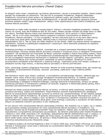 Przedbórz Przedborska fabryka porcelany (Paweł Zięba) 04.03.2013. W dziejach wielu miast i miasteczek, są historie zapomniane i ukryte w przeszłości dziejów. Ulotna ludzka pamięć nie przekazała ich potomnym. Tak jest też w przypadku Przedborza. Skąpość materiałów źródłowych, niszczonych przez pożary czy zaginionych podczas wojen, jak również znikoma liczba przeprowadzonych na jego terenie prac archeologicznych, w sposób dość dotkliwy ogranicza szersze poznanie dziejów miasta i jego mieszkańców. Jedną z wielu zapomnianych kart historii Przedborza, jest budowa fabryki porcelany. Miasteczko to miało mało szczęścia w swojej historii. Jednym z okresów względnej prosperity i wielkiej szansy na rozwój, były dla Przedborza lata 20 XIX wieku. Miasto zaczęło rozwijać się dzięki temu co dała mu natura. Powstała fabryka sukna oraz kamieniołom piaskowca. Są to sprawy w miarę zbadane i znane. Jak by w ich cieniu pozostaje historia związana z próbami uruchomienia na Widomie w Przedborzu, fabryki porcelany. I w tym przypadku, nie bez znaczenia było to co tej ziemi dała natura, czyli woda oraz złoża glinki ogniotrwałej, odkrytej tutaj w znacznych ilościach właśnie w trzecim dziesięcioleciu XIX w. Jak na razie nie wiele wiadomo na ten temat. Udało się jedynie zebrać szczątkowe wiadomości, rozsiane w publikacjach książkowych i prasowych, które stanowiły podstawę do napisana tego skąpego artykułu. Produkcja porcelany na ziemiach polskich, rozwinęła się w czasach panowania Stanisława Augusta Poniatowskiego. Pierwsze polskie fabryki porcelany powstały w kresowym Korcu a następnie Tomaszowie Lubelskim. Ich dyrektorem był Franciszek de Mezer, potomek osiadłej w Polsce francuskiej rodziny, która przybyła nad Wisłę w XVII wieku. W prowadzonych przedsięwzięciach wspomagał go brat Michał. Musieli oni być szczegółowo obeznanymi fachowcami w dziedzinie wyrobu fajansu i porcelany, skoro powierzono im budowanie fabryk oraz wyrób porcelany nieomalże od samych podstaw. Świadczyć to może o utrzymywaniu kontaktów przez Mezerów z rodzinną Francją, i nabywaniu przez nich wiedzy i praktyki w dziedzinie wyrobu tego towaru, w słynnej fabryce porcelany w Sevres pod Paryżem. Sejm, doceniając wybitne osiągnięcia Franciszka Mezera na niwie produkcji białego złota, jak zwykło się, ze względu na dochodowość produkcji, nazywać porcelanę, nadał jemu i jego rodzinie polskie szlachectwo. Pod fachowym okiem ojca wiedzy i praktyki, w prowadzeniu porcelanowego interesu, nabierał jego syn – Karol, który miał po ojcu przejąć zarządzanie tomaszowską fabryką. Ta niestety zaczęła podupadać, ze względu na zmiany granic jakie dokonały się na skutek utworzenia Księstwa Warszawskiego a następnie Królestwa Polskiego, zwanego potocznie Kongresówką. Zmiany te odcięły wytwórnię porcelany w Tomaszowie Lubelskim od terenów, bogatych w doskonałej jakości glinkę, które pozostały pod panowaniem austriackim. Narodził się wtedy pomysł przeniesienia fabryki na tereny, w których glinki kaolinowej, niezbędnej do produkcji porcelany, będzie pod dostatkiem. Rząd Królestwa zezwolił współudziałowcom upadającej fabryki na poszukiwania odpowiedniego surowca na terenie woj. sandomierskiego. W taki właśnie sposób, Karol de Mezer trafił do Przedborza. W podaniu skierowanym do Komisji Spraw Wewnętrznych z dnia 30 kwietnia 1827 roku, Karol w związku z tym, że fabryki w Tomaszowie Lubelskim utrzymać nie może, a pod Przedborzem znalazł odpowiednie złoża glinki, prosi Komisję o pożyczkę w wysokości 20 000 polskich złotych na założenie wytwórni porcelany w tym miasteczku. W tym samym roku tomaszowska fabryka zaprzestaje produkcji. Nie wiadomo czy w części, czy w całości, jej wyposażenie zostaje przeniesione do nowo wybudowanej fabryki porcelany w Przedborzu. Czy fachowcy również się do Przedborza przenieśli? Tego nie wiadomo. Faktem jest, że fabryka została tu wybudowana a przynajmniej zainicjowano jej powstanie. Jej istnienie poświadcza plan miasta Przedborza i Widomy z roku 1828, autorstwa J.W. Jarockiego. Zabudowania fabryki zlokalizowane były w miejscu, w którym obecnie stoi bar Oberża i rozciągały się mniej więcej, na wprost od wylotu ulicy Majowa Góra, która nosiła wtedy nazwę Fabryczna, do granicy z Wolą Przedborską. Niedaleko zatem od fabryki sukiennej wybudowanej przez Wojciecha Lange. W kolejnym podaniu do Komisji Rządowej z dnia 13 marca 1828 roku, Karol Mezer informuje, że zostawił fabrykę w Tomaszowie i prosi znów o pożyczkę na uruchomienie fabryki w Przedborzu. Tym razem jednak jest to kwota 3 000 zł. Na łączną wnioskowaną sumę 23 000 zł, Karol Mezer, otrzymał tylko 4 000 zł. pożyczki. Prawdopodobnie http://www.przedborz.com.pl Kreator PDF Utworzono 3 March, 2017, 00:06 Przedbórz zadecydowało to, że wyrób porcelany w przedborskiej fabryce nigdy nie ruszył. Otrzymane środki musiały okazać się zbyt szczupłe na uruchomienie nowej fabryki. Nie wiadomo na ile też, szczere były intencje otwarcia tej fabryki przez Mezera. Fragment mapy z 1828 roku, W.J. Jarockiego „Plan Przedborza i Przedmieścia Widoma”, z naniesionymi na nią zabudowaniami fabryki porcelany przy ul. Piotrkowskiej. Sprawa odzyskania udzielonej Mezerowi zapomogi, we wspomnianej kwocie 4 000 zł, ciągnęła się do roku 1835. Rząd nie mógł odnaleźć dłużnika w granicach Królestwa Kongresowego, który prawdopodobnie osiadł w należącej do cesarstwa austriackiego, Galicji. Wierzyciel próbując odzyskać chociaż część pożyczonych pieniędzy, próbował zlicytować budynki, w których miała powstać wytwórnia porcelany. Nie było do nabycia nieruchomości jednak chętnych. Bezskutecznie próbowano sprzedać też formy do odlewania naczyń, Lewinowi Sunderlandowi, właścicielowi fabryki fajansu w Iłży. W taki to sposób, zamknął się, trwający krótko jede