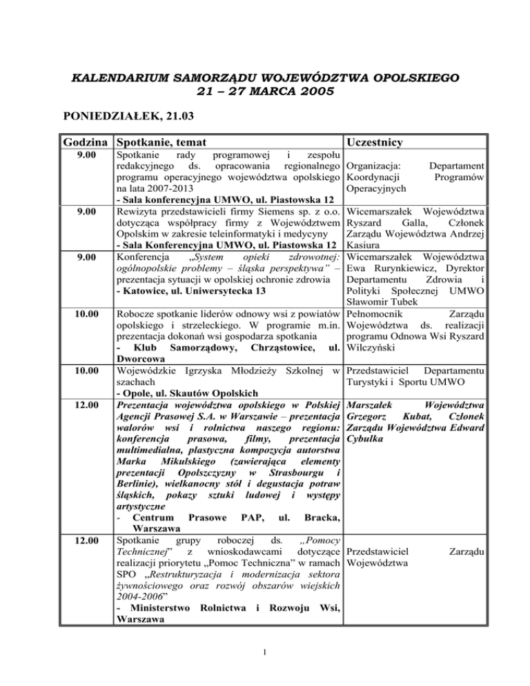 KALENDARIUM SAMORZĄDU WOJEWÓDZTWA OPOLSKIEGO 21 – 27 MARCA 2005 PONIEDZIAŁEK, 21.03 Godzina Spotkanie, temat 9.00 9.00 9.00 10.00 10.00 12.00 12.00 Uczestnicy Spotkanie rady programowej i zespołu redakcyjnego ds. opracowania regionalnego programu operacyjnego województwa opolskiego na lata 2007-2013 - Sala konferencyjna UMWO, ul. Piastowska 12 Rewizyta przedstawicieli firmy Siemens sp. z o.o. dotycząca współpracy firmy z Województwem Opolskim w zakresie teleinformatyki i medycyny - Sala Konferencyjna UMWO, ul. Piastowska 12 Konferencja „System opieki zdrowotnej: ogólnopolskie problemy – śląska perspektywa” – prezentacja sytuacji w opolskiej ochronie zdrowia - Katowice, ul. Uniwersytecka 13 Organizacja: Koordynacji Operacyjnych Departament Programów Wicemarszałek Województwa Ryszard Galla, Członek Zarządu Województwa Andrzej Kasiura Wicemarszałek Województwa Ewa Rurynkiewicz, Dyrektor Departamentu Zdrowia i Polityki Społecznej UMWO Sławomir Tubek Robocze spotkanie liderów odnowy wsi z powiatów Pełnomocnik Zarządu opolskiego i strzeleckiego. W programie m.in. Województwa ds. realizacji prezentacja dokonań wsi gospodarza spotkania programu Odnowa Wsi Ryszard - Klub Samorządowy, Chrząstowice, ul. Wilczyński Dworcowa Wojewódzkie Igrzyska Młodzieży Szkolnej w Przedstawiciel Departamentu szachach Turystyki i Sportu UMWO - Opole, ul. Skautów Opolskich Prezentacja województwa opolskiego w Polskiej Marszałek Województwa Agencji Prasowej S.A. w Warszawie – prezentacja Grzegorz Kubat, Członek walorów wsi i rolnictwa naszego regionu: Zarządu Województwa Edward konferencja prasowa, filmy, prezentacja Cybulka multimedialna, plastyczna kompozycja autorstwa Marka Mikulskiego (zawierająca elementy prezentacji Opolszczyzny w Strasbourgu i Berlinie), wielkanocny stół i degustacja potraw śląskich, pokazy sztuki ludowej i występy artystyczne - Centrum Prasowe PAP, ul. Bracka, Warszawa Spotkanie grupy roboczej ds. „Pomocy Technicznej” z wnioskodawcami dotyczące Przedstawiciel Zarządu realizacji priorytetu „Pomoc Techniczna” w ramach Województwa SPO „Restrukturyzacja i modernizacja sektora żywnościowego oraz rozwój obszarów wiejskich 2004-2006” - Ministerstwo Rolnictwa i Rozwoju Wsi, Warszawa 1 14.00 17.00 Spotkanie Przewodniczącego i Wiceprzewodniczących Sejmiku Województwa Opolskiego z przewodniczącymi Klubów Radnych Sejmiku - Urząd Marszałkowski, pok. 179 Przewodniczący Sejmiku Województwa Andrzej Mazur, Wiceprzewodniczący Sejmiku, Członkowie Klubów, Członkowie Zarządu Województwa Prezentacja multimedialna historii i osiągnięć klubu Dyrektor Departamentu żużlowego „Kolejarz” Turystyki i Sportu UMWO Lucjusz Bilik - Filharmonia Opolska WTOREK, 22.03 Godzina Spotkanie, temat 8.00 10.00 11.00 Uczestnicy Posiedzenie Zarządu Województwa Opolskiego - Gabinet Marszałka XXXII Sesja Sejmiku Województwa Opolskiego – m.in. podjęcie uchwały w sprawie „Programu Rozwoju Bazy Sportowej Województwa Opolskiego”, podjęcie uchwały w sprawie „Zasad i trybu przyznawania, wstrzymywania i cofania oraz wysokości stypendiów sportowych dla zawodników województwa opolskiego osiągających wysokie wyniki sportowe we współzawodnictwie międzynarodowym lub krajowym”, sprawozdanie pt. „Kontrakt dla Województwa Opolskiego na rok 2004”, informacja pt. „Koncepcja funkcjonowania wojewódzkich jednostek oświatowych od 2006 roku” oraz informacja pt. „Realizacja Opolskiego Programu Odnowy Wsi w roku 2004” - Sala Herbowa Uroczyste obchody z okazji „100-lecia Oceny Wartości Użytkowej Bydła w Polsce” połączone z prezentacją wyników oceny za 2004 rok na Opolszczyźnie pod honorowym patronatem Ministra Rolnictwa i Rozwoju Wsi Wojciecha Olejniczaka zorganizowane przez Marszałka Województwa Opolskiego, Krajowe Centrum Hodowli Zwierząt i Okręgowy Związek Hodowców Bydła w Opolu. Podsumowanie m.in. dotychczasowych osiągnięć opolskich hodowców bydła, uhonorowanie najlepszych hodowców - Restauracja Salomon, Opole, ul. Kwoczka 2 Członkowie Zarządu Województwa Radni Województwa, Zarząd Województwa, zaproszeni goście Członek Zarządu Województwa Edward Cybulka, Dyrektor Departamentu Rolnictwa i Rozwoju Wsi UMWO Antoni Jastrzembski 22.III II Doroczna Konferencja i Wystawa BPCC – m.in. Przedstawiciel Departamentu wystawa „Poznaj nabywcę – poznaj dostawcę”, Infrastruktury i Gospodarki warsztaty nt. praktycznych aspektów prowadzenia UMWO działalności gospodarczej w Wielkiej Brytanii oraz współpracy z firmami brytyjskimi. Najważniejsze polsko-brytyjskie forum gospodarcze roku 2005, ważne wydarzenie dla brytyjsko-polskich kontaktów gospodarczych - Hotel Sheraton, Warszawa ŚRODA, 23.03 Godzina Spotkanie, temat 8.00 9.00 11.00 14.00 Uczestnicy Posiedzenie Zarządu Województwa Opolskiego - Gabinet Marszałka Spotkanie wójtów, burmistrzów i prezydentów gmin i miast, przewodniczących zarządów jednostek samorządu terytorialnego z terenu województwa zorganizowane przez Regionalną Izbę Obrachunkową w Opolu – prezentacja wyników działalności nadzorczej i kontrolnej RIO w 2004r. - Restauracja Salomon, Opole, ul. Kwoczka Konferencja pod honorowym patronatem Marszałka Senatu RP Longina Pastusiaka pt. ”Koncepcja organizacji służby zdrowia w województwie”, zorganizowana przez Senat RP, Komisję Samorządu Terytorialnego i Administracji Państwowej oraz Komisję Polityki Społecznej i Zdrowia - Sala Plenarna Senatu RP, Warszawa XXII Sesja Rady Miejskiej w Krapkowicach – m.in. zatwierdzenie „Gminnego programu ochrony środowiska”, przyjęcie Lokalnego Programu Rewitalizacji dla miasta Krapkowice, informacja nt. zadań inwestycyjnych realizowanych przez gminę Krapkowice w 2004r. - Dom Kultury, Krapkowice CZWARTEK, 24.03 Godzina Spotkanie, temat 10.00 Członkowie Zarządu Województwa Skarbnik Województwa Tadeusz Troszyński Wicemarszałek Województwa Rurynkie