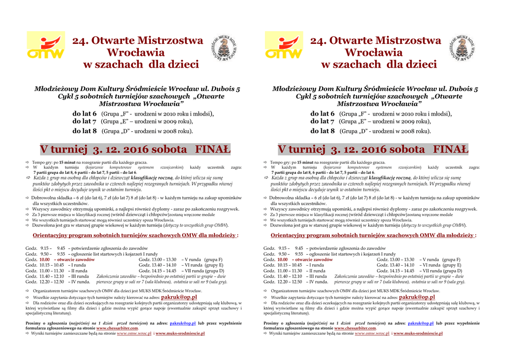 24. Otwarte Mistrzostwa Wrocławia w szachach dla dzieci 24. Otwarte Mistrzostwa Wrocławia w szachach dla dzieci Młodzieżowy Dom Kultury Śródmieście Wrocław ul. Dubois 5 Cykl 5 sobotnich turniejów szachowych „Otwarte Mistrzostwa Wrocławia” Młodzieżowy Dom Kultury Śródmieście Wrocław ul. Dubois 5 Cykl 5 sobotnich turniejów szachowych „Otwarte Mistrzostwa Wrocławia” do lat 6 (Grupa „F” - urodzeni w 2010 roku i młodsi), do lat 7 (Grupa „E” – urodzeni w 2009 roku), do lat 6 (Grupa „F” - urodzeni w 2010 roku i młodsi), do lat 7 (Grupa „E” – urodzeni w 2009 roku), do lat 8 (Grupa „D” - urodzeni w 2008 roku). do lat 8 (Grupa „D” - urodzeni w 2008 roku). V turniej 3. 12. 2016 sobota FINAŁ Tempo gry: po 15 minut na rozegranie partii dla każdego gracza. W każdym turnieju (kojarzenie komputerowe systemem 7 partii grupa do lat 8, 6 partii - do lat 7, 5 partii - do lat 6. szwajcarskim) każdy uczestnik V turniej 3. 12. 2016 sobota FINAŁ zagra: Każda z grup ma osobną dla chłopców i dziewcząt klasyfikację roczną, do której wlicza się sumę punktów zdobytych przez zawodnika w czterech najlepiej rozegranych turniejach. W przypadku równej ilości pkt o miejscu decyduje wynik w ostatnim turnieju. Dobrowolna składka – 6 zł (do lat 6), 7 zł (do lat 7) 8 zł (do lat 8) - w każdym turnieju na zakup upominków dla wszystkich uczestników. Wszyscy zawodnicy otrzymują upominki, a najlepsi również dyplomy - zaraz po zakończeniu rozgrywek. Za 3 pierwsze miejsca w klasyfikacji rocznej (wśród dziewcząt i chłopców)zostaną wręczone medale We wszystkich turniejach startować mogą również uczestnicy spoza Wrocławia. Dozwolona jest gra w starszej grupie wiekowej w każdym turnieju (dotyczy to wszystkich grup OMW). Orientacyjny program sobotnich turniejów szachowych OMW dla młodzieży : Godz. Godz. Godz. Godz. Godz. Godz. Godz. 9.15 – 9.45 – potwierdzenie zgłoszenia do zawodów 9.50 – 9.55 – ogłoszenie list startowych i kojarzeń I rundy 10.00 – otwarcie zawodów Godz. 13.00 – 13.30 – V runda (grupa F) 10.15 – 10.45 – I runda Godz. 13.40 – 14.10 – VI runda (grupy E) 11.00 – 11.30 – II runda Godz. 14.15 – 14.45 – VII runda (grupa D) 11.40 – 12.10 – III runda Zakończenia zawodów – bezpośrednio po ostatniej partii w grupie – dwie 12.20 – 12.50 – IV runda. pierwsze grupy w sali nr 7 (sala klubowa), ostatnia w sali nr 9 (sala gry). Tempo gry: po 15 minut na rozegranie partii dla każdego gracza. W każdym turnieju (kojarzenie komputerowe systemem 7 partii grupa do lat 8, 6 partii - do lat 7, 5 partii - do lat 6. szwajcarskim) każdy uczestnik zagra: Każda z grup ma osobną dla chłopców i dziewcząt klasyfikację roczną, do której wlicza się sumę punktów zdobytych przez zawodnika w czterech najlepiej rozegranych turniejach. W przypadku równej ilości pkt o miejscu decyduje wynik w ostatnim turnieju. Dobrowolna składka – 6 zł (do lat 6), 7 zł (do lat 7) 8 zł (do lat 8) - w każdym turnieju na zakup upominków dla wszystkich uczestników. Wszyscy zawodnicy otrzymują upominki, a najlepsi również dyplomy - zaraz po zakończeniu rozgrywek. Za 3 pierwsze miejsca w klasyfikacji rocznej (wśród dziewcząt i chłopców)zostaną wręczone medale We wszystkich turniejach startować mogą również uczestnicy spoza Wrocławia. Dozwolona jest gra w starszej grupie wiekowej w każdym turnieju (dotyczy to wszystkich grup OMW). Orientacyjny program sobotnich turniejów szachowych OMW dla młodzieży : Godz. Godz. Godz. Godz. Godz. Godz. Godz. 9.15 – 9.45 – potwierdzenie zgłoszenia do zawodów 9.50 – 9.55 – ogłoszenie list startowych i kojarzeń I rundy 10.00 – otwarcie zawodów Godz. 13.00 – 13.30 – V runda (grupa F) 10.15 – 10.45 – I runda Godz. 13.40 – 14.10 – VI runda (grupy E) 11.00 – 11.30 – II runda Godz. 14.15 – 14.45 – VII runda (grupa D) 11.40 – 12.10 – III runda Zakończenia zawodów – bezpośrednio po ostatniej partii w grupie – dwie 12.20 – 12.50 – IV runda. pierwsze grupy w sali nr 7 (sala klubowa), ostatnia w sali nr 9 (sala gry). Organizatorem turniejów szachowych OMW dla dzieci jest MUKS MDK Śródmieście Wrocław. Organizatorem turniejów szachowych OMW dla dzieci jest MUKS MDK Śródmieście Wrocław. Wszelkie zapytania dotyczące tych turniejów należy kierować na adres: [email protected] Dla rodziców oraz dla dzieci oczekujących na rozegranie kolejnych partii organizatorzy udostępniają salę klubową, w której wyświetlane są filmy dla dzieci i gdzie można wypić gorące napoje (ewentualnie zakupić sprzęt szachowy i specjalistyczną literaturę). Wszelkie zapytania dotyczące tych turniejów należy kierować na adres: [email protected] Dla rodziców oraz dla dzieci oczekujących na rozegranie kolejnych partii organizatorzy udostępniają salę klubową, w której wyświetlane są filmy dla dzieci i gdzie można wypić gorące napoje (ewentualnie zakupić sprzęt szachowy i specjalistyczną literaturę). Prosimy o zgłoszenia (najpóźniej na 1 dzień przed turniejem) na adres: [email protected] lub przez wypełnienie formularza zgłoszeniowego na stronie www.chessarbiter.com. Wyniki turniejów zamieszczane będą na stronie www.omw.wroc.pl i www.muks-srodmiescie.pl Prosimy o zgłoszenia (najpóźniej na 1 dzień przed turniejem) na adres: [email protected] lub przez wypełnienie formularza zgłoszeniowego na stronie www.chessarbiter.com. Wyniki turniejów zamieszczane będą na stronie www.omw.wroc.pl i www.muks-srodmiescie.pl