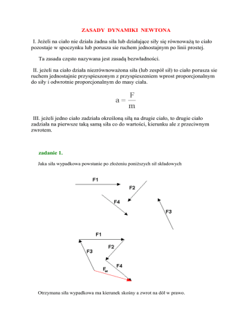 ZASADY DYNAMIKI NEWTONA I. Jeżeli na ciało nie działa żadna siła lub działające siły się równoważą to ciało pozostaje w spoczynku lub porusza sie ruchem jednostajnym po linii prostej. Ta zasada często nazywana jest zasadą bezwładności. II. jeżeli na ciało działa niezrównoważona siła (lub zespół sił) to ciało porusza sie ruchem jednostajnie przyspieszonym z przyspieszeniem wprost proporcjonalnym do siły i odwrotnie proporcjonalnym do masy ciała. III. jeżeli jedno ciało zadziała określoną siłą na drugie ciało, to drugie ciało zadziała na pierwsze taką samą siła co do wartości, kierunku ale z przeciwnym zwrotem. zadanie 1. Jaka siła wypadkowa powstanie po złożeniu poniższych sił składowych Otrzymana siła wypadkowa ma kierunek skośny a zwrot na dół w prawo. zadanie 2. Ciało pod działaniem siły 8 N porusza się z przyspieszeniem 0,4 m/s2. Jakie przyspieszenie będzie mieć to ciało gdy zadziała siła 12 N ? Dane: F1 = 8 N F2 = 12 N a1 = 0,4 m/s2 szukane: a2 = ? rozwiązanie: Aby rozwiązać to zadanie korzystamy z drugiej zasady dynamiki , gdzie podana jest zależność siły od masy ciała w ruchu przyspieszonym. gdzie: a – przyspieszenie, F – działająca siła, m – masa ciała. Bez względu na to, jaka działa siła masa ciała pozostaje niezmienna. Należy więc obliczyć najpierw masę ciała, korzystając z przekształconego wzoru na przyspieszenie, a następnie dopiero obliczać zmianę przyspieszenia w zależności od siły F2. Gdy mamy już obliczoną masę możemy przystąpić do obliczania przyspieszenia a2. odp. Wartość przyspieszenia, gdy zadziała siła F2 wyniesie 0,6 m/s2. zadanie 3. Ciało o masie 5 kg porusza się ze stałą prędkością 4 m/s. Jaką prędkość uzyska to ciało jeżeli przez 1,5 minuty będzie na nie działać siła o wartości 4 N powodując jej wzrost? Dane: m= 5 kg Vp = 4 m/s t= 1,5 min = 90 s F=4N szukane: Vk= ? rozwiązanie: Prędkość początkowa jest już podana i ciało porusza się ruchem jednostajnym. Oznacza to, że nie działają żadne siły lub działające siły się równoważą. Jeżeli przyłożymy dodatkową niezrównoważona siłę to ciało będzie poruszać się ruchem przyspieszonym. Należy obliczyć przyrost prędkości i dodać ją do prędkości początkowej. Aby to zrobić należy najpierw wyliczyć wartość przyspieszenia. gdzie: a – przyspieszenie, F – działająca siła, m – masa ciała. Gdy znamy już przyspieszenie obliczamy przyrost prędkości. co po przekształceniu daje: Prędkość końcowa jest to suma prędkości początkowej i zmiany prędkości. Mamy więc: Odp. Prędkość końcowa w tym ruchy wynosi 76 m/s. zadanie 4. Masa ciała wynosi 50kg. Oblicz ciężar tego ciała? Rozwiązanie: Masa i ciężar to dwie różne wielkości. Ciężar obliczamy w niutonach, a masę w kilogramach. Korzystamy ze wzoru: , a właściwie z przekształcenia tego wzoru: W zadaniu mamy podaną masę m=50kg. Chcemy obliczyć ciężar ciała, czyli siłę z jaką Ziemia przyciąga dane ciało. Znamy wartość przyspieszenia ziemskiego g=9,81≈10N/kg. Po podstawieniu otrzymujemy: Odp. Ciężar ciała wynosi 500N.