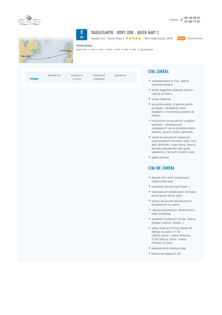 Infolinia 8 TRANSATLANTYK - NOWY JORK - QUEEN MARY 2 DNI Cunard Line - Queen Mary 2 | Rok modernizacji: 2016 | 801 08 08 03 22 492 77 90 9.8/10 Ocena klientów TRASA REJSU: Nowy Jork Wewnętrzna TERMIN dzie dzie Zewnętrzna Zewnętrzna z oknem z balkonem dzie dzie dzie Apartament dzie Southampton CENA ZAWIERA zakwaterowanie w 2-os. kabinie wybranej kategorii serwis bagażowy podczas wejścia i zejścia ze statku serwis kabinowy wszystkie posiłki (3 główne posiłki, przekąski, całodobowy bufet, śniadanie z możliwością podania do kabiny) korzystanie ze wszystkich urządzeń sportowo – rekreacyjnych znajdujących się na pokładzie statku (baseny, jacuzzi, boiska sportowe) udział we wszystkich imprezach organizowanych na statku (teatr, kino, bale, dyskoteki, kursy tańca, kasyno, wykłady specjalistów oraz guest speakerów z różnych dziedzin nauk) opłaty portowe CENA NIE ZAWIERA dojazdu do/z portu rozpoczęcia i zakończenia rejsu transferów (lotnisko/port/hotel...) ewentualnych dodatkowych noclegów przed rejsem lub po rejsie kosztu wycieczek fakultatywnych (kupowanych na statku) napojów gazowanych, alkoholowych, wody mineralnej wydatków osobistych (fryzjer, pralnia, fotograf, internet, telefon...) opłaty Hotel and Dining charge dla obsługi na statku (11.50 USD/os./dzień - kabiny Britannia, 13.50 USD/os./dzień - kabiny Princess & Grills) ubezpieczenia turystycznego kosztu wymaganych wiz