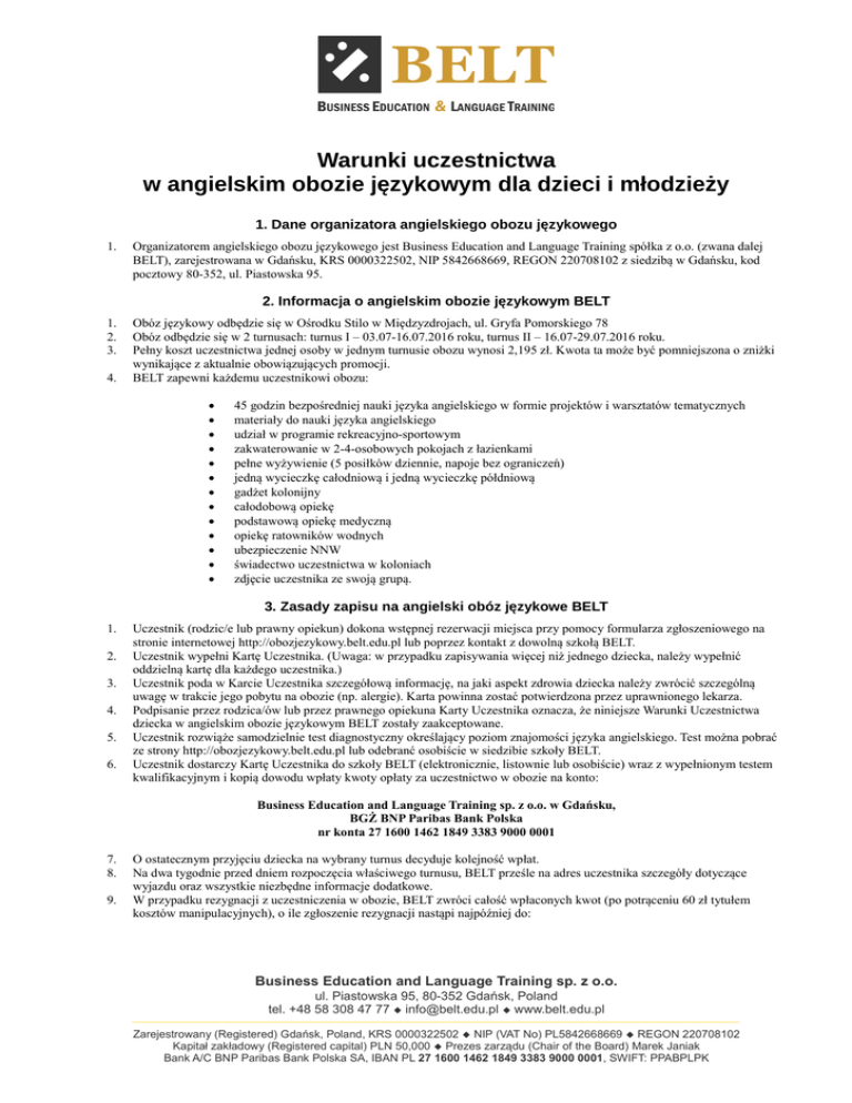 Warunki uczestnictwa w angielskim obozie językowym dla dzieci i młodzieży 1. Dane organizatora angielskiego obozu językowego 1. Organizatorem angielskiego obozu językowego jest Business Education and Language Training spółka z o.o. (zwana dalej BELT), zarejestrowana w Gdańsku, KRS 0000322502, NIP 5842668669, REGON 220708102 z siedzibą w Gdańsku, kod pocztowy 80-352, ul. Piastowska 95. 2. Informacja o angielskim obozie językowym BELT 1. 2. 3. 4. Obóz językowy odbędzie się w Ośrodku Stilo w Międzyzdrojach, ul. Gryfa Pomorskiego 78 Obóz odbędzie się w 2 turnusach: turnus I – 03.07-16.07.2016 roku, turnus II – 16.07-29.07.2016 roku. Pełny koszt uczestnictwa jednej osoby w jednym turnusie obozu wynosi 2,195 zł. Kwota ta może być pomniejszona o zniżki wynikające z aktualnie obowiązujących promocji. BELT zapewni każdemu uczestnikowi obozu: 45 godzin bezpośredniej nauki języka angielskiego w formie projektów i warsztatów tematycznych materiały do nauki języka angielskiego udział w programie rekreacyjno-sportowym zakwaterowanie w 2-4-osobowych pokojach z łazienkami pełne wyżywienie (5 posiłków dziennie, napoje bez ograniczeń) jedną wycieczkę całodniową i jedną wycieczkę półdniową gadżet kolonijny całodobową opiekę podstawową opiekę medyczną opiekę ratowników wodnych ubezpieczenie NNW świadectwo uczestnictwa w koloniach zdjęcie uczestnika ze swoją grupą. 3. Zasady zapisu na angielski obóz językowe BELT 1. 2. 3. 4. 5. 6. Uczestnik (rodzic/e lub prawny opiekun) dokona wstępnej rezerwacji miejsca przy pomocy formularza zgłoszeniowego na stronie internetowej http://obozjezykowy.belt.edu.pl lub poprzez kontakt z dowolną szkołą BELT. Uczestnik wypełni Kartę Uczestnika. (Uwaga: w przypadku zapisywania więcej niż jednego dziecka, należy wypełnić oddzielną kartę dla każdego uczestnika.) Uczestnik poda w Karcie Uczestnika szczegółową informację, na jaki aspekt zdrowia dziecka należy zwrócić szczególną uwagę w trakcie jego pobytu na obozie (np. alergie). Karta powinna zostać potwierdzona przez uprawnionego lekarza. Podpisanie przez rodzica/ów lub przez prawnego opiekuna Karty Uczestnika oznacza, że niniejsze Warunki Uczestnictwa dziecka w angielskim obozie językowym BELT zostały zaakceptowane. Uczestnik rozwiąże samodzielnie test diagnostyczny określający poziom znajomości języka angielskiego. Test można pobrać ze strony http://obozjezykowy.belt.edu.pl lub odebranć osobiście w siedzibie szkoły BELT. Uczestnik dostarczy Kartę Uczestnika do szkoły BELT (elektronicznie, listownie lub osobiście) wraz z wypełnionym testem kwalifikacyjnym i kopią dowodu wpłaty kwoty opłaty za uczestnictwo w obozie na konto: Business Education and Language Training sp. z o.o. w Gdańsku, BGŻ BNP Paribas Bank Polska nr konta 27 1600 1462 1849 3383 9000 0001 7. 8. 9. O ostatecznym przyjęciu dziecka na wybrany turnus decyduje kolejność wpłat. Na dwa tygodnie przed dniem rozpoczęcia właściwego turnusu, BELT prześle na adres uczestnika szczegóły dotyczące wyjazdu oraz wszystkie niezbędne informacje dodatkowe. W przypadku rezygnacji z uczestniczenia w obozie, BELT zwróci całość wpłaconych kwot (po potrąceniu 60 zł tytułem kosztów manipulacyjnych), o ile zgłoszenie rezygnacji nastąpi najpóźniej do: Business Education and Language Training sp. z o.o. ul. Piastowska 95, 80-352 Gdańsk, Poland tel. +48 58 308 47 77 [email protected] www.belt.edu.pl ______________________________________________________________________________________________________________________________________________________________________ Zarejestrowany (Registered) Gdańsk, Poland, KRS 0000322502 NIP (VAT No) PL5842668669 REGON 220708102 Kapitał zakładowy (Registered capital) PLN 50,000 Prezes zarządu (Chair of the Board) Marek Janiak Bank A/C BNP Paribas Bank Polska SA, IBAN PL 27 1600 1462 1849 3383 9000 0001, SWIFT: PPABPLPK 1 czerwca 2016 roku dla uczestników I turnusu, 15 czerwca 2016 roku dla uczestników II turnusu. 10. Po tych terminach zwrot wniesionych opłat będzie możliwy jedynie w przypadku, gdy na zwalniane miejsce uda się znaleźć nowego uczestnika. 11. W przypadku rezygnacji uczestnika z udziału w obozie w trakcie jego trwania, uczestnikowi nie przysługuje prawo zwrotu poniesionych kosztów 4. Koszty przejazdu 1. 2. 3. BELT zorganizuje dowóz uczestników na miejsce obzou i z powrotem z Gdańska, Szczecina i Warszawy. Dowóz jest płatny osobno. Uczestnicy obozu mogą dojechać na miejsce obozu i z powrotem we własnym zakresie. BELT zapewni dowóz uczestników na miejsce obozu i z powrotem na następujących trasach i w następujących cenach: 4. 5. Gdańsk-Międzyzdroje-Gdańsk – 150 zł w jedną stronę (autokar) min. liczba uczestników 10 Szczecin-Międzyzdroje-Szczecin – 30 zł w jedną stronę (autokar) Warszawa-Międzyzdroje-Warszawa – 130 zł w jedną stronę (pociąg + autokar) Zorganizowanie dowozu na trasie Gdańsk-Międzyzdroje-Gdańsk odbędzie się dla co najmniej 10 uczestników obozu. W przypadku mniejszej niż wymagana ilości chętnych BELT poinformuje uczestników z odpowiednim wyprzedzeniem oraz zwróci wszystkie wpłacone z tego tytułu kwoty. Istnieje możliwość zorganizowania dowozu dzieci także z innych miast. Cena takiego dowozu będzie ustalana indywidualnie. 5. Regulamin angielskiego obozu językowego BELT 1. 2. W celu zapewnienia dzieciom bezpiecznego i spokojnego wypoczynku, w trakcie trwania obzou językowego bezwzględnie obowiązuje regulamin kursu. Uczestnikowi obozu nie wolno: opuszczać ośrodka bez pozwolenia opiekuna, kąpać się w morzu bez pozwolenia opiekuna, przebywać poza swoją sypialnią po godzinie 22, spożywać alkoholu i palić tytoniu. 6. Odpowiedzialność uczestnika obozu 1. Uczestnik angielskiego obozu językowego jest zobowiązany do: 2. 3. szanowania wszelkiego sprzętu należącego do ośrodka i organizatora obozu; w przypadku spowodo