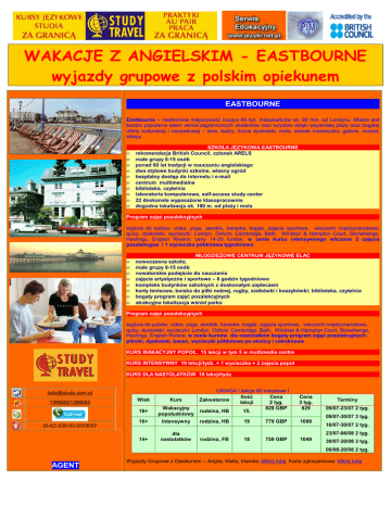 WAKACJE Z ANGIELSKIM - EASTBOURNE wyjazdy grupowe z polskim opiekunem EASTBOURNE Eastbourne – nadmorska miejscowość licząca 85 tyś. mieszkańców ok. 90 min. od Londynu. Miasto jest bardzo popularne latem wśród.zagranicznych studentów oraz turystów dzięki wspaniałej plaŜy oraz bogatej oferty kulturalnej i rozrywkowej – kina, teatry, liczne dyskoteki, molo, wesołe miasteczko, galerie, muzea, sklepy • • • • • • • • • • SZKOŁA JĘZYKOWA EASTBOURNE rekomendacja British Council, członek ARELS małe grupy 8-15 osób ponad 60 lat tradycji w nauczaniu angielskiego dwa stylowe budynki szkolne, własny ogród bezpłatny dostęp do internetu i e-mail centrum multimedialne biblioteka, czytelnia laboratoria komputerowe, self-access study center 22 doskonale wyposaŜone klasopracownie dogodna lokalizacja ok. 100 m. od plaŜy i mola Program zajęć pozalekcyjnych wyjścia do pubów, video, yoga, aerobik, karaoke, kręgle, zajęcia sportowe, wieczorki międzynarodowe, quizy, dyskoteki; wycieczki: Londyn. Oxford, Cambridge, Bath, Windsor & Hampton Court, Stonehenge, Hastings, English Riviera; ceny 14-20 funtów; w cenie kursu intensywnego wliczone 2 zajęcia pozalekcyjne i 1 wycieczka półdniowa tygodniowo • • • • • • • • MŁODZIEśOWE CENTRUM JĘZYKOWE ELAC nowoczesna szkoła; małe grupy 8-15 osób nowatorskie podejście do nauczania zajęcia artystyczne i sportowe – 8 godzin tygodniowo kompleks budynków szkolnych z doskonałym zapleczem korty tenisowe, boiska do piłki noŜnej, rugby, siatkówki i koszykówki; biblioteka, czytelnia bogaty program zajęć pozalekcyjnych atrakcyjna lokalizacja wśród parku Program zajęć pozalekcyjnych wyjścia do pubów, video, yoga, aerobik, karaoke, kręgle, zajęcia sportowe, wieczorki międzynarodowe, quizy, dyskoteki; wycieczki: Londyn. Oxford, Cambridge, Bath, Windsor & Hampton Court, Stonehenge, Hastings, English Riviera; w cenie kursów dla nastolatków bogaty program zajęć pozalekcyjnych: pikniki, dyskoteki, basen, wycieczki półdniowe po okolicy i całodniowe KURS WAKACYJNY POPOŁ. 15 lekcji w tym 5 w multimedia centre KURS INTENSYWNY 19 lekcji/tydz. + 1 wycieczka + 2 zajęcia popoł KURS DLA NASTOLATKÓW 18 lekcji/tydz. [email protected] 13966821396682 (0-42) 630-93-05/06/07 UWAGA ! lekcje 60 minutowe ! Ilość Cena Zakwaterow lekcji 2 tyg. 629 GBP rodzina, HB 15. Cena 3 tyg. 829 Wiek Kurs 16+ Wakacyjny popołudniowy 16+ Intensywny rodzina, HB 19 779 GBP 1099 14+ dla nastolatków rodzina, FB 18 759 GBP 1049 Terminy 09/07-23/07 2 tyg. 09/07-30/07 3 tyg. 16/07-30/07 2 tyg. 23/07-06/08 2 tyg. 30/07-20/08 3 tyg. 06/08-20/08 2 tyg. AGENT Wyjazdy Grupowe z Opiekunem – Anglia, Malta, Irlandia: kliknij tutaj Karta zgłoszeniowa: kliknij tutaj ANGIELSKI W ANGLII międzynarodowa szkoła w EASTBOURNE wyjazdy grupowe z polskim opiekunem cena : 629 funtów za 2 tygodnie w cenie: 15 godzin nauki zakwaterowanie, wyŜywienie, HB przelot ubezpieczenie polski opiekun w ofercie FIRST MINUTE do 250 PLN RABATU