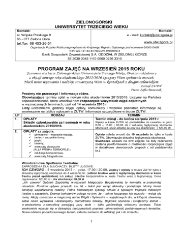 ZIELONOGÓRSKI UNIWERSYTET TRZECIEGO WIEKU Kontakt: al. Wojska Polskiego 9 65 - 077 Zielona Góra Kontakt: e - mail: [email protected] tel./fax 68 453-26-51 www.utw.zgora.pl Organizacja Pożytku Publicznego wpisana do Krajowego Rejestru Sądowego pod numerem 0000013459 NIP: 929-131-63-84 REGON: 970397673 Bank Gospodarki Żywnościowej S.A. ODDZIAŁ W ZIELONEJ GÓRZE 55 2030 0045 1110 0000 0256 3310 PROGRAM ZAJĘĆ NA WRZESIEŃ 2015 ROKU Szanowni słuchacze Zielonogórskiego Uniwersytetu Trzeciego Wieku, Drodzy wykładowcy z okazji nowego roku akademickiego 2015/1016 życzymy Wam spełnienia marzeń. Niech nowe wyzwania i nadzieje towarzyszą Wam w kontaktach z drugim człowiekiem. Zarząd ZUTW Prezes Zofia Banaszak Prosimy nie przeoczyć ! Informacje różne. Obowiązujące terminy opłat w nowym roku akademickim 2015/2016. Liczymy na Państwa odpowiedzialność, która umożliwi nam rozpoczęcie wszystkich zajęć odpłatnych w wyznaczonych terminach, czyli od 14 września 2015 r. Listy uczestników, godziny zajęć, opłaty, komunikaty i wszelkie pozostałe informacje są wywieszane na tablicy ogłoszeń w ZUTW. Informacje szczegółowe w biurze ZUTW. LP RODZAJ TERMIN 1. OPŁATY Termin minął - do końca sierpnia 2015 r. Wpłaty w kasie ZUTW od poniedziałku do czwartku w godz. Składki członkowskie za I semestr w roku 8.00 – 15.00 ( 60,00 zł) z aktualną legitymacją słuchacza. akademickim 2015/2016. Można też uiścić składkę za cały rok akademicki ( 120,00 zł). 2. OPŁATY za zajęcia: Opłaty należy wnosić do 10 września br. tylko w kasie ZUTW. Obowiązuje aktualna legitymacja słuchacza. Słuchacze wpisani na w/w zajęcia na listy rezerwowe zostaną poinformowani o możliwości rozpoczęcia zajęć w dodatkowo utworzonych grupach ( od października br.). gimnastyki – wszystkie rodzaje, taniec – wszystkie formy, języki, baseny, warsztaty plastyczne (ALLA PRIMA i TERMOPILE ), edukacja komputerowa, warsztaty fotograficzne Winobraniowe Spotkania Teatralne. ZAPROSZENIA DLA SŁUCHACZY. BILETY ULGOWE. ICH CZWORO - 5 września 2015 r., godz. 17.00 i 20.00. Zapisy i wpłaty w biurze ZUTW tylko z aktualną legitymacją słuchacza do 4 września br. (odbiór biletów wraz z legitymacją słuchacza w kasie Teatru przed spektaklem) lub zakup biletów bezpośrednio w kasie Teatru wraz z legitymacją. Cena regulowana: 120,00 zł - dla słuchaczy: 60,00 zł „Ich czworo” Gabrieli Zapolskiej w reżyserii Małgorzaty Bogajewskiej to komedia w znakomitej obsadzie. Pomimo upływu przeszło stu lat – tekst jest wciąż aktualny i podejmuje istotny temat kondycji współczesnej rodziny. Pełna komicznych sytuacji sztuka o typowym trójkącie miłosnym i walce o szczęście. Dramat bohaterów polega na tym, że – mimo łączącego ich uczucia – wciąż się ranią. Akcję osadzono w magicznej aurze Wigilii i Sylwestra – wyjątkowych dni, w których stawiamy sobie nowe wyzwania i deklarujemy diametralne zmiany. Bajkowa sceneria i świąteczny klimat – w zestawieniu z atmosferą panującą przy stole – tylko podkreślają widoczny kontrast. Tekst znakomicie wpisuje się w dzisiejszą rzeczywistość poprzez uniwersalność podejmowanych tematów. Nowa odsłona ponadczasowego tematu skłania zarówno do refleksji, jak i do śmiechu. 1 ŻYCIE JADZI WEDŁUG MNIE- 7 września 2015 r., godz. 19.00. Cena regulowana: 40,00 zł - dla słuchaczy: 20,00 zł. Zapisy i wpłaty w biurze ZUTW tylko z aktualną legitymacją słuchacza do 4 września br. ( odbiór biletów wraz z legitymacją słuchacza w kasie Teatru przed spektaklem ) lub zakup biletów bezpośrednio w kasie Teatru wraz z legitymacją. Życie Jadzi według mnie” to monodram komediowy, opowiadający historię miłosną z punktu widzenia starzejącego się mężczyzny. Magister inżynierii sanitarnej dzieli się z nami wspomnieniami z cudownych kilku lat wielkiej miłości z młodszą Jadzią, która pewnego dnia nagle odmienia jego życie. Stary kawaler nagle odkrywa w sobie amanta, chodzi na randki (na pizzę), ćwiczy powitanie przed lustrem w toalecie, przeżywa uczuciowe uniesienia, aż wreszcie opuszcza wynajmowany od wielu lat pokój, by zamieszkać z kobietą. Jest w tym wszystkim jak przybysz z innej planety, który pojawił się w typowej polskiej rodzinie. Nie unika głębokich egzystencjalnych przemyśleń, które go dręczą i zmieniają. Odbiór biletów wraz z legitymacja słuchacza w kasie Teatru przed spektaklem. ZAPOWIEDZI Uroczysta XXIV Inauguracja Roku Akademickiego 2015/2016 Zielonogórskiego Uniwersytetu Trzeciego Wieku odbędzie się 13 października 2015 r. w Auli Uniwersytetu Zielonogórskiego przy ul. Podgórnej 50. Rozpoczęcie godz. 11.00. Zaproszenia do odbioru od 1 października w ZUTW. Uwaga ! W tym dniu nie ma żadnych zajęć dla słuchaczy w siedzibie Uniwersytetu. Uwaga ! Wykaz dni wolnych od zajęć oraz świat na tablicy ogłoszeń w ZUTW. prosimy o odnotowanie. PROŚBA DO SŁUCHACZY. Jeśli ktoś z Państwa zachował w swoich zbiorach nasze wydawnictwo INSPIRACJE: z roku 2007 /Numery: 1,2,3,4/ oraz z 2009/Nr1,2/ prosimy o ich przekazanie na rzecz ZUTW w celu skompletowania wszystkich numerów. WYKŁADY, SEMINARIA, KONFERENCJE, SPOTKANIA Z CIEKAWYMI LUDŹMI, WYSTAWY, KONCERTY, SPOTKANIA MUZYCZNE, TEATRALNE, SPOTKANIA KLUBOWE, WARSZTATY, WYJAZDY EDUKACYJNE, ZDROWOTNE, PRELEKCJE... GODZINA DZIEŃ RODZAJ TEMAT ZAJĘĆ PROWADZĄCY MIEJSCE ZAJĘĆ wtorek 1.09.2015 wystawa czynna od 1 września do 31 13.00 uroczystości z okazji 76.rocznicy wybuchu II wojny światowej ZAPROSZENIE Prezydenta Miasta na uroczystości z okazji 76.rocznicy wybuchu II wojny światowej i Dnia Weterana. w godz. otwarcia biblioteki wystawa fotograficzna Cykl: PASJE NASZYCH CZYTELNIKÓW. Detale zielonogórskie – wystawa fotograficzna Ewy Kwaśniewicz. WYCIECZKA EDUKACYJNA czwartek 3.09.2015 Plac Bohaterów Zielona Góra Ewa Kwaśniewicz słuchaczka Zielonogórskiego Uniwersytetu Trzeciego Wieku. WiMBP Filia nr 4,