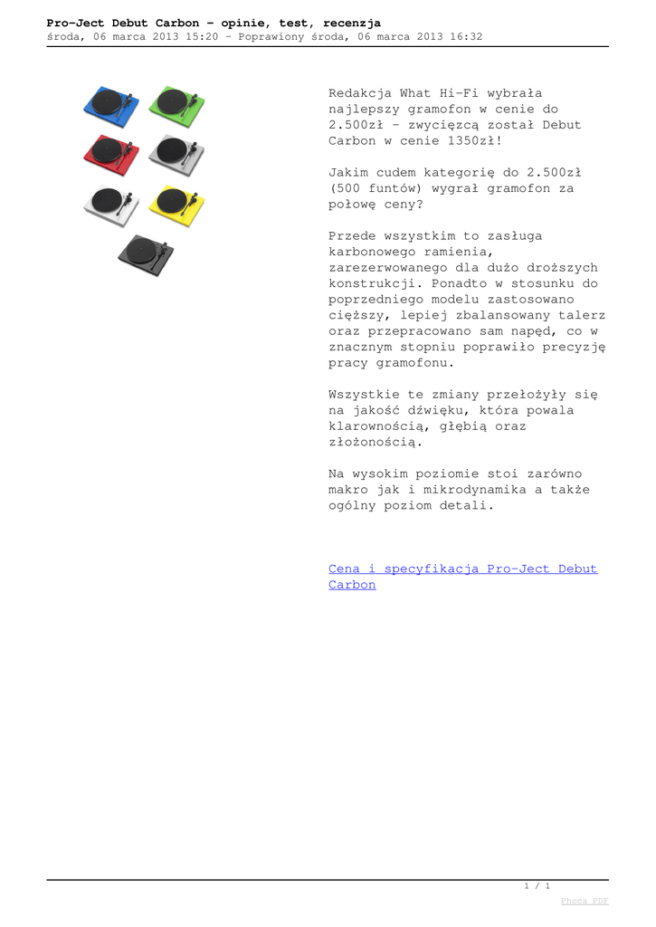 Pro-Ject Debut Carbon - opinie, test, recenzja środa, 06 marca 2013 15:20 - Poprawiony środa, 06 marca 2013 16:32 Redakcja What Hi-Fi wybrała najlepszy gramofon w cenie do 2.500zł - zwycięzcą został Debut Carbon w cenie 1350zł! Jakim cudem kategorię do 2.500zł (500 funtów) wygrał gramofon za połowę ceny? Przede wszystkim to zasługa karbonowego ramienia, zarezerwowanego dla dużo droższych konstrukcji. Ponadto w stosunku do poprzedniego modelu zastosowano cięższy, lepiej zbalansowany talerz oraz przepracowano sam napęd, co w znacznym stopniu poprawiło precyzję pracy gramofonu. Wszystkie te zmiany przełożyły się na jakość dźwięku, która powala klarownością, głębią oraz złożonością. Na wysokim poziomie stoi zarówno makro jak i mikrodynamika a także ogólny poziom detali. Cena i specyfikacja Pro-Ject Debut Carbon 1 / 1 Phoca PDF