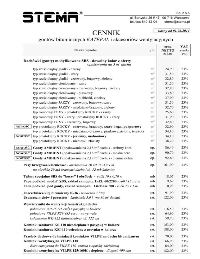 Sp. z o.o. R ul. Bartycka 26 # 47, 00-716 Warszawa tel./fax: 840-32-04 [email protected] waŜny od 01.06.2014 CENNIK gontów bitumicznych KATEPAL i akcesoriów wentylacyjnych Nazwa wyrobu j.m. cena NETTO za j.m. VAT stawka (%) Dachówki (gonty) modyfikowane SBS - dowolny kolor z oferty opakowania na 3 m2 dachu typ sześciokątny gładki - czarny typ sześciokątny gładki - szary typ sześciokątny gładki - czerwony, brązowy, zielony typ sześciokątny cieniowany - szary typ sześciokątny cieniowany - czerwony, brązowy, zielony typ sześciokątny cieniowany - piaskowy typ sześciokątny cieniowany - niebieski, złocisty typ sześciokątny JAZZY - czerwony, brązowy, szary typ sześciokątny JAZZY - miedziano-brązowy, zielony typ rombowy FOXY i prostokątny ROCKY - czarny typ rombowy FOXY - szary i prostokątny ROCKY - szary typ rombowy FOXY - czerwony, brązowy NOWOŚĆ typ prostokątny ROCKY - czerwony, brązowy, szaro-brąz., purpurowy typ prostokątny ROCKY - miedziano-brązowy, piaskowy,zielony, terakota NOWOŚĆ typ prostokątny ROCKY - jesienny, mahoniowy typ prostokątny ROCKY - niebieski, złocisty m2 m2 m2 m2 m2 m2 m2 m2 m2 m2 m2 m2 m2 m2 m2 m2 24,90 31,50 32,80 31,50 32,80 33,80 37,90 31,50 32,70 25,60 31,90 32,80 32,90 34,10 34,10 38,20 23% 23% 23% 23% 23% 23% 23% 23% 23% 23% 23% 23% 23% 23% 23% 23% NOWOŚĆ Gonty AMBIENT (opakowanie na 2,18 m2 dachu) - srebrny koral op. 0,00 86,40 23% NOWOŚĆ Gonty AMBIENT (opakowanie na 2,18 m2 dachu) - mokka nero op. 90,70 23% op. 92,60 23% Pasy brzegowo-kalenicowe - opakowania 20 szt. 0,25 x 1 m na obróbkę 20 mb krawędzi dachu lub 12 mb kalenicy op. 161,90 23% Taśmy specjalne SBS do "koszy" i obróbek - rolki 10 x 0,70 m Papa podkład. modyf. SBS, zakład samoprz. U-EL 60/2200 - rolki 15 x 1 m Folia podkład. pod gonty, zakład samoprz. LiteBase 500 - rolki 25 x 1 m mb mb mb 18,07 9,69 10,98 23% 23% 23% Uszczelniacz/klej bitumiczny K-36 - wiaderka 3 litry Usuwacz mchów i porostów - kanisterki 5,0 l (na 80 m2 dachu) szt. szt. 91,90 122,00 23% 23% Wywietrzniki do wentylacji konstrukcji dachu połaciowe WP-75 (75 cm2) z posypką w kolorze połaciowe VILPE KTV (85 cm2) - nowy wzór kalenicowe WK-122 (uniwersalne) dł. 122 cm szt. szt. szt. 116,50 64,90 59,70 23% 23% 23% Kominki sanitarne KS-110 nieocieplone z posypką w kolorze Kominki sanitarne KSI-110 ocieplone z posypką w kolorze szt. szt. 153,00 188,00 23% 23% Przeloty dachowe do instalacji kominków VILPE na dachu bitumicznym Kominki wentylacyjne VILPE 110 Rura elastyczna do VILPE 110 czarna z opaską zaciskową Kominki wentylacyjne VILPE 125/160K ocieplone - długość 400 mm szt. szt. szt. szt. 70,00 66,90 64,00 182,00 23% 23% 23% 23% NOWOŚĆ 2 Gonty AMBIENT (opakowanie na 2,18 m dachu) - ciemna ochra