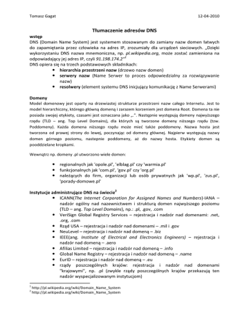 Tomasz Gagat 12-04-2010 Tłumaczenie adresów DNS wstęp DNS (Domain Name System) jest systemem stosowanym do zamiany nazw domen łatwych do zapamiętania przez człowieka na adres IP, zrozumiały dla urządzeń sieciowych. „Dzięki wykorzystaniu DNS nazwa mnemoniczna, np. pl.wikipedia.org, może zostać zamieniona na odpowiadający jej adres IP, czyli 91.198.174.2”1 DNS opiera się na trzech podstawowych składnikach: hierarchia przestrzeni nazw (drzewo nazw domen) serwery nazw (Name Serwer to proces odpowiedzialny za rozwiązywanie nazw) resolwery (element systemu DNS inicjujący komunikację z Name Serwerami) Domeny Model domenowy jest oparty na drzewiastej strukturze przestrzeni nazw całego Internetu. Jest to model hierarchiczny, którego główną domeną i zarazem korzeniem jest domena Root. Domena ta nie posiada swojej etykiety, czasami jest oznaczana jako „.”. Następnie występują domeny najwyższego rzędu (TLD – ang. Top Level Domains), dla których są tworzone domeny niższego rzędu (tzw. Poddomeny). Każda domena niższego rzędu może mieć także poddomeny. Nazwa hosta jest tworzona od prawej strony do lewej, poczynając od domeny głównej. Najpierw występują nazwy domen górnego poziomu, nastepnie poddomeny, aż do nazwy hosta. Etykiety domen są pooddzielane kropkami. Wewnątrz np. domeny .pl utworzono wiele domen: regionalnych jak 'opole.pl', 'elblag.pl' czy 'warmia.pl' funkcjonalnych jak 'com.pl', 'gov.pl' czy 'org.pl' należących do firm, organizacji lub osób prywatnych jak 'wp.pl', 'zus.pl', 'porady-domowe.pl' Instytucje administrujące DNS na świecie2 ICANN(The Internet Corporation for Assigned Names and Numbers)-IANA – nadzór ogólny nad nazewnictwem i strukturą domen najwyższego poziomu (TLD – ang. Top Level Domains), np.: .pl, .gov, .com VeriSign Global Registry Services – rejestracja i nadzór nad domenami: .net, .org, .com Rząd USA – rejestracja i nadzór nad domenami – .mil i .gov NeuLevel – rejestracja i nadzór nad domeną – .biz IEEE(ang. Institute of Electrical and Electronics Engineers) – rejestracja i nadzór nad domeną – .aero Afilias Limited – rejestracja i nadzór nad domeną – .info Global Name Registry – rejestracja i nadzór nad domeną – .name EurID – rejestracja i nadzór nad domeną – .eu rządy poszczególnych krajów: rejestracja i nadzór nad domenami "krajowymi", np. .pl (zwykle rządy poszczególnych krajów przekazują ten nadzór wyspecjalizowanym instytucjom) 1 2 http://pl.wikipedia.org/wiki/Domain_Name_System http://pl.wikipedia.org/wiki/Domain_Name_System Tomasz Gagat 12-04-2010 Instytucje administrujące DNS w Polsce3 NASK (Naukowa i Akademicka Sieć Komputerowa) – nadzór nad domeną .pl jako całością, oraz obsługa rejestrowania domen: .com.pl, .biz.pl, .org.pl, .net.pl oraz kilkudziesięciu innych domen "funkcjonalnych" (łącznie z np. sex.pl) oraz części domen lokalnych, np. .waw.pl. IPPT PAN – rejestracja domeny .gov.pl; ICM (Interdyscyplinarne Centrum Modelowania Matematycznego i Komputerowego Uniwersytetu Warszawskiego) – .art.pl, .mbone.pl; Stowarzyszenie Klon/Jawor – .ngo.pl; TASK (Trójmiejska Akademicka Sieć Komputerowa) – .med.pl, .gda.pl, .gdansk.pl, .sopot.pl, .gdynia.pl; SGH (Szkoła Główna Handlowa w Warszawie) – .irc.pl; Politechnika Wrocławska – .usenet.pl. Mainseek – rejestracja i nadzór nad domeną – .co.pl Oprócz tego wiele domen typu nazwa-firmy.pl wykupiły od NASK rozmaite firmy i zarządzają tymi domenami we własnym zakresie. Strefy Każdy serwer obsługuje pewną liczbę domen, poddomen lub pojedynczą domenę w zależności od ich wielkości i możliwości obliczeniowych komputera. Obszar zarządzany przez serwer DNS jest nazywany strefą i jest to wydzielona część drzewa. Serwery Informacje na temat domen i ich adresów są przechowywane w ogólnoświatowej sieci serwerów. Serwery te tworzą wielką rozproszoną bazę danych. Na szczycie drzewiastej struktury znajdują się główne serwery (ang. root servers), których jest dokładnie 13. Serwery te są zdublowane, a ich kopie posiadają takie same adresy IP i są porozsiewane w różnych częściach świata. Dzięki skopiowaniu serwerów można łączyć się z tym, który jest najbliżej oraz zapobiega to awarii całego systemu. Root Servers obsługują domeny najwyższego poziomu (TLD – top level domains). Primary Master Server – jest to autorytatywny serwer DNS strefy, tzn. posiadają wszystkie dane dotyczące strefy, są źródłem danych dla innych serwerów. Ma prawo do wszelkich modyfikacji na plikach danych. Secondary Master Server – zapasowy serwer główny – aktualizuje dane strefy tylko przez transfer z innych serwerów DNS. Zaleca się, aby każdy serwer posiadał minimum jeden serwer pomocniczy w celu replikacji danych. Caching – każdy serwer posiada pamięć typu cache, w której przechowuje odebrane informacje w celu przyspieszenia działania w przypadku powtórzenia zapytania. Czas przechowywania danych jest określony w polu ttl (time to live), które jest dołączone do danych otrzymywanych z innych serwerów. Caching-Only Servers – Specjalny Name Server, który gromadzi dane wyłącznie z zapytań do innych serwerów. Otrzymane zapytanie od hosta przekazuje dalej, a wynik zapytania otrzymany w drodze powrotnej buforuje w celu późniejszego wykorzystania w wypadku takiego samego zapytania. Tego typu serwery warto 3 http://pl.wikipedia.org/wiki/Domain_Name_System Tomasz Gagat 12-04-2010 zastosować np. w sieci o małej przepustowości lub na komputerach, na których pracuje wielu użytkowników generujących wiele zapytań NS. Resolwer Resolver – jest to oprogramowanie pozwalające klientowi DNS komunikować się z serwerami nazw. Jest w postaci bibliotek wykorzystywanych przez aplikacje sieciowe. Jego zadaniem jest tworzenie i przesyłanie zapytania do NS oraz interpretacja odpowiedzi, a następnie przesłanie informacji do programu