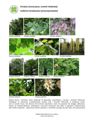 Corylus (Leszczyna, orzech laskowy) rodzina Corylaceae (Leszczynowate) Corylus avellana Corylus avellana Corylus colurna Corylus colurna Corylus avellana Corylus avellana Corylus avellana Corylus colurna Corylus colurna Corylus avellana Corylus colurna Corylus colurna Rodzaj drzew i krzewów, który obejmuje 15 gatunków, pochodzący z Europy i Ameryki Północnej. Występuje na obszarach umiarkowanych Europy, Azji i Ameryki Północnej, w podszyciu lasów. Jest to wysoki krzew, lub drzewo (2-8 metrów wysokości). Liście ma jajowate lub okrągłe, piłkowane. Kwiaty są rozdzielnopłciowe, wiatropylne. Leszczyna uprawiane jest także w ogrodach przydomowych jako roślina użytkowa - sadownicza (orzech laskowy). Z orzechów uzyskuje się olej, który ma zastosowanie Miejski Ogród Botaniczny w Zabrzu www.mob-zabrze.pl Corylus (Leszczyna, orzech laskowy) rodzina Corylaceae (Leszczynowate) w przemyśle spożywczym, farmaceutycznym, farbiarskim oraz perfumeryjnym. Jest także traktowana jako roślina ozdobna - odmiany leszczyny o barwnych liściach uprawiane są w parkach i ogrodach. Znana od wieków i w kulturach wielu narodów wykorzystywana do różnych celów, nawet magicznych. Była uważana za drzewo mądrości, a jej gałęzie obsypane orzechami uważano za symbol obfitości, (wetknięta w drzwi domu była dobrą wróżbą na następny rok). Posadzona obok domu miała bronić ludzi przed ukąszeniami, złymi duchami i wampirami, a zwierzęta domowe przed czarami. Orzechy laskowe były symbolem płodności, miłości i małżeństwa, ale także znakiem mądrości, stałości i cierpliwości. Leszczynowych gałązek używano jako różdżek do odnajdywania żył wody, a także złota i skarbów. W średniowieczu leszczynowa różdżka służyła sędziom do wykrywania złodziei i morderców. Gatunki flory Polski: 1. Corylus maxima Mill. (Leszczyna południowa, l. długookrywowa) – gatunek uprawiany 2. Corylus avellana L. (Leszczyna pospolita) 3. Corylus colurna L. (Leszczyna turecka, l. drzewiasta) – gatunek uprawiany Corylus avellana L. - leszczyna pospolita - występuje w stanie dzikim w całej Europie i Azji Mniejszej po Kaukaz. W Polsce pospolita - rośnie do ok. 1300 m n.p.m. Drzewa lub wysokie krzewy dorastające do 5 m. Wydaje liczne odrośla od pnia, tworząc duży, wielopienny krzew. Gałęzie ma wzniesione, tworzą one szeroką i gęstą koronę. Kora gładka, popielata z poziomymi, korkowatymi kreskami. Młode pędy są w kolorze czerwonobrunatnym, szczeciniasto owłosione. Zarówno pędy jak i liście są miękko owłosione (młode liście obustronnie owłosione, a w miarę starzenia z wierzchu robią się matowozielone). Blaszki liściowe skrętoległe, pojedyncze są szerokoowalne (do okrągłej) o długości do 10 cm, lekko klapowane, na szczycie zaostrzone, u nasady lekko sercowate, brzegi podwójnie piłkowane. Ogonek liściowy jest krótki i prawie niewidoczny. Liście rozwijają się wcześnie na wiosnę, a jesienią przebarwiają się na żółto i opadają na zimę. Roślina jednopienna, kwiaty są rozdzielnopłciowe i wiatropylne. Kwitnie wczesną wiosną (II-III) przed rozwojem liści. Kwiaty męskie pylą bardzo obficie na żółto, są zebrane w bazie, zgrupowane po 2-4. Kwiaty żeńskie ukryte w pączkach, z których na wiosnę wystają jedynie znamiona słupków. Owocem jest jednonasienny, bezbielmowy orzech wystający z listkowatych okryw. Osadzone są one po 1-3 i potocznie nazywane orzechami laskowymi. Zdrewniała owocnia (skorupka) ma jasnobrązowy kolor i zmienny kształt, w zależności od odmiany. Owoce dojrzewają od września do października, są oleiste i bardzo pożywne. W uprawie spotyka się szereg odmian i mieszańców uprawnych, zarówno ozdobnych jak i sadowniczych. Jako roślina sadownicza w Polsce jest bez znaczenia, wykorzystuje się ją głównie w uprawach amatorskich oraz doświadczalnych. Na świecie szlachetne odmiany leszczyny uprawia się głównie w basenie Morza Śródziemnego. Największym producentem jest Turcja, poza tym występują duże hodowle w Hiszpanii, Włoszech, na Półwyspie Bałkańskim oraz w Stanach Zjednoczonych (przede wszystkim Kalifornia). Owoce mają zastosowanie w przemyśle spożywczym, farmaceutycznym, farbiarskim oraz perfumeryjnym. Często wykorzystywane są, niektóre odmiany ozdobne, w architekturze zieleni. Znaczenie dekoracyjne mają u leszczyn bazie kwiatów męskich, pojawiające się bardzo wczesna wiosną, pokrój niektórych odmian. oraz odmiany o barwnych liściach. Drewno jest miękkie i nietrwałe (używane bywa jako węgiel rysunkowy). Leszczynowe pręty, dzięki swojej giętkości, używane były na wędki, bicze, laski oraz faszynę. Gatunek bardzo tolerancyjny, szczególnie w stosunku do światła. Dobrze rośnie nawet w cieniu. Najlepiej rośnie na glebach żyznych i wilgotnych (na jałowych i suchych słabiej rośnie i gorzej owocuje). Jest dość wytrzymały na zanieczyszczenia powietrza. Rozmnaża się przez wysiew nasion (orzechów), a także wegetatywnie przez odkłady i kopczykowanie. Miejski Ogród Botaniczny w Zabrzu www.mob-zabrze.pl Corylus (Leszczyna, orzech laskowy) rodzina Corylaceae (Leszczynowate) Corylus colurna - leszczyna turecka. Ojczyzną leszczyny tureckiej są lasy Europy południowo-wschodniej i Azji Mniejszej. Do Europy Środkowej sprowadzona w końcu XVI wieku. Jest to drzewo wolno rosnące, dorastające do 25 m, z pniem rozgałęziającym się nisko nad ziemią na kilka pędów. Wytwarza stożkowatą koronę, rozgałęzioną od dołu. Ma regularny pokrój, o strzelistym pniu - sięgającym do samego wierzchołka. Jej całoroczną ozdobą jest kora - szara i nieregularnie spękana. Liście są gładkie i prawie nagie. W porównaniu z leszczyną pospolitą są większe, lekko klapowane, z bardziej postrzępionym brzegiem i dłuższym ogonkiem liściowym. Jesienią przebarwiają na ciepły żółty kolor i opadają na zimę. Roślina samopylna i wiatropylna. Kw