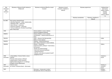 Rok (miesiące) data wernisarz y Wystawy w Muzeum Sztuki Ludowej w Otrębusach Wystawy ze zbiorów MSLwO w innych muzeach Wystawy w innych muzeach z zabytkami z MSLwO Wystawy zagraniczne Wystawy samodzielne Do 1990 1990 Pięć wystaw indywidualnych -Stanisław Majewski – rzeźby i płaskorzeźby -Władysław Rząb – malarstwo -Maria Wiśnios – malarstwo -Katarzyna Gawłowa – malarstwo -Twórcy (rzeźbiarze) z Ośrodka Paszyńskiego (pow. Nowy Sącz) 1990/91 1991/92 1993/95 1995/96 1996 (wrzesień) 1997 (wrzesień) 1997 „Dzieje biblijne i Historia Polski w sztuce ludowej” Pierwsza stała wystawa w MSLwO zorganizowana z okazji wręczenia Ogólnopolskiej Nagrody im. O. Kolberga Otrębusy, Karolin (Mazowsze) Historia i wiara (w ramach I Festiwalu Nauki – Warszawa) Motywy biblijne w sztuce ludowej Muzeum Okręgowe Białystok Motywy biblijne w sztuce ludowej Ciechanowiec – Muzeum Rolnictwa im. K. Kluka Sierpc – Muzeum Wsi Mazowieckiej Biblija w sztuce ludowej Otrębusy – Kościół (drewniany) Stary i Nowy Testament w sztuce ludowej Otwock – Celestynów Studencka Galeria „Miejsce” i Dom Kultury Cykl wystaw: -Rzeźby Jana Markowskiego -Twórczość Katarzyny Gawłowej -„Zoolog drewniany” -„Wiosna, a jak wiosna to ptaszki i koniki” -„Bezgłowy Herod” Warszawa – Uniwersytet „Kurban” Obrzędowość ofiarna w Macedonii Wydawnictwa, zaproszenia, plakaty, foldery, katalogi, artykuły, audycje radiowe i TV Wystawy z zabytkami z MSLwO Folder foldery Artykuły w prasie Katalog p.t. „Historia i wiara” Katalog – „Kurban” – 1998 szkice z obrzędowości ofiarnej w Macedonii Katalog p.t. „Statek w Biblii” Gdańsk – Centralne Muzeum Morskie „Statek w Biblii” „Ptaki i ptaszki w naturze, sztuce i tradycji ludowej” (w ramach II Festiwalu Nauki – Warszawa) 1998/99 Komplet 24 pocztówek, artykuły prasowe Ciechanowiec Muzeum Roznictwa „Zwyczaje Bożego Narodzenia” 1999 Celestynów – Otwock, Galeria „Miejsce” Dom Kultury „Pasja drewniana” Folder „Pasja Jezu Krysta” Wielkanoc w sztuce ludowej i grafice „Judaica w sztuce ludowej” (w ramach III Festiwalu Nauki – Warszawa) Malarstwo Heleny Zelechower i Miry Zelechower – Aleksium (o tematyce żydowskiej) Malarstwo Wisny Lipszyc „Album żydowski” Wycinanki żydowskie Moniki Krajewskiej 2000 Artykuły prasowe Artykuły prasowe Artykuły prasowe Artykuły prasowe Katalog Radziejowice – Dom Pracy Twórczej MKiDN „Pasja Jezu Krysta” „Koń etnograficzny – Koń filatelistyczny” czyli wizerunek konia w sztuce ludowej i na znaczkach pocztowych Artykuły W tym artykuł w czasopiśmie filatelistycznym – Melbourne, Australia Ciechanowiec – Muzeum Rolnictwa „Koń w sztuce ludowej” Witebsk, Białoruś Muzeum M. Chaqalla „Judaica w polskiej sztuce ludowej” Szczecin – Muzeum Narodowe Plakat Folder Artykuł w prasie białoruskiej Plakat, „Judaica w sztuce ludowej” zaproszenie Katalog, artykuły prasowe Zaproszenie, plakat Katalog p.t. „Barwy Śląska” Zaproszenie folder „Barwy Śląska” Malarstwo śląskie z kolekcji S. Trefonia (w ramach IV Festiwalu Nauki – Warszawa) Malarstwo na szkle Anny Stopk-Słowińskiej (w ramach IV Festiwalu Nauki) 2001 Węgorzewo – Muzeum Kultury Ludowej „Boże Narodzenie w sztuce ludowej” Wycinanki Susan Throckmoyton – USA Inspirowane wycinankami polskimi Dwa katalogi dwujęzyczne polskoangielskie Folder Wycinanki żydowskie Piotra Sztuczyńskiego Wystawa malarstwa i grafiki Valerego Biełego z Witebska (Białoruś) Ludowa rzeźba sakralna w krajobrazie nadpilcza (rzeźby i fotografie Piotra Wypycha) 2001/02 2001/02 2002 Zaproszenie – folder folder Piotrków Trybunalski – Muzeum Okręgowe Bełchatów – Muzeum Tomaszów Mazowiecki – Muzeum Opoczno – Muzeum Regionalne „Ludowa rzeźba sakralna w krajobrazie nadpilcza” Radziejowice, Dom Pracy Twórczej „Boże Narodzenie” Ołtarzew – wyższe seminarium duchowne ks. Pallotynów „Pasja Chrystusa w malarstwie i rzeźbie ludowej" Wrocław – Muzeum Narodowe (Dział Etnograficzny) Polska wycinanka ludowa „Koń w sztuce ludowej” Barczewo – Galeria Sztuki Zaproszenie Foldery artykuły Katalog Artykuły prasowe Folder Film Kielce – Muzeum Wsi Kieleckiej „Wierzba bije nie zabije” – sztuka ludowa okresu wielkanocnego Folder Folder Katalog Plakaty, Wschodnia Serbia Krajobraz, Budownictwo, ludzie w fotografii Stanko Kostića z Belgradu Węgorzewo – Muzeum Kultury Ludowej Olsztynek – Muzeum Budownictwa Ludowej Iława – Ośrodek Kultury Susz – Ośrodej Kultury Nidzica – Muzeum Zamek Ciechanowiec Muzeum Rolnictwa Wystawa rzeźb Jana Markowskiego Fantastyczna fauna i flora w sztuce ludowej (wspólnie z ROK – Bielsko Biała Węgorzewo – Muzeum Kultury Ludowej „Czyj ty jesteś” (dzieje biblijne – tematy żydowskie) 2003 „Wreszcie z Tobą razem Polsko” Malarstwo i grafika, wycinanki, rzeźby w węglu Franciszka Kurzej z Katowic Warszawa – Muzeum Niepodległości Wola Zręczycka k/ Bochni – Galeria Wystawa prac Franciszka Kurzej „Wreszcie z Tobą razem Polsko” Sierpc – Muzeum Wsi mazowieckiej „Koń, jaki jest, każdy widzi” „Patroni Europy w sztuce” (wespół z Regionalnym Ośrodkiem Kulturalnym Bielsko-Biała zaproszenia Warszawa Galeria Studio PKiN „w Boże Narodzenie” Kielce – Muzeum Wsi Kieleckiej „Po górach i smugach wędrując – sztuka ludowa regionu Świętokrzyskiego Katalog w wersji polskiej i serbskiej Artykuły w prasie zagranicznej Folder Plakat Katalog Nagrania TVPolonia Folder zaproszenie Plakat – zaproszenie Katalog Artykuły Plakat – zaproszenie Katalog Artykuły Katalog Plakat Katalog Wystawa malarstwa i grafiki „Z miasta Ev” Wł. Lucińskiego z Rudy Śląskiej Plakat, folder/zaprosze nie Plakat, folder/zaprosze nie Katalog Wizerunki Madonn z krajów europejskich w wycinankach Franciszka Kurzej z Katowic Wystawa „Tkaniny artystyczne – Gobeliny” z Miejskiego Centrum K