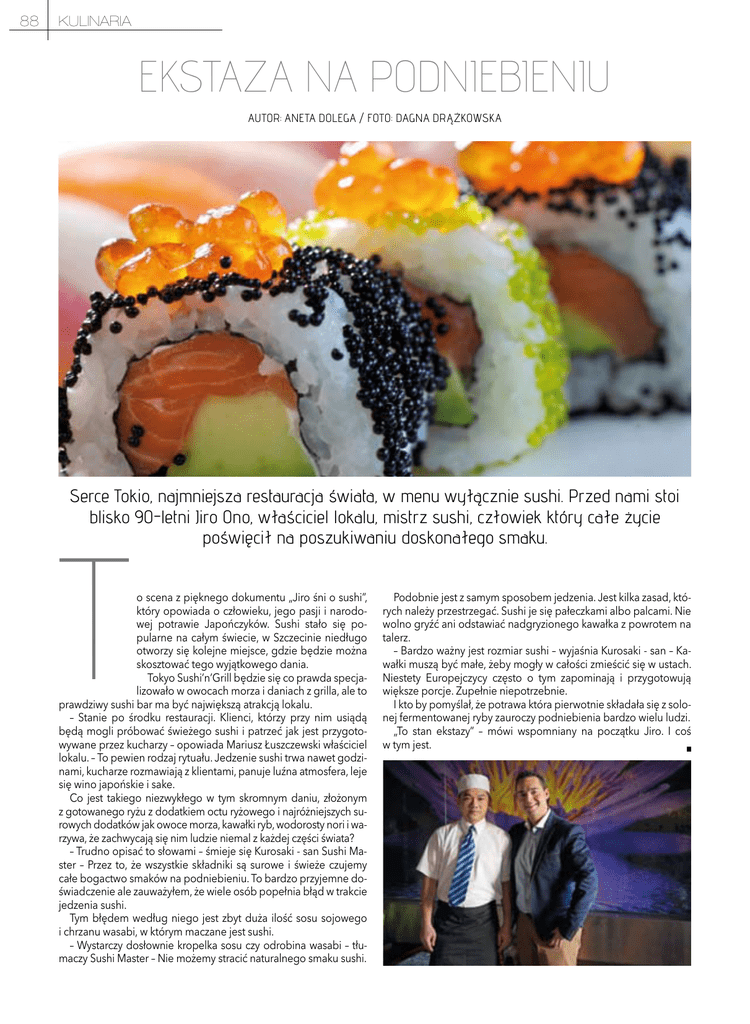 88 kulinaria Ekstaza na podniebieniu Autor: Aneta Dolega / foto: Dagna Drążkowska Serce Tokio, najmniejsza restauracja świata, w menu wyłącznie sushi. Przed nami stoi blisko 90-letni Jiro Ono, właściciel lokalu, mistrz sushi, człowiek który całe życie poświęcił na poszukiwaniu doskonałego smaku. t o scena z pięknego dokumentu „Jiro śni o sushi”, który opowiada o człowieku, jego pasji i narodowej potrawie Japończyków. Sushi stało się popularne na całym świecie, w Szczecinie niedługo otworzy się kolejne miejsce, gdzie będzie można skosztować tego wyjątkowego dania. Tokyo Sushi’n’Grill będzie się co prawda specjalizowało w owocach morza i daniach z grilla, ale to prawdziwy sushi bar ma być największą atrakcją lokalu. – Stanie po środku restauracji. Klienci, którzy przy nim usiądą będą mogli próbować świeżego sushi i patrzeć jak jest przygotowywane przez kucharzy – opowiada Mariusz Łuszczewski właściciel lokalu. – To pewien rodzaj rytuału. Jedzenie sushi trwa nawet godzinami, kucharze rozmawiają z klientami, panuje luźna atmosfera, leje się wino japońskie i sake. Co jest takiego niezwykłego w tym skromnym daniu, złożonym z gotowanego ryżu z dodatkiem octu ryżowego i najróżniejszych surowych dodatków jak owoce morza, kawałki ryb, wodorosty nori i warzywa, że zachwycają się nim ludzie niemal z każdej części świata? – Trudno opisać to słowami – śmieje się Kurosaki - san Sushi Master – Przez to, że wszystkie składniki są surowe i świeże czujemy całe bogactwo smaków na podniebieniu. To bardzo przyjemne doświadczenie ale zauważyłem, że wiele osób popełnia błąd w trakcie jedzenia sushi. Tym błędem według niego jest zbyt duża ilość sosu sojowego i chrzanu wasabi, w którym maczane jest sushi. – Wystarczy dosłownie kropelka sosu czy odrobina wasabi – tłumaczy Sushi Master – Nie możemy stracić naturalnego smaku sushi. Podobnie jest z samym sposobem jedzenia. Jest kilka zasad, których należy przestrzegać. Sushi je się pałeczkami albo palcami. Nie wolno gryźć ani odstawiać nadgryzionego kawałka z powrotem na talerz. – Bardzo ważny jest rozmiar sushi – wyjaśnia Kurosaki - san – Kawałki muszą być małe, żeby mogły w całości zmieścić się w ustach. Niestety Europejczycy często o tym zapominają i przygotowują większe porcje. Zupełnie niepotrzebnie. I kto by pomyślał, że potrawa która pierwotnie składała się z solonej fermentowanej ryby zauroczy podniebienia bardzo wielu ludzi. „To stan ekstazy” – mówi wspomniany na początku Jiro. I coś w tym jest.