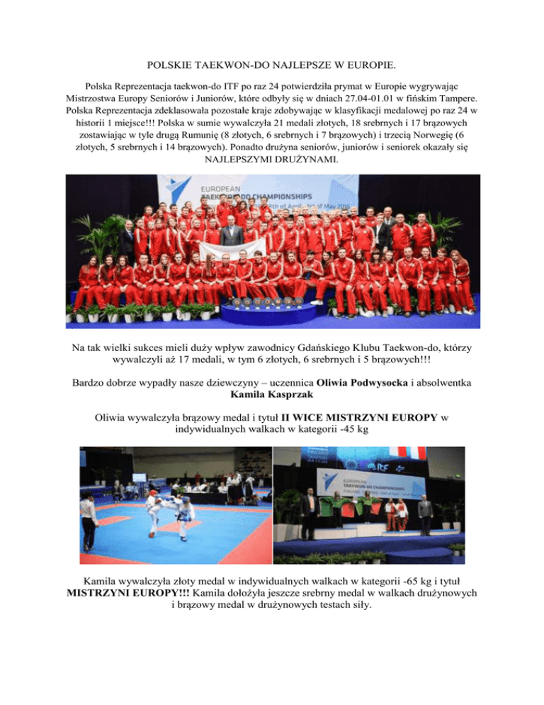 POLSKIE TAEKWON-DO NAJLEPSZE W EUROPIE. Polska Reprezentacja taekwon-do ITF po raz 24 potwierdziła prymat w Europie wygrywając Mistrzostwa Europy Seniorów i Juniorów, które odbyły się w dniach 27.04-01.01 w fińskim Tampere. Polska Reprezentacja zdeklasowała pozostałe kraje zdobywając w klasyfikacji medalowej po raz 24 w historii 1 miejsce!!! Polska w sumie wywalczyła 21 medali złotych, 18 srebrnych i 17 brązowych zostawiając w tyle drugą Rumunię (8 złotych, 6 srebrnych i 7 brązowych) i trzecią Norwegię (6 złotych, 5 srebrnych i 14 brązowych). Ponadto drużyna seniorów, juniorów i seniorek okazały się NAJLEPSZYMI DRUŻYNAMI. Na tak wielki sukces mieli duży wpływ zawodnicy Gdańskiego Klubu Taekwon-do, którzy wywalczyli aż 17 medali, w tym 6 złotych, 6 srebrnych i 5 brązowych!!! Bardzo dobrze wypadły nasze dziewczyny – uczennica Oliwia Podwysocka i absolwentka Kamila Kasprzak Oliwia wywalczyła brązowy medal i tytuł II WICE MISTRZYNI EUROPY w indywidualnych walkach w kategorii -45 kg Kamila wywalczyła złoty medal w indywidualnych walkach w kategorii -65 kg i tytuł MISTRZYNI EUROPY!!! Kamila dołożyła jeszcze srebrny medal w walkach drużynowych i brązowy medal w drużynowych testach siły. Od 2016 roku Polską Reprezentację Mężczyzn wraz z Łukaszem Stawarzem (LKT Legnica) prowadzi trener GKT Gdańsk i nauczyciel Gimnazjum 25 - Marcin Wołosz!!!
