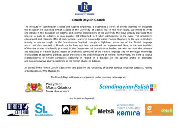 Finnish Days in Gdańsk The Institute of Scandinavian Studies and Applied Linguistics is organizing a series of events intended to invigorate the discussion on launching Finnish Studies at the University of Gdansk (UG) in the near future. We intend to invite and include in the discussion all external and internal stakeholders of the university that have already expressed their interest in such an initiative or may possibly get interested in it when participating in the event. The university’s educational and research offer already includes scattered knowledge about Finnish literature or life and institutions (mainly in courses taught in the Scandinavian Studies), though a high-level instruction of the Finnish language and a curriculum devoted to Finnish studies have not been developed nor implemented. Now, in the best tradition of the area studies scholarship practiced in the Department of Scandinavian Studies, we wish to show the potential and relevance of Finnish Studies based on proficient command of the Finnish language and on thorough knowledge of all aspects of economic, political, social and cultural life and institutions of Finland. Furthermore, we want to involve representatives of Finnish companies operating in Poland in a dialogue on the optimal profile of graduates and on an innovative study programme of the Finnish Studies in Gdańsk. All events of the Finnish Days in Gdansk will take place on the University of Gdansk campus in Gdansk Wrzeszcz, Faculty of Languages, ul. Wita Stwosza 55. The Finnish Days in Gdansk are organized under honorary patronage of: and in partnership with: Detailed programme Monday 31.03 Finnish Studies Perspectives (1) Coordination: Hieronim Chojnacki Tuesday 01.04. Finnish Studies Perspectives (2) Coordination: Katarzyna Wojan Inauguration of the Finnish Days (Hall 1.48) Guests from Poznan University and Warsaw University present their study programmes of Finnish philology (in Polish, Hall 2.7) 10:00 Welcome speeches: Rector of the University of Gdansk Dean of the Faculty of Languages 10:15 - Consul General of Finland in Gdańsk 10.30-11.00 Krista Heikkilä (CIMO): Finnish studies around the world 11:00-11.30 Representatives of the City Government and the Marshal Office of the Pomeranian Region outline their cooperation with Finland (TBC) 11.30-12.00 debate: “Finland in Poland – background and perspectives ” with Consul General of Finland in Gdańsk, Reps. of the city authorities, local government, University leadership, Dean, CIMO. All invited guests will be asked to participate actively. 10.00-10.30 Bolesław Mrozewicz (University of Poznań) 10.30-11.00 Anna Buncler (University of Warsaw) 11.00-11.15 Katarzyna Wojan (University of Gdańsk) 11.15-11.30 Leena Laajo-Szańkowska (Finnish teacher and translator) 11.30-12.00 Exchange of experience and debate on the optimal profile of graduates of the planned Finnish studies in Gdańsk (1) 12.00-13.00 Break 12.00-13.00 Break 13.00-14.30 Kaisa Kurikka’s lecture: "Scenes of Contemporary Literature in Finland 2" (in English) 13.00-16.00 Series of lectures on literature in Finland. 14.30-16.00 Finnish film with intro. of Kaisa Kurikka Wednesday 02.04. Literature Coordination: Hanna DymelTrzebiatowska “Tove Jansson 100 years: interpretations” (Hall 1.43) 10.00-10.30 Boel Westin: “The Lighthouse Keeper. Tove Jansson. Life, Art, Words” 10.30-11.00 Kaisa Kurikka: "From Stamps to Dancing Moomins: Celebrating Tove Jansson" 11.00-11.15 Q&A session 11.15-13.00 Break Hall 2.7 13.00-13.30 Michał Rogoż: “Tove Jansson’s Moomins in the Polish Media Space” 13.30-14.00 Hanna Dymel Trzebiatowska: ”The Moomins – Never-ending Readings” 14.00-14.15 Magdalena Czekanowska 14.15-14.45 Discussion 14.45 A very special chapter Teatr aUGust, University of Gdańsk Thursday 03.04. Business and Society Coordination: Kazimierz Musiał Friday 04.04. Culture Coordination: Maria Sibińska Leading theme: How to support Polish-Finnish relations in a knowledge and science based economy? (Hall 1.46) Finnish Culture and History (in Polish, Hall 2.7) 10.00 Ambassador of Finland Jari Vilén - keynote speech: “Finland – the least failed state in the world". 10.45 – 11.00 Q&A session. 11.00 Johan Puotila Scandinavian-Polish Chamber of Commerce and Finnish Trade Guild in Poland 11.15 Marcin Fronia Norden Centrum Scientific Foundation 11.30 Wojciech Tyborowski Pomerania Development Agency 10.00-10.30 Maria Sibińska: “Sztuka współczesna fińskiej Laponii” (2.7) 10.30-11.15 Emilia DenkiewiczSzczepaniak: „Polscy robotnicy przymusowi w północnej Finlandii w latach II wojny światowej” (2.7) 11.15-11.45 Wirtualna wystawa prac Ewy Kobylarczyk: „Moja Finlandia - w rzeźbie, malarstwie i książce artystycznej.” 11.45-12.00 Summary of the Finnish Days Finnish Film Evening in cooperation with DKF UG “Miłość Blondynki” (Hall 1.45) 11.45 Leszek Leśniewski presentation “Finnish economy and ways of dealing with the economic crisis”. 18. 00 Introduction by Marta Maciejewska: „Najnowsze kino fińskie. Tematyka i twórcy” 12.15-12.45 Break Film: Lapońska Odyseja 12.45 Companies present their activities and plans in Poland 20.00 Film: Para do życia 13.00-14.30 Kaisa Kurikka’s lecture: "Scenes of Contemporary Literature in Finland 1" (in English) Metsä Group – Ireneusz Truszkowski, Renata Czajkowska 15.00-15.30 Bolesław Mrozewicz’s lecture: „Fikcja a rzeczywistość w klasycznej fińskiej powieści Joela Lehtonena Putkinotko” (in Polish) Kemira – Arkadiusz Rochowczyk, Maja Paradecka 15.30-16.00 PhD-student Martyna Kokotkiewicz’s lecture: „Wybrane zagadnienia dotyczące fińskiej fikcji kryminalnej” (in Polish) 13.30 Debate with business and university stakeholders on the optimal profile of graduates of the planned Finnish studies in Gdańsk (2) Tourism - Dorota Laitinen Hall 2.7 15:00 Kaisa Kurikka’s lecture: "Scenes of Contemporary Literature in Finland 3" (in English)