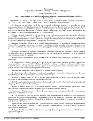 Zarządzenie Regionalnego Dyrektora Ochrony Środowiska w Bydgoszczy z dnia 10 listopada 2016 r. w sprawie zezwolenia na czynności podlegające zakazom w stosunku do bobra europejskiego (Castor fiber) Na podstawie art. 56a ust. l, ust. 2 pkt 2 i ust. 4 ustawy z dnia 16 kwietnia 2004 r. o ochronie przyrody (t.j. Dz. U. 2015 r., poz. 1651, 1936, 2171 oraz z 2016 r. poz. 422) zarządza się, co następuje: § 1. 1. Zezwala się na okres trzech lat na czynności podlegające zakazom w stosunku do bobra europejskiego (Castor fiber) polegające na umyślnym płoszeniu i niepokojeniu oraz umyślnym zabiciu do 94 osobników na terenie województwa kujawsko – pomorskiego w powiatach: lipnowskim i włocławskim – bytujących w obwodach łowieckich na terenie Zarządu Okręgowego Polskiego Związku Łowieckiego we Włocławku, których wykaz zawiera załącznik nr 1 do zarządzenia. 2. Obszar realizacji czynności, o których mowa w ust. 1 nie dotyczy rezerwatów przyrody, obszarów Natura 2000, w których bóbr jest przedmiotem ochrony, stref ochrony ostoi, miejsc rozrodu i regularnego przebywania zwierząt objętych ochroną gatunkową oraz gruntów leśnych będących własnością Skarbu Państwa w zarządzie Państwowego Gospodarstwa Leśnego Lasy Państwowe. 3. Zezwala się na okres pięciu lat na czynności podlegające zakazom w stosunku do bobra europejskiego (Castor fiber) polegające na przetrzymywaniu i posiadaniu okazów gatunku, zbywaniu, oferowaniu do sprzedaży, wymianie, darowiźnie, wywozie poza granicę państwa okazów gatunku zabitych na podstawie ust. 1. 4. Działania wynikające z niniejszego zarządzenia, dotyczące ograniczenia liczebności bobrów powinny być ukierunkowane na eliminację całych stanowisk, nie zaś pojedynczych osobników, w celu uniknięcia rozproszenia się lokalnych populacji. 5. Obszar objęty zarządzeniem został przedstawiony w formie mapy stanowiącej załącznik nr 2 do zarządzenia. § 2. 1. Zezwolenie, o którym mowa w § 1 ust. 1, dotyczy umyślnego zabijania, umyślnego płoszenia i niepokojenia bobrów przez członków Polskiego Związku Łowieckiego w miejscach wyłącznie konfliktowych, w których bobry powodują znaczące szkody poprzez podtapianie gruntów oraz niszczenie płodów i upraw rolnych, infrastruktury technicznej i innych rodzajów mienia. 2. Odstrzał bobrów możliwy jest w okresie od 01 października do 28 lutego. § 3. 1. Podmiotem odpowiedzialnym za wykonanie zarządzenia i czynności, o których mowa w § 1, jest Zarząd Okręgowy Polskiego Związku Łowieckiego we Włocławku. 2. Podmiot, o którym mowa w ust. 1, wydaje upoważnienie do dokonania odstrzału bobrów kołom łowieckim na dzierżawionych przez nie obwodach łowieckich. 3. Koło łowieckie upoważnia myśliwych do dokonania odstrzału bobrów w liczbie określonej przez Zarząd Okręgowy Polskiego Związku Łowieckiego. 4. Osoby, o których mowa w ust. 3, muszą posiadać wiedzę z zakresu ochrony gatunkowej bobra europejskiego i zasad postępowania przy ograniczaniu liczebności populacji bobrów. 5. Czynności, o których mowa w § 1 ust. 1 będą wykonywane przez przeszkolonych w tym zakresie myśliwych, o których mowa w ust. 3. § 4. 1. W terminie do dnia 15 stycznia każdego roku następującego po wejściu w życie niniejszego zarządzenia, Zarząd Okręgowy Polskiego Związku Łowieckiego we Włocławku obowiązany jest do złożenia Regionalnemu Dyrektorowi Ochrony Środowiska w Bydgoszczy sprawozdania z wykonanych czynności, o których mowa w § 1 ust. 1. 2. Sprawozdanie, o którym mowa w ust. 1, powinno zawierać: numer obwodu łowieckiego, datę pozyskania oraz liczbę odstrzelonych bobrów, a także możliwie najdokładniejsze lokalizacje miejsc eliminacji poszczególnych osobników. § 5. Regionalny Dyrektor Ochrony Środowiska dokonuje kontroli spełniania warunków określonych w wydanym zarządzeniu. Id: 9380EA5F-F7AF-43F8-85BE-B7F18FF055F9. Podpisany Strona 1 § 6. Zarządzenie wchodzi w życie po upływie 14 dni od dnia ogłoszenia. z up. Regionalnego Dyrektora Ochrony Środowiska w Bydgoszczy Regionalny Konserwator Przyrody w Bydgoszczy Marek Machnikowski Id: 9380EA5F-F7AF-43F8-85BE-B7F18FF055F9. Podpisany Strona 2 Załącznik Nr 1 do Zarządzenia Regionalnego Dyrektora Ochrony Środowiska w Bydgoszczy z dnia 10 listopada 2016 r. Wykaz obwodów łowieckich Lp. Powiat Gmina Nr obwodu Ilość bobrów możliwa do zabicia 1 lipnowski Skępe 159 8 2 lipnowski Wielgie Tłuchowo 195 16 3 lipnowski Wielgie 212 8 4 włocławski Fabianki Lipno 213 24 5 włocławski Fabianki 216 8 6 włocławski Kowal Włocławek 232 10 7 włocławski Kowal 233 10 8 włocławski Lubień Kujawski 268 10 Id: 9380EA5F-F7AF-43F8-85BE-B7F18FF055F9. Podpisany Strona 3 Załącznik Nr 2 do Zarządzenia Regionalnego Dyrektora Ochrony Środowiska w Bydgoszczy z dnia 10 listopada 2016 r. Obszar objęty zarządzeniem Id: 9380EA5F-F7AF-43F8-85BE-B7F18FF055F9. Podpisany Strona 4 UZASADNIENIE Zgodnie z art. 56a ust. 1 ustawy z dnia 16 kwietnia 2004 r. o ochronie przyrody (Dz. U. z 2015 r. poz. 1651, z późn. zm.) regionalny dyrektor ochrony środowiska może zezwolić na obszarze swojego działania, na czas określony, nie dłuższy niż 5 lat, w formie zarządzenia będącego aktem prawa miejscowego, w stosunku do m.in. bobra europejskiego na czynności podlegające zakazom określonym w art. 52 ust. 1 ustawy. Zarządzenie może być wydane w przypadku braku rozwiązań alternatywnych, jeżeli czynności, których dotyczy zarządzenie, nie są szkodliwe dla zachowania we właściwym stanie ochrony dziko występujących populacji gatunków objętych zarządzeniem oraz leży to w interesie zdrowia lub bezpieczeństwa powszechnego lub wynikają z konieczności ograniczenia poważnych szkód w odniesieniu do upraw rolnych, inwentarza żywego, lasów, rybostanu, wody lub innego rodzaju mienia. W dniu 19 lipca 2016 r. zawarte zostało porozumienie pomiędzy Generalnym Dyrektore