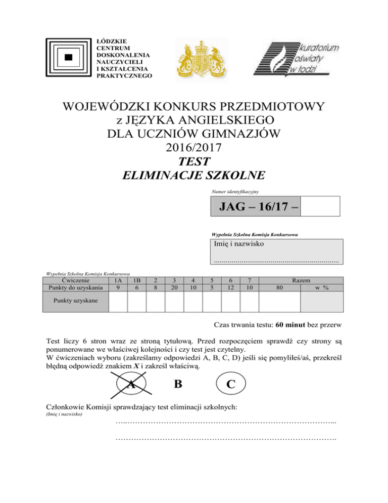 Arkusz testu eliminacji szkolnych j.angielski gimnazjum 2016/17