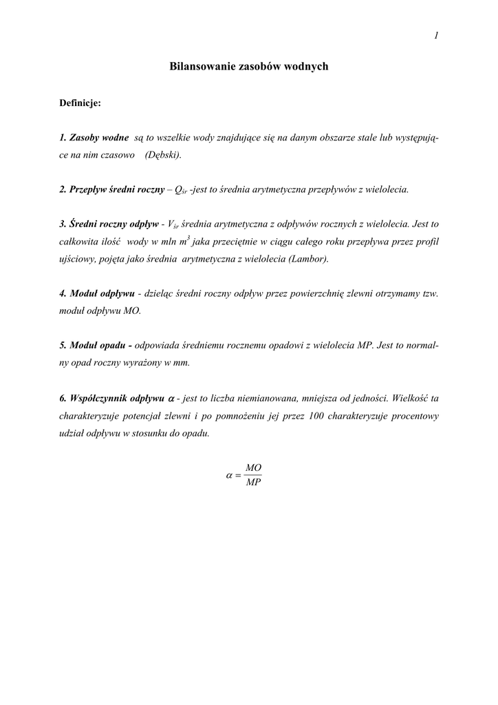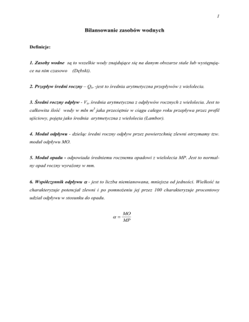 1 Bilansowanie zasobów wodnych Definicje: 1. Zasoby wodne są to wszelkie wody znajdujące się na danym obszarze stale lub występujące na nim czasowo (Dębski). 2. Przepływ średni roczny – Qśr -jest to średnia arytmetyczna przepływów z wielolecia. 3. Średni roczny odpływ - Vśr średnia arytmetyczna z odpływów rocznych z wielolecia. Jest to całkowita ilość wody w mln m3 jaka przeciętnie w ciągu całego roku przepływa przez profil ujściowy, pojęta jako średnia arytmetyczna z wielolecia (Lambor). 4. Moduł odpływu - dzieląc średni roczny odpływ przez powierzchnię zlewni otrzymamy tzw. moduł odpływu MO. 5. Moduł opadu - odpowiada średniemu rocznemu opadowi z wielolecia MP. Jest to normalny opad roczny wyrażony w mm. 6. Współczynnik odpływu α - jest to liczba niemianowana, mniejsza od jedności. Wielkość ta charakteryzuje potencjał zlewni i po pomnożeniu jej przez 100 charakteryzuje procentowy udział odpływu w stosunku do opadu. α= MO MP 2 Jednym ze sposobów opracowania bilansu wodnego jest porównanie ilości wody jaka dostaje się do zlewni z wodą zatrzymaną w zlewni oraz ilością jaka z niej odpływa w danym przedziale czasu (np miesiąc, rok, wielolecie). Ponieważ rozwój przemysłu, różnego rodzaju zjawiska klimatyczne (ciąg lat suchych, mokrych), wymuszają zmiany w zasobach wodnych i sposobach użytkowania wody zmieniają się również składniki bilansu. Stąd konieczność sporządzania różnego rodzaju bilansów. Wybór sposobu rozwiązania zależy od rozpatrywanego okresu czasu, od wielkości bilansowanego obszaru, od celu jakiemu ma służyć bilans itp. Wymaga on dokładnego rozpoznania terenu, jego budowy geologicznej, pokrycia, ukształtowania, źródeł zasilania itp. Bilanse szczegółowe, które oprócz opadu, odpływu i strat na parowanie uwzględniają również retencję opracowuje się głownie dla małych obszarów i dla krótkich okresów czasu. Dla długich okresów i znacznie większych obszarów wprowadza się uogólnienia pozwalające na uzyskanie wyników, charakterystycznych dla wielolecia. Mamy wówczas do czynienia z bilansami surowymi polegającymi na zestawieniu opadu i odpływu. 3 Możemy utworzyć ogólne równanie bilansu dla wybranej zlewni, porównując ilości wody dopływającej do niej (wejście) z ilością, która odpływa (wyjście). Z+P=H+S+R gdzie: Z - retencja początkowa [mm], P - opad atmosferyczny [mm], H - odpływ ze zlewni [mm], S - straty (głównie na parowanie) [mm], R - retencja końcowa [mm]. 4 Przekształcając kolejno, otrzymujemy: Z−R=H +S−P R − Z = P − (H + S) R − Z = ∆R ∆R = P − H − S Wielkość ∆R może być ujemna lub dodatnia. Możemy wówczas napisać: P = H + S ± ∆R W przypadku, kiedy ∆R równa się zero mówimy o uproszczonym bilansie wodnym zlewni. P= H+S Dzieląc równanie bilansu przez opad otrzymamy: H S + =1 P P Oznaczając: S/P = β otrzymamy zależność współczynnika odpływu α od parametru β współczynnika strat. Możemy napisać: α = 1− β Uproszczony bilans wodny stosujemy często w przypadku kiedy rozpatrujemy dłuższy okres, np wielolecie. Zdarza się bowiem, że retencja Z na początku okresu równa jest retencji końcowej R. 5 Wielkość opadu i odpływu określane są bezpośrednio na podstawie obserwacji (deszczomierze, pluwiografy, łaty wodowskazowe, limnigrafy) natomiast straty określa się w sposób pośredni, w zależności od różnych czynników wpływających na ich kształtowanie. Określając bilans z wielolecia dla danego obszaru posługujemy się wielkościami średnimi czyli: P - średnią roczną wysokością opadu obszarowego z wielolecia [mm], H - średnią roczną wielkością odpływu z wielolecia [mm], S - średnią roczną wysokością strat bilansowych, tzw. deficytem odpływu [mm]. Średni roczny opad obszarowy z wielolecia obliczamy przy zastosowaniu jednej z me- tod graficznych, służących do wyznaczania opadu średniego dla danego obszaru. Metody te bazują na danych pochodzących z posterunków opadowych rozmieszczonych na badanym terenie. W przypadku braku stacji pomiarowych opad średni można określić na podstawie atlasu klimatycznego. Średnią roczną wielkość odpływu z wielolecia w przypadku prowadzonych na rzece obserwacji wodowskazowych ustalamy jako średnią arytmetyczną rocznych odpływów podzielonych przez powierzchnię zlewni. W przypadku braku obserwacji do obliczenia przepływu średniego rocznego z wielolecia stosujemy wzory empiryczne (np. wzór Iszkowskiego, Kajetanowicza, Punzeta ). 6 Wzór Iszkowskiego Wzór służy do obliczania przepływu średniego rocznego SQ przy danych parametrach zlewni: SQ = Qśr =0.03171 cs P A [m3/s] gdzie: P - opad normalny roczny [m], A - powierzchnia zlewni [km2], Cs - współczynnik odpływu - wartość stabelaryzowana 0,03171 - zamiennik wartości wskaźnika opadu wyrażonego w m na przepływ [m3/s]. Wartości współczynnika do wzoru Iszkowskiego Grupa topograficzna zlewni Współczynnik odpływu Cs Bagna i niziny 0,20 Niziny i płaskie wysoczyzny 0,25 Częściowo niziny, częściowo pagórki 0,30 Pagórki o łagodnych stokach 0,35 Częściowo przedgórza, częściowo pagórki lub strome pagórki 0,40 Karkonosze, Sudety, Beskidy (średnie) 0,55 Wysokie góry 0,6 - 0,7 7 Kajetanowicz współczynnik odpływu określa następująco: α g = 0.095 * Ws0.2 * Ψ 0.084 α n = 0.063 * Ws0.25 * Ψ 0.1 gdzie: αg - współczynnik odpływu dla rzek górskich, αn - współczynnik odpływu dla rzek nizinnych, Ws - średnia wysokość nadmorska zlewni liczona wg wzoru: Ws = 0.5 * (Wz + Wu ) [m n.p.m.] Wz - wysokość źródeł [m n. p. m.], Wu - wysokość ujścia [m n.p.m.], ψ - średnie nachylenie zboczy: Ψ= ∆W A [ ‰] ∆W = Wz − Wu A - powierzchnia zlewni [km2]. 8 Wzór Punzeta Wzór służy do obliczania przepływu średniego rocznego na terenach całego dorzecza górnej Wisły. QR = q R * A 0.00001151 * P 2.05576 * J 0.0647 qR = N 0