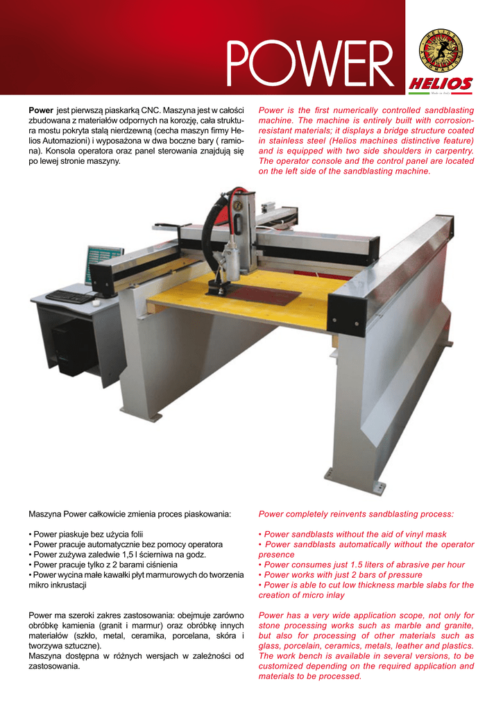 POWER Made in Italy Power jest pierwszą piaskarką CNC. Maszyna jest w całości zbudowana z materiałów odpornych na korozję, cała struktura mostu pokryta stalą nierdzewną (cecha maszyn firmy Helios Automazioni) i wyposażona w dwa boczne bary ( ramiona). Konsola operatora oraz panel sterowania znajdują się po lewej stronie maszyny. Power is the first numerically controlled sandblasting machine. The machine is entirely built with corrosionresistant materials; it displays a bridge structure coated in stainless steel (Helios machines distinctive feature) and is equipped with two side shoulders in carpentry. The operator console and the control panel are located on the left side of the sandblasting machine. Maszyna Power całkowicie zmienia proces piaskowania: Power completely reinvents sandblasting process: • Power piaskuje bez użycia folii • Power pracuje automatycznie bez pomocy operatora • Power zużywa zaledwie 1,5 l ścierniwa na godz. • Power pracuje tylko z 2 barami ciśnienia • Power wycina małe kawałki płyt marmurowych do tworzenia mikro inkrustacji • Power sandblasts without the aid of vinyl mask • Power sandblasts automatically without the operator presence • Power consumes just 1.5 liters of abrasive per hour • Power works with just 2 bars of pressure • Power is able to cut low thickness marble slabs for the creation of micro inlay Power ma szeroki zakres zastosowania: obejmuje zarówno obróbkę kamienia (granit i marmur) oraz obróbkę innych materiałów (szkło, metal, ceramika, porcelana, skóra i tworzywa sztuczne). Maszyna dostępna w różnych wersjach w zależności od zastosowania. Power has a very wide application scope, not only for stone processing works such as marble and granite, but also for processing of other materials such as glass, porcelain, ceramics, metals, leather and plastics. The work bench is available in several versions, to be customized depending on the required application and materials to be processed. Piaskarka Power w wersji Standard ma obszar roboczy 1000mm x 1000 mm, również dostępna w wersji Plus (obszar roboczy 1000mm x 2000 mm) oraz w wersji Mega ( obszar roboczy 1600mm x 3000mm). Power zaspokaja potrzeby nawet najbardziej wymagających operatorów w branży kamieniarskiej. Piaskarka może być wyposażona w dodatkowe akcesoria jak urządzenie fotoelektroniczne lub system plotera, które zwiększają potencjał maszyny. Power standard has a work area of 1000 mm x 1000 mm, and it is also available in the Plus version (working area of 1000 mm x 2000 mm) and in the Mega version (working area of 1600 mm x 3000 mm) ideal for entire slabs sand blasting. The sand blasting machine can be equipped with useful accessories such as the photograffiti device and the plotter systems that enhance the potential of the machine. POWER POWER PLUS POWER MEGA Oś X Stroke X 1000 mm 1000 mm 1600 mm Oś Y Stroke Y 1000 mm 2000 mm 3000 mm Oś Z Stroke Z 200 mm 200 mm 200 mm Most Bridge Passing Od 200 do 1000 mm Od 200 do 1000 mm Od 200 do 1000 mm Zużycie powietrza Air Consumption 2-5 BAR 2-5 BAR 2-5 BAR Zużycie energii Energy consumption 1,5 KW 1,5 KW 1,5 KW Spray Diam. Abrasive spray Diam. 1-5 mm 1-5 mm 1-5 mm Wymiary Overall Dimensions 1700 x 1700 x 1700 mm 1700 x 2700 x 1700 mm 2300 x 3700 x 1700 mm Waga mostu Bridge Weight 120 kg 220 kg 350 kg ZASTOSOWANIE PIASKOWANIA W KAMIENIARSTWIE EXAMPLES OF SANDBLASTING APPLICATION IN STONE PROCESSING Usługi pogrzebowe Funerary art Elementy dekoracyjne Decorations Inkrustacja Inlays Elementy antypoślizgowe Systems for slip up prevention Wykończeni Paneling Frezowanie Drilling Fototechnologia Photograffiti Via Olanda, allacciante H - Zona Industriale 66050 San Salvo (CH) - Italy Tel. 0039 0873 341584 - Fax 0039 0873 545077 www.heliosautomazioni.com - [email protected]