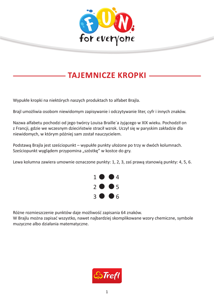 TAJEMNICZE KROPKI Wypukłe kropki na niektórych naszych produktach to alfabet Brajla. Brajl umożliwia osobom niewidomym zapisywanie i odczytywanie liter, cyfr i innych znaków. Nazwa alfabetu pochodzi od jego twórcy Louisa Braille`a żyjącego w XIX wieku. Pochodził on z Francji, gdzie we wczesnym dzieciństwie stracił wzrok. Uczył się w paryskim zakładzie dla niewidomych, w którym później sam został nauczycielem. Podstawą Brajla jest sześciopunkt – wypukłe punkty ułożone po trzy w dwóch kolumnach. Sześciopunkt wyglądem przypomina „szóstkę” w kostce do gry. Lewa kolumna zawiera umownie oznaczone punkty: 1, 2, 3, zaś prawą stanowią punkty: 4, 5, 6. 1 4 2 3 5 6 Różne rozmieszczenie punktów daje możliwość zapisania 64 znaków. W Brajlu można zapisać wszystko, nawet najbardziej skomplikowane wzory chemiczne, symbole muzyczne albo działania matematyczne. 1 My proponujemy zabawę w szyfrowanie. Korzystając z poniższej tabelki, zapisz w sześciopunkcie swoje imię, potem imiona swoich rodziców lub przyjaciół. Wystarczy czarnym pisakiem zamalować odpowiednie kropki. Baw się razem z nami w szyfrowanie wiadomości. Dla oznaczenia wiekliej litery używa się tzw. znaku wielkiej litery. a b c d e f g h i j k l m n o p q r s t u v w x y z ą ć ę ł ń ó ś ż 2 ź 3