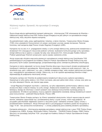 http://www.pge-obrot.pl/aktualnosci/wszystkie Wybieraj mądrze. Sprawdź, kto sprzedaje Ci energię 21.04.2015 Rusza druga edycja ogólnopolskiej kampanii edukacyjno - informacyjnej TOE skierowanej do Klientów – Odbiorców energii elektrycznej.PGE Polska Grupa Energetyczna jest jednym ze sprzedawców energii elektrycznej, który aktywnie wspiera kampanię. Za pośrednictwem radia, prasy ogólnopolskiej i lokalnej, a także internetu, Towarzystwo Obrotu Energią (TOE) chce uświadomić Konsumentom ich prawa i promować uczciwe zasady biznesowe. Patronat honorowy nad kampanią objął Prezes Urzędu Regulacji Energetyki (URE). Kampania ma na celu m.in. propagowanie wiedzy o rynku energii elektrycznej, podnoszenie świadomości o działaniach firm stosujących nieuczciwe praktyki rynkowe, budowanie konkurencyjnego rynku sprzedaży energii elektrycznej w oparciu o zasady fair play oraz wskazanie firm, które przyjęły Kodeks Dobrych Praktyk gwarantując Klientom przejrzyste i jasne zasady zawierania umów. Akcję rozpoczęło oficjalne wręczenie pierwszym sprzedawcom energii elektrycznej Certyfikatów TOE potwierdzających przystąpienie do Kodeksu Dobrych Praktyk Sprzedawców Energii Elektrycznej oraz pozytywny wynik audytu sprawdzającego, przeprowadzonego przez zewnętrzną jednostkę certyfikującą. Kampania to także odpowiedź na liczne skargi Klientów dotyczące nieuczciwych działań przedstawicieli handlowych niektórych sprzedawców. Wykorzystują oni niewiedzę, zwłaszcza osób starszych i fakt, że określenia typu „pan z elektrowni” czy „pan z zakładu energetycznego” wielu osobom jednoznacznie kojarzą się z wiarygodnymi sprzedawcami energii. Zdarza się, że w ten sposób wprowadzają klientów w błąd i doprowadzają do podpisania niechcianej umowy. Kampania zachęca też Klientów do podejmowania świadomych decyzji przy wyborze sprzedawcy. Gwarantuje to tylko pełna wiedza z kim Klient rozmawia, jaka jest pełna treść oferty i umowy oraz jakie są nie tylko obowiązki Klienta, ale również jego prawa. - Urząd Regulacji Energetyki wychodzi z założenia, że tylko odpowiednio poinformowany odbiorca może skutecznie dbać o własne interesy na rynku energii. Zwiększenie świadomości i wiedzy odbiorców, łatwiejszy dostęp do informacji o swoich prawach oraz edukacja konsumentów wywierają presję na sprzedawców. W efekcie sprzedawcy muszą zapewnić odpowiednie standardy obsługi świadomych swoich praw konsumentów – podkreślił Maciej Bando, Prezes URE. Towarzystwo Obrotu Energią zachęca, by Klienci sprawdzali akwizytorów, których wpuszczają do swoich domów, dokładnie zapoznawali się z przedstawianą ofertą i czytali umowy, które mają podpisać. W przypadku jakichkolwiek wątpliwości powinni o wszystko pytać i dokładnie omawiać zapisy umowy z przedstawicielem handlowym. Akcja informuje także o przysługującym każdemu prawie do rezygnacji w ciągu 14 dni - bez ponoszenia konsekwencji - z umowy podpisanej poza siedzibą (lokalem) sprzedawcy. Kampanię edukacyjno - informacyjną wspierają sprzedawcy energii elektrycznej z grup: PGE Polska Grupa Energetyczna, ENEA, Energa, Multimedia Polska, Polkomtel, , TAURON Polska Energia i RWE Polska. Wszyscy oni posiadają Certyfikat TOE i przystąpili do Kodeksu Dobrych Praktyk Sprzedawców Energii Elektrycznej.