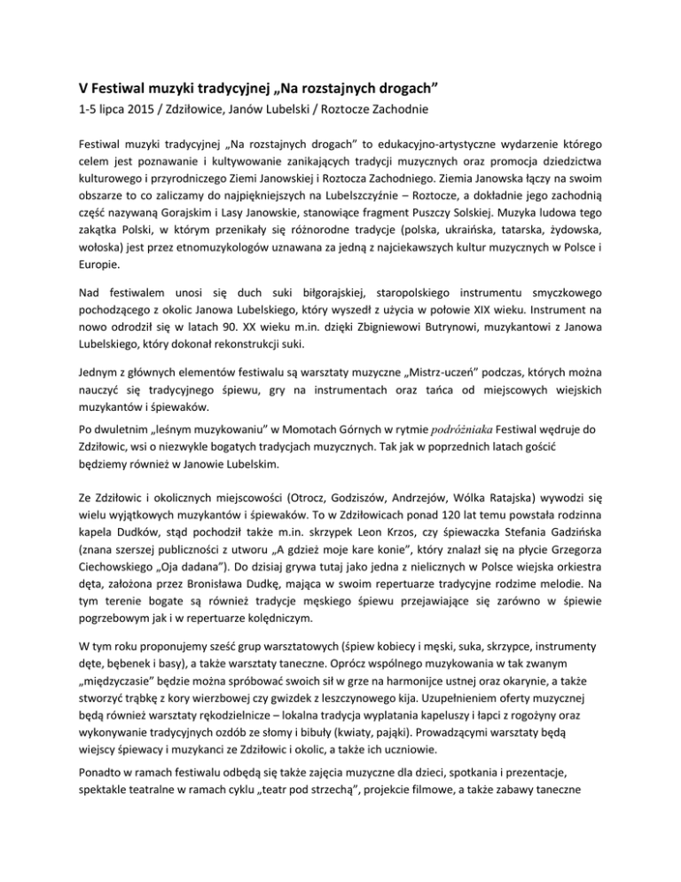 V Festiwal muzyki tradycyjnej „Na rozstajnych drogach” 1-5 lipca 2015 / Zdziłowice, Janów Lubelski / Roztocze Zachodnie Festiwal muzyki tradycyjnej „Na rozstajnych drogach” to edukacyjno-artystyczne wydarzenie którego celem jest poznawanie i kultywowanie zanikających tradycji muzycznych oraz promocja dziedzictwa kulturowego i przyrodniczego Ziemi Janowskiej i Roztocza Zachodniego. Ziemia Janowska łączy na swoim obszarze to co zaliczamy do najpiękniejszych na Lubelszczyźnie – Roztocze, a dokładnie jego zachodnią część nazywaną Gorajskim i Lasy Janowskie, stanowiące fragment Puszczy Solskiej. Muzyka ludowa tego zakątka Polski, w którym przenikały się różnorodne tradycje (polska, ukraińska, tatarska, żydowska, wołoska) jest przez etnomuzykologów uznawana za jedną z najciekawszych kultur muzycznych w Polsce i Europie. Nad festiwalem unosi się duch suki biłgorajskiej, staropolskiego instrumentu smyczkowego pochodzącego z okolic Janowa Lubelskiego, który wyszedł z użycia w połowie XIX wieku. Instrument na nowo odrodził się w latach 90. XX wieku m.in. dzięki Zbigniewowi Butrynowi, muzykantowi z Janowa Lubelskiego, który dokonał rekonstrukcji suki. Jednym z głównych elementów festiwalu są warsztaty muzyczne „Mistrz-uczeń” podczas, których można nauczyć się tradycyjnego śpiewu, gry na instrumentach oraz tańca od miejscowych wiejskich muzykantów i śpiewaków. Po dwuletnim „leśnym muzykowaniu” w Momotach Górnych w rytmie podróżniaka Festiwal wędruje do Zdziłowic, wsi o niezwykle bogatych tradycjach muzycznych. Tak jak w poprzednich latach gościć będziemy również w Janowie Lubelskim. Ze Zdziłowic i okolicznych miejscowości (Otrocz, Godziszów, Andrzejów, Wólka Ratajska) wywodzi się wielu wyjątkowych muzykantów i śpiewaków. To w Zdziłowicach ponad 120 lat temu powstała rodzinna kapela Dudków, stąd pochodził także m.in. skrzypek Leon Krzos, czy śpiewaczka Stefania Gadzińska (znana szerszej publiczności z utworu „A gdzież moje kare konie”, który znalazł się na płycie Grzegorza Ciechowskiego „Oja dadana”). Do dzisiaj grywa tutaj jako jedna z nielicznych w Polsce wiejska orkiestra dęta, założona przez Bronisława Dudkę, mająca w swoim repertuarze tradycyjne rodzime melodie. Na tym terenie bogate są również tradycje męskiego śpiewu przejawiające się zarówno w śpiewie pogrzebowym jak i w repertuarze kolędniczym. W tym roku proponujemy sześć grup warsztatowych (śpiew kobiecy i męski, suka, skrzypce, instrumenty dęte, bębenek i basy), a także warsztaty taneczne. Oprócz wspólnego muzykowania w tak zwanym „międzyczasie” będzie można spróbować swoich sił w grze na harmonijce ustnej oraz okarynie, a także stworzyć trąbkę z kory wierzbowej czy gwizdek z leszczynowego kija. Uzupełnieniem oferty muzycznej będą również warsztaty rękodzielnicze – lokalna tradycja wyplatania kapeluszy i łapci z rogożyny oraz wykonywanie tradycyjnych ozdób ze słomy i bibuły (kwiaty, pająki). Prowadzącymi warsztaty będą wiejscy śpiewacy i muzykanci ze Zdziłowic i okolic, a także ich uczniowie. Ponadto w ramach festiwalu odbędą się także zajęcia muzyczne dla dzieci, spotkania i prezentacje, spektakle teatralne w ramach cyklu „teatr pod strzechą”, projekcie filmowe, a także zabawy taneczne i koncerty muzyki tradycyjnej oraz tradycją inspirowanej. W trakcie festiwalu stworzony i odsłonięty zostanie wyjątkowy mural autorstwa Karoliny Bajki, nawiązujący do dawnych tradycji muzycznych regionu. Festiwalowe wydarzenia zakończą się niedzielnym kameralnym koncertem, odbywającym się na malowniczym wirydarzu Janowskiego Sanktuarium. Festiwalowi towarzyszyć będzie wystawa fotograficzna „Obrazy minionego”. PROGRAM 1-5 LIPCA - warsztaty muzyki tradycyjnej Roztocza Zachodniego (obowiązują wcześniejsze zapisy, liczba miejsc ograniczona) / Zdziłowice 2 LIPCA (czwartek) 7.55 – Kupta Oberka! – happening, muzyczna zapowiedź festiwalu / Targowisko Miejskie, Rynek Starego Miasta w Janowie Lubelskim 9.00 – Muzyczny mural / ul. Sukiennicza, Janów Lubelski 20.00 – „Taka muzyka” – wieczór wspomnień o muzykantach i muzyce ze Zdziłowic. Projekcja filmów i dawnych fotografii / Zdziłowice 21.00 – Potańcówka / Zdziłowice 3 LIPCA (piątek) 20.00 – Teatr pod strzechą: „U znachorki w chałupie” – Zespół śpiewaczo-obrzędowy Blinowianki z Blinowa / Zdziłowice 21.00 – Potańcówka / Zdziłowice 4 LIPCA (sobota) 14.30 – „Tradycje muzyczne mikroregionu janowskiego. Dziedzictwo pokolbergowskie – współczesne działania zachowawcze” - wykład - dr Agata Kusto (UMCS w Lublinie) / Zdziłowice 19.00 – „Ordynacka nuta” – koncert i potańcówka. W ramach potańcówki m.in. konkurs na najlepszą parę taneczną / Zdziłowice 5 LIPCA (niedziela) 13.00 – Spektakl teatralny dla dzieci „O tym, jak kurka mała swych gospodarzy przechytrzyć chciała” – Teatr „Pod jaworem” / Zdziłowice 19.00 – Koncert pieśni z tradycji „Na każdy moment, na każdą godzinę” – Agata Harz (śpiew) i Remek Hanaj (lira korbowa, skrzypce) / Sanktuarium w Janowie Lubelskim Zagrają i zaśpiewają: Kapela ze Zdziłowic, Jan Leszczyński, Stefan Maziarczyk, Jan Wnuk, Janina Chmiel, Orkiestra Dęta ze Zdziłowic, Męski zespół śpiewaczy z Godziszowa, uczestnicy warsztatów muzycznych, Kapela Stanisława Głaza, Kapela Butrynów, Kapela Braci Dziobaków, Kapela Bornego, Kwartet Destymflandzki, Agata Harz i Remigiusz Hanaj oraz goście i przyjaciele... Strona www festiwalu: www.festiwal.sukabilgorajska.pl ORGANIZATORZY: Fundacja Ochrony i Rozwoju i Twórczości Ludowej Szkoła Suki Biłgorajskiej Fundacja Stara Droga WSPÓŁORGANIZATOR: Gminne Centrum Kultury i Promocji w Godziszowie oddział Zdziłowice Zespół Szkół w Zdziłowicach Stowarzyszenie Twórców Ludowych WSPARCIE FINANSOWE: Ministerstwo Kultury i Dziedzictwa Narodowego U