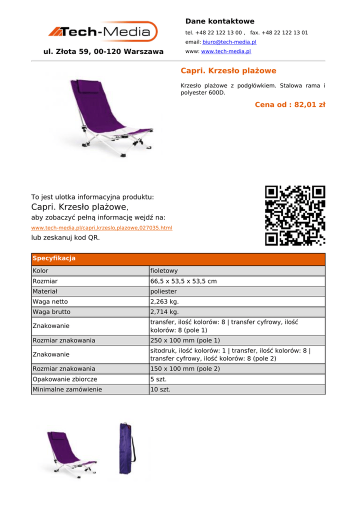 Dane kontaktowe tel. +48 22 122 13 00 , fax. +48 22 122 13 01 email: [email protected] ul. Złota 59, 00-120 Warszawa www: www.tech-media.pl Capri. Krzesło plażowe Krzesło plażowe z podgłówkiem. Stalowa rama i polyester 600D. Cena od : 82,01 zł To jest ulotka informacyjna produktu: Capri. Krzesło plażowe , aby zobaczyć pełną informację wejdź na: www.tech-media.pl/capri,krzeslo,plazowe,027035.html lub zeskanuj kod QR. Specyfikacja Kolor fioletowy Rozmiar 66,5 x 53,5 x 53,5 cm Materiał poliester Waga netto 2,263 kg. Waga brutto 2,714 kg. Znakowanie transfer, ilość kolorów: 8 | transfer cyfrowy, ilość kolorów: 8 (pole 1) Rozmiar znakowania 250 x 100 mm (pole 1) Znakowanie sitodruk, ilość kolorów: 1 | transfer, ilość kolorów: 8 | transfer cyfrowy, ilość kolorów: 8 (pole 2) Rozmiar znakowania 150 x 100 mm (pole 2) Opakowanie zbiorcze 5 szt. Minimalne zamówienie 10 szt.