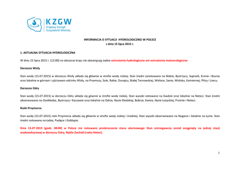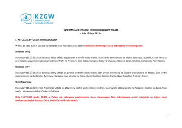 INFORMACJA O SYTUACJI HYDROLOGICZNEJ W POLSCE z dnia 15 lipca 2015 r. 1. AKTUALNA SYTUACJA HYDROLOGICZNA W dniu 15 lipca 2015 r. (12:00) na obszarze kraju nie obowiązują żadne ostrzeżenia hydrologiczne ani ostrzeżenia meteorologiczne Dorzecze Wisły Stan wody (15.07.2015) w dorzeczu Wisły układa się głównie w strefie wody niskiej. Stan średni zanotowano na Nidzie, Bystrzycy, Supraśli, Krznie i Bzurze oraz lokalnie w górnym i ujściowym odcinku Wisły, na Przemszy, Sole, Rabie, Dunajcu, Białej Tarnowskiej, Wisłoce, Sanie, Wisłoku, Kamiennej, Pilicy i Liwcu. Dorzecze Odry Stan wody (15.07.2015) w dorzeczu Odry układa się gównie w strefie wody niskiej. Stan wysoki notowano na Gwdzie oraz lokalnie na Noteci. Stan średni obserwowano na Osobłodze, Bystrzycy i Kaczawie oraz lokalnie na Odrze, Nysie Kłodzkiej, Bobrze, Kwisie, Nysie Łużyckiej, Prośnie i Noteci. Rzeki Przymorza Stan wody (15.07.2015) rzek Przymorza układa się głównie w strefie wody niskiej i średniej. Stan wysoki obserwowano na Nogacie i lokalnie na Łynie. Stan średni notowano na Łebie, Pasłęce i Gołdapie. Dnia 15.07.2015 (godz. 08:00) w Polsce nie notowano przekroczenia stanu alarmowego Stan ostrzegawczy został osiągnięty na jednej stacji wodowskazowej w dorzeczu Odry, Nakło-Zachód (rzeka Noteć). 1 Ponadto informuję, iż w ciągu ostatniej doby wystąpiły opady o dużej wydajności w następujących zlewniach.1 Zlewnia Opad średni w zlewni [mm] Opad maksymalny [mm] Stacja Raba 5,1 34,9 Dobczyce Nida 12,5 25,4 Rykoszyn Wisłoka 7,5 20,1 Radomyśl Wielki San 9,5 20,1 Wielkie Oczy Wisła górna 9,1 30,7 Raków Pilica 6,3 20,6 Wąsosz Odra środkowa 9,2 31,6 Dobrogoszcz Sytuacja hydrologiczna na obszarze administrowanym przez RZGW we Wrocławiu Stany wód na wodowskazach środkowej Odry układają się w strefie stanów niskich i średnich, z tendencją rosnącą. Stany wód na wodowskazach na dopływach w regionie wodnym Środkowej Odry układają się w strefie stanów niskich i średnich z tendencją rosnącą. W ostatniej dobie miały miejsce opady deszczu, maksymalnie w zlewni Ślęzy – 31 mm, Bobru – 12, Bystrzycy 11 mm, Kaczawy 10 mm w pozostałych zlewniach poniżej 10 mm. RZGW we Wrocławiu na bieżąco monitoruje, przy pomocy własnych służb terenowych sytuację na rzekach. Sytuacja hydrologiczna na obszarze administrowanym przez RZGW w Gliwicach Na obszarze administrowanym przez RZGW nie notuje się przekroczenia alarmowych i ostrzegawczych w regionie wodnym Górnej Odry i regionie wodnym Małej Wisły. Sytuacja hydrologiczna na terenie RZGW w Gliwicach jest stabilna, kontrolowana na bieżąco. Sytuacja hydrologiczna na obszarze administrowanym przez RZGW w Warszawie Obecnie stany wód na obszarze administrowanym przez RZGW w Warszawie układają się głównie w strefie stanów niskich, lokalnie stanów średnich. Na obszarze administrowanym przez RZGW w Warszawie nie obowiązują pogotowia i alarmy przeciwpowodziowe oraz ostrzeżenia hydrologiczne. 1 "Źródłem prezentowanych danych są informacje zbierane i przetwarzane przez państwową służbę hydrologiczno-meteorologiczną, którymi rozporządza IMGW- PIB" 2 W ciągu ostatniej doby na obszarze administrowanym przez RZGW w Warszawie zaobserwowano opady o sumie dobowej powyżej 20 mm na jednej stacji meteorologicznej: Wąsosz (Pilica) – 20.6 mm. W ciągu najbliższej doby w większej części Regionu spodziewane są przelotne opady deszczu. W ciągu najbliższej doby na Wiśle prognozowane są na ogół: od Zawichostu do ujścia Kamiennej i od ujścia Narwi do Włocławka — niewielkie wahania stanu wody, a od ujścia Kamiennej do ujścia Narwi — niewielkie spadki stanu wody. Na cały odcinku rzeki stany wód w strefie stanów niskich. W ciągu najbliższej doby na Bugu spodziewane są na ogół niewielkie wahania i spadki w strefie stanów niskich. W ciągu najbliższej doby na Narwi spodziewana jest na ogół stabilizacja stanu wody w strefie stanów niskich. Obecnie na obszarze administrowanym przez RZGW w Warszawie sytuacja jest stabilna - brak zagrożenia powodziowego. Sytuacja hydrologicznometeorologiczna w regionie jest na bieżąco monitorowana. Sytuacja hydrologiczna na obszarze administrowanym przez RZGW w Krakowie Nie stwierdzono istotnych zmian w sytuacji hydro-meteorologicznej w dorzeczu górnej Wisły w odniesieniu do dnia wczorajszego. Nieznaczne wzrosty stanów wód (w zakresie od kilku do kilkunastu centymetrów, tendencja na godz. 6:00 UTC), wywołane opadami deszczu, odnotowano głównie w zlewniach: Nidy i Czarnej Nidy, a także na dopływach Sanu: Wiszni i Wiarze, lokalnie na Wisłoku. Maksymalny dobowy przyrost stanu wody wystąpił na Bobrzy w profilu Słowik (o 53cm, tendencja na godz. 6:00 UTC). Największe dobowe sumy opadów odnotowano w zlewniach: Czarnej Staszowskiej (opad maksymalny 30,70 mm na stacji Raków), Nidy (opad maksymalny 25,40 mm na stacji Rykoszyn). Zwierciadła wód układają się w strefach stanów średnich i niskich. W okresie najbliższej doby IMGW prognozuje dla dorzecza górnej Wisły opady deszczu o wysokości 5 mm (oraz dodatkowo 5 mm w prognozowanym opadzie konwekcyjnym), w zlewniach: Soły, Skawy, Raby, Dunajca, Nidy, Wisłoki, Wisłoka i Sanu. Sytuacja hydrologiczna w obszarze działania RZGW Kraków jest kontrolowana na bieżąco – aktualnie nie występuje zagrożenie powodziowe. Sytuacja hydrologiczna na obszarze administrowanym przez RZGW w Poznaniu Sytuacja w regionie wodnym Warty jest cały czas stabilna. Na terenie regionu wodnego Warty w ciągu ostatniej doby odnotowano opady do 15 mm. Na większości odcinków rzek regionu wodnego Warty obserwowane są niewielkie wzrosty stanów wód. W regionie wodnym stany wody układają się w strefie stanów niskich i średnich, co wskazuje na możliwości retencyjne zlewni. Jedynie lokalnie, na Nerze w Lutomiersku, Białośliwiu na Noteci oraz Pile i Ptuszy na Gwdzie stany wody układają się w strefie stan