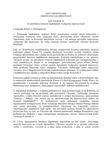 LIST APOSTOLSKI ORDINATIO SACERDOTALIS JAN PAWEŁ II O udzielaniu święceń kapłańskich wyłącznie mężczyznom Czcigodni Bracia w Biskupstwie! 1. Święcenia kapłańskie, poprzez które przekazana zostaje misja nauczania i uświęcania wiernych oraz rządzenia nimi, powierzona przez Chrystusa swoim Apostołom, były w Kościele katolickim zawsze i od samego początku zastrzeżone wyłącznie dla mężczyzn. Tę samą tradycję wiernie zachowały również Kościoły Wschodu. Gdy we Wspólnocie Anglikańskiej zaczęto rozpatrywać kwestię udzielania święceń kobietom, papież Paweł VI, pragnąc dochować wierności swemu urzędowi stróża Tradycji apostolskiej oraz usunąć nową przeszkodę na drodze do jedności chrześcijan, przypomniał braciom anglikanom stanowisko Kościoła katolickiego w tej sprawie: „Kościół uważa, że udzielanie święceń kapłańskich kobietom jest niedopuszczalne z racji zasadniczych. Racje te są następujące: poświadczony przez Pismo Święte przykład Chrystusa, który wybrał swoich Apostołów wyłącznie spośród mężczyzn; stała praktyka Kościoła, który naśladuje Chrystusa wybierając tylko mężczyzn; wreszcie żywe Magisterium Kościoła, konsekwentnie głoszące, że wykluczenie kobiet z kapłaństwa jest zgodne z zamysłem Boga wobec swego Kościoła”1. Ponieważ jednak kwestia ta stała się przedmiotem dyskusji także wśród teologów oraz w niektórych środowiskach katolickich, Paweł VI zlecił Kongregacji Nauki Wiary, by przedstawiła i wyjaśniła doktrynę Kościoła w tej materii. Uczyniono to wydając Deklarację Inter insigniores, którą papież zatwierdził i nakazał opublikować2. 2. Deklaracja podejmuje i wyjaśnia podstawowe racje przemawiając za tą doktryną, to znaczy powołuje się na przykład, jaki pozostawił Chrystus, wybierając dwunastu Apostołów, a który Kościół wiernie naśladował w swojej niezmiennej i powszechnej Tradycji, i dlatego „nie uważa się za uprawnionego do dopuszczania kobiet do święceń kapłańskich”3. Te podstawowe racje dokument uzupełnia innymi argumentami teologicznymi, które wykazują słuszność takiego właśnie Bożego nakazu oraz jasno dowodzą, że postępowaniem Chrystusa nie kierowały motywy socjologiczne i kulturowe Jego epoki. Jak stwierdził później Paweł VI, „prawdziwa przyczyna leży w tym, że Chrystus tak właśnie postanowił, nadając Kościołowi jego podstawową strukturę i jego antropologię teologiczną, zawsze zachowywaną przez Tradycję Kościoła”4. W Liście Apostolskim Mulieris dignitatem napisałem na ten temat: „Powołując samych mężczyzn na swych Apostołów, Chrystus uczynił to w sposób całkowicie wolny i suwerenny. Uczynił to z taką samą wolnością, z jaką w całym swoim postępowaniu uwydatniał godność i powołanie kobiety, nie dostosowując się do panującego obyczaju i tradycji usankcjonowanej ówczesnym prawodawstwem”5. Istotnie, Ewangelie i Dzieje Apostolskie poświadczają, że powołanie Apostołów dokonało się zgodnie z odwiecznym zamysłem Bożym: Chrystus wybrał tych, których sam chciał (por. Mk 3,13-14, J 15,16) i uczynił to w jedności z Ojcem, „przez Ducha Świętego” (Dz 1,2), spędziwszy uprzednio całą noc na modlitwie (por. Łk 6,12). Dlatego podejmując decyzję o dopuszczeniu do kapłaństwa urzędowego6, Kościół uznawał zawsze za niezmienną normę sposób postępowania swojego Pana, który wybrał dwunastu mężczyzn i uczynił ich fundamentem swojego Kościoła (por. Ap 21,14). W rzeczywistości nie otrzymali oni jedynie jakiejś funkcji, którą mógłby potem sprawować każdy członek Kościoła, ale zostali w szczególny sposób i wewnętrznie włączeni w misję samego Słowa Wcielonego (por. Mt 10,1.7-8; 28,1620; Mk 3,13-16; 16,14-15). Apostołowie uczynili to samo, gdy wybrali sobie współpracowników7, którzy mieli być ich następcami w posługiwaniu8. Wybór ten obejmował również tych, którzy mieli kontynuować w dziejach Kościoła misję Apostołów — misję reprezentowania Chrystusa Pana i Odkupiciela9. 3. Wreszcie fakt, że Najświętsza Maryja Panna, Matka Boga i Matka Kościoła, nie otrzymała misji właściwej Apostołom ani kapłaństwa urzędowego, ukazuje wyraźnie, iż niedopuszczenie kobiet do święceń kapłańskich nie może oznaczać umniejszenia ich godności ani ich dyskryminacji, ale jest wiernością wobec zamysłu mądrości Pana wszechświata. Obecność i rola kobiety w życiu i misji Kościoła, choć nie są związane z kapłaństwem urzędowym, pozostają absolutnie niezbędne i niezastąpione. Jak podkreśla Deklaracja Inter insigniores, „święta Matka Kościół pragnie, aby chrześcijańskie kobiety w pełni uświadomiły sobie wielkość swojej misji: w dzisiejszych czasach odegrają one decydującą rolę zarówno w odnowie i humanizacji społeczeństwa, jak i w ponownym odkryciu przez wierzących prawdziwego oblicza Kościoła”10. Księgi Nowego Testamentu i cała historia Kościoła dostarczają wielu przykładów obecności w Kościele kobiet, które były prawdziwymi uczennicami i świadkami Chrystusa w rodzinie i w zawodach świeckich, a także w całkowitej konsekracji na służbę Bogu i Ewangelii. „Kościół bowiem broniąc godności kobiety i jej powołania, wyraził cześć i wdzięczność dla tych, które — wierne Ewangelii — w każdej epoce uczestniczyły w apostolskim posłannictwie całego Ludu Bożego. Są to postaci świętych męczennic, dziewic, matek rodzin, które odważnie dawały świadectwo swej wiary, a wychowując własne dzieci w duchu Ewangelii, przekazywały wiarę i tradycję Kościoła”11. Z drugiej strony, struktura hierarchiczna Kościoła jest całkowicie ukierunkowana na świętość wiernych. Dlatego Deklaracja Inter insigniores przypomina, że „jedynym i największym charyzmatem, którego można i należy pragnąć, jest miłość (por. 1 Kor 12-13). Najwię
