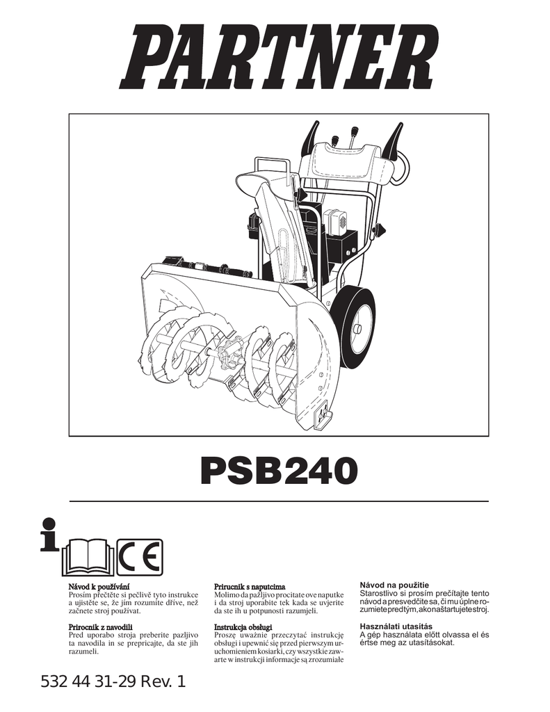 PSB240 Návod k používání Prosím pøeètìte si peèlivì tyto instrukce a ujistìte se, že jím rozumíte døíve, než zaènete stroj používat. Prirucnik s naputcima Molimo da pažljivo procitate ove naputke i da stroj uporabite tek kada se uvjerite da ste ih u potpunosti razumjeli. Návod na použitie Starostlivo si prosím prečítajte tento návod a presvedčite sa, či mu úplne rozumiete pred tým, ako naštartujete stroj. Prirocnik z navodili Pred uporabo stroja preberite pazljivo ta navodila in se prepricajte, da ste jih razumeli. Instrukcja obs³ugi Proszê uwa¿nie przeczytaæ instrukcjê obs³ugi i upewniæ siê przed pierwszym uruchomieniem kosiarki, czy wszystkie zawarte w instrukcji informacje s¹ zrozumia³e Használati utasítás A gép használata előtt olvassa el és értse meg az utasításokat. 532 44 31-29 Rev. 1 CZ OBSAH SPIS TREŚCI STRANA STRONA BEZPEČNOSTNÍ POKYNY ............................ ............................3-8 3-8 ZASADY BEZPIECZEŃSTWA ........................3-8 ........................3-8 MONTÁŽ ....................................................11-17 ....................................................11-17 MONTAŻ .....................................................11-17 .....................................................11-17 PROVOZ ......................................................18-36 ......................................................18-36 OBSŁUGA ................................................... ...................................................18-36 18-36 ÚDRŽBA .....................................................36-44 .....................................................36-44 KONSERWACJA ..........................................36-44 ..........................................36-44 SERVIS A NASTAVENÍ ...............................44-56 ...............................44-56 SERWIS I REGULACJA............................... REGULACJA...............................44-56 44-56 USKLADNĚNÍ ............................................ ............................................57-60 57-60 PRZECHOWYWANIE ................................. .................................57-60 57-60 ZÁVADY A JEJICH ODSTRAŇOVÁNÍ .......................................61-63 .......................................61-63 ROZWIĄZYWANIE PROBLEMÓW ............61-63 ............61-63 HR SADRŽAJ SK STRANA OBSAH STRANA SIGURNOSNI PROPISI ...................................3-8 ...................................3-8 BEZPEČNOSTNÉ PRAVIDLÁ ..............3-8 SKLAPANJE ................................................ ................................................11-17 11-17 MONTÁŽ ............................................ 11-17 UPRAVLJANJE STROJEM .......................... ..........................18-36 18-36 PREVÁDZKA .....................................18-36 ODRŽAVANJE .............................................36-44 .............................................36-44 ÚDRŽBA ............................................36-44 SERVISIRANJE I PODEŠAVANJE ............... ...............44-56 44-56 SERVIS A NASTAVENIA ...................44-56 SKLADIŠTENJE .........................................57-60 .........................................57-60 SKLADOVANIE .................................57-60 PRONALAŽENJE KVAROVA ......................61-63 ......................61-63 ODSTRAŇOVANIE PORÚCH ...........61-63 SI VSEBINA HU STRAN TARTALOM LAP VARNOSTNI PREDPISI .................................. ..................................3-8 3-8 BIZTONSÁGI ELŐÍRÁSOK...................3-8 SESTAVLJANJE ...........................................11-17 ...........................................11-17 ÖSSZESZERELÉS ............................ 11-17 DELOVANJE................................................18-36 ................................................18-36 MŰKÖDTETÉS ..................................18-36 VZDRŽEVANJE...........................................36-43 ...........................................36-43 KARBANTARTÁS .............................36-44 POPRAVILA IN NASTAVITVE .................... ....................43-54 43-54 SZERVIZELÉS ÉS BEÁLLÍTÁSOK ..44-56 SHRANJEVANJE ......................................... .........................................55-58 55-58 TÁROLÁS ..........................................57-60 ODPRAVLJANJE TEŽAV .............................59-61 .............................59-61 HIBAELHÁRÍTÁS ..............................61-63 Original Instructions in English, all others are translations. 2 CZ Zásady bezpečné práce se sněhovou frézou Školení 1. 2. 3. 4. Pečlivě si přečtěte příručku s pokyny k provozu a údržbě. Důkladně se seznamte s ovládáním a správným používáním stroje. Musíte vědět jak stroj zastavit a rychle vypnout ovládání. Nikdy nedovolte dětem pracovat se strojem. Nikdy nedovolte dospělým osobám pracovat se strojem, pokud nebyly seznámeny s bezpečnostními a provozními pokyny. V pracovním prostoru se nesmí pohybovat žádné osoby, zejména malé děti, a domácí zvířata. Dávejte pozor, aby jste neuklouzli nebo neupadli, zejména když se strojem couváte. Příprava 1. 2. 3. 4. 5. 6. 7. 8. 9. Důkladně prohlédněte prostor kde se stroj bude používat a odstraňte všechny rohožky, sáňky, prkénka, dráty a jiné předměty. Před nastartování motoru vypněte všechny náhony a zařaďte neutrál. Neprovozujte stroj bez vhodného zimního oblečení. Obujte si takové boty, které budou vhodné pro kluzký povrch. S palivem zacházejte opatrně, je vysoce hořlavé. a) Používejte nádobu schválenou pro palivo. b) Nikdy nedoplňujte palivo do běžícího nebo horkého motoru. c) Palivovou nádržku doplňujte venku a s velkou opatrností. Nikdy nádržku nedoplňujte uvnitř. d) Víčko nasaďte pevně a rozlité palivo utřete. U všech strojů s elektrickým pohonem motoru nebo elektrickým st