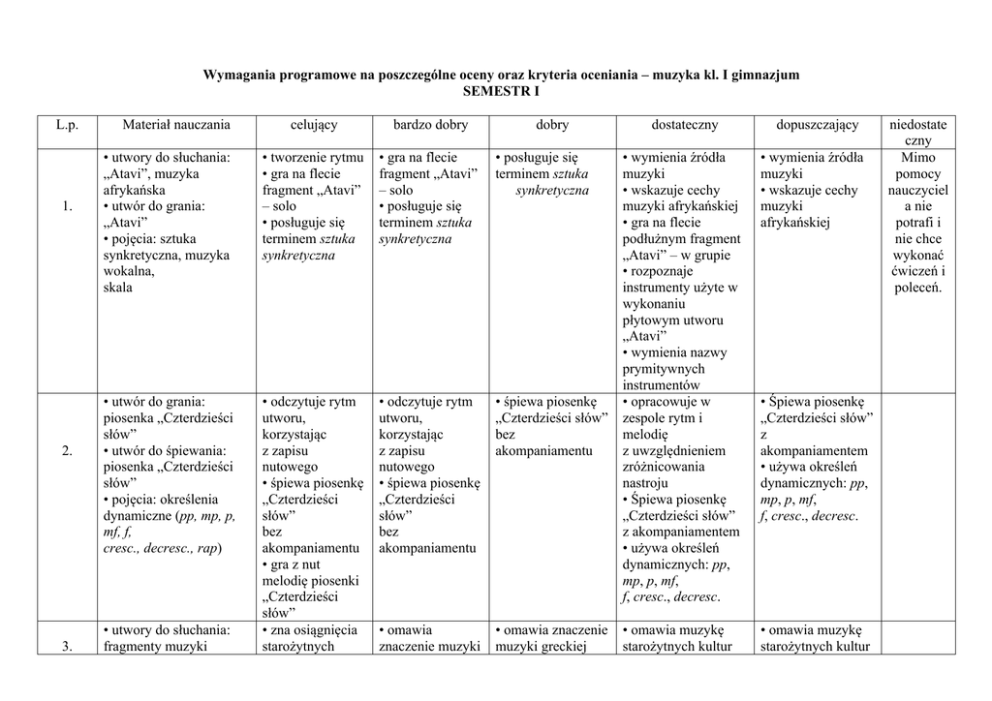 Wymagania programowe na poszczególne oceny oraz kryteria oceniania – muzyka kl. I gimnazjum SEMESTR I L.p. 1. 2. 3. Materiał nauczania celujący bardzo dobry • utwory do słuchania: „Atavi”, muzyka afrykańska • utwór do grania: „Atavi” • pojęcia: sztuka synkretyczna, muzyka wokalna, skala • tworzenie rytmu • gra na flecie fragment „Atavi” – solo • posługuje się terminem sztuka synkretyczna • gra na flecie fragment „Atavi” – solo • posługuje się terminem sztuka synkretyczna • posługuje się terminem sztuka synkretyczna • utwór do grania: piosenka „Czterdzieści słów” • utwór do śpiewania: piosenka „Czterdzieści słów” • pojęcia: określenia dynamiczne (pp, mp, p, mf, f, cresc., decresc., rap) • odczytuje rytm utworu, korzystając z zapisu nutowego • śpiewa piosenkę „Czterdzieści słów” bez akompaniamentu • gra z nut melodię piosenki „Czterdzieści słów” • zna osiągnięcia starożytnych • odczytuje rytm utworu, korzystając z zapisu nutowego • śpiewa piosenkę „Czterdzieści słów” bez akompaniamentu • śpiewa piosenkę „Czterdzieści słów” bez akompaniamentu • omawia znaczenie muzyki • omawia znaczenie muzyki greckiej • utwory do słuchania: fragmenty muzyki dobry dostateczny dopuszczający • wymienia źródła muzyki • wskazuje cechy muzyki afrykańskiej • gra na flecie podłużnym fragment „Atavi” – w grupie • rozpoznaje instrumenty użyte w wykonaniu płytowym utworu „Atavi” • wymienia nazwy prymitywnych instrumentów • opracowuje w zespole rytm i melodię z uwzględnieniem zróżnicowania nastroju • Śpiewa piosenkę „Czterdzieści słów” z akompaniamentem • używa określeń dynamicznych: pp, mp, p, mf, f, cresc., decresc. • wymienia źródła muzyki • wskazuje cechy muzyki afrykańskiej • omawia muzykę starożytnych kultur • omawia muzykę starożytnych kultur • Śpiewa piosenkę „Czterdzieści słów” z akompaniamentem • używa określeń dynamicznych: pp, mp, p, mf, f, cresc., decresc. niedostate czny Mimo pomocy nauczyciel a nie potrafi i nie chce wykonać ćwiczeń i poleceń. starożytnego Egiptu, muzyki chińskiej, indyjskiej, greckiej („Hymn do Heliosa”) i żydowskiej • utwory do grania: melodie egipska i chińska • pojęcia: pentatonika, hymn 4. 5. • utwór do grania: „Pieśń Seikilosa” • pojęcia: fermata, sztuka synkretyczna, tragedia • utwory do słuchania: fragment chorału gregoriańskiego, pieśń„Bogurodzica” • utwór do grania: kompozycja własna • pojęcia: jednogłosowość, a cappella, chorał gregoriański, msza, teocentryzm, trubadur, Greków w dziedzinie muzyki • omawia znaczenie muzyki greckiej i żydowskiej dla rozwoju muzyki europejskiej • rozpoznaje instrumenty starożytne użyte w nagraniach • tworzy układ choreograficzny do opracowanej melodii i rytmu • odczytuje rytm utworu, korzystając z zapisu nutowego • potrafi wymienić imiona greckich muz • rozumie znaczenie pojęcia a cappella • wyjaśnia, jakie znaczenie miała umiejętność muzykowania dla wizerunku średniowiecznego rycerza • rozpoznaje greckiej i żydowskiej dla rozwoju muzyki europejskiej • rozpoznaje instrumenty starożytne użyte w nagraniach i żydowskiej dla rozwoju muzyki europejskiej muzycznych: egipskiej, żydowskiej, greckiej, chińskiej i indyjskiej • gra z nut melodie • zalicza starożytne instrumenty do właściwej grupy muzycznych: egipskiej, żydowskiej, greckiej, chińskiej i indyjskiej • odczytuje rytm utworu, korzystając z zapisu nutowego • potrafi wymienić imiona greckich muz • potrafi wymienić imiona greckich muz • improwizuje ruch do „Pieśni Seikilosa” • gra z nut melodię „Pieśni Seikilosa” • improwizuje ruch do „Pieśni Seikilosa” • rozumie znaczenie pojęcia a cappella • rozpoznaje brzmienie niektórych instrumentów z epoki • rozumie znaczenie • zna ramy czasowe pojęcia a cappella epoki średniowiecza i wie, jak długo trwała ta epoka • zna części stałe mszy • rozumie znaczenie pojęcia jednogłosowość • wymienia cechy • wymienia cechy chorału gregoriańskiego • rozumie znaczenie pojęcia jednogłosowość 6. 7. truwer, łuk okrągły, ostry, sklepienie, portal, witraż, rozeta, maswerk, relief, fresk brzmienie niektórych instrumentów z epoki • utwór do słuchania: „Gaude Mater Polonia” R. de Vaqueiras, „Kalenda maya” • utwór do śpiewania: „Gaude Mater Polonia” • pojęcia: motet, notacja, neumy, wielogłosowość • sylwetki twórców: Leoninus, Perotinus, Wincenty z Kielczy, Mikołaj z Radomia • omawia sylwetkę Mikołaja z Radomia, • potrafi zaśpiewać pieśń „Gaude Mater Polonia” – solo • wyjaśnia, jakie znaczenie dla rozwoju muzyki miało zastosowanie notacji muzycznej • omawia sylwetkę Mikołaja z Radomia, • potrafi zaśpiewać pieśń „Gaude Mater Polonia” – solo - śpiewa piosenkę solo • utwory do słuchania: „Rex”, „Kleszczmy rękoma” • utwór do grania: „Kleszczmy rękoma” • uzasadnia, w jaki sposób zmiana ideologii teocentrycznej na • wskazuje i wyjaśnia równice pomiędzy językiem poezji Kochanowskiego • wskazuje i wyjaśnia równice pomiędzy językiem poezji Kochanowskiego a chorału gregoriańskiego • analizuje elementy budowy „Bogurodzicy” • wymienia nazwy instrumentów z epoki • rozumie znaczenie pojęć: msza, chorał gregoriański, trubadurzy i truwerzy określa charakter utworu • rytmizuje tekst pieśni • potrafi zaśpiewać pieśń „Gaude Mater Polonia” – w grupie • zna twórców wielogłosowości – Leoninusa i Perotinusa • porównuje pieśni: „Bogurodzica”, „Rota”, „Mazurek Dąbrowskiego” • wskazuje elementy kształtujące świecki charakter utworu „Kalenda maya” • zna ramy czasowe epoki renesansu i wie, jak długo trwała • porównuje czas określa charakter