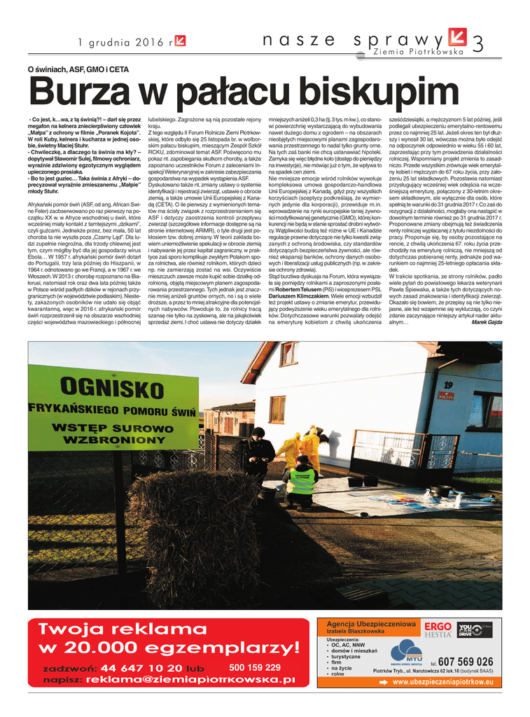 nasze sprawy 1 grudnia 2016 r Ziemia Piotrkowska 3 O świniach, ASF, GMO i CETA Burza w pałacu biskupim - Co jest, k…wa, z tą świnią?! – darł się przez megafon na kelnera zniecierpliwiony człowiek „Małpa” z ochrony w filmie „Poranek Kojota”. W roli Kuby, kelnera i kucharza w jednej osobie, świetny Maciej Stuhr. - Chwileczkę, a dlaczego ta świnia ma kły? – dopytywał Sławomir Sulej, filmowy ochroniarz, wyraźnie zdziwiony egzotycznym wyglądem upieczonego prosiaka. - Bo to jest guziec… Taka świnia z Afryki – doprecyzował wyraźnie zmieszanemu „Małpie” młody Stuhr. Afrykański pomór świń (ASF, od ang. African Swine Feler) zaobserwowano po raz pierwszy na początku XX w. w Afryce wschodniej u świń, które wcześniej miały kontakt z tamtejszymi „dzikami”, czyli guźcami. Jednakże przez, bez mała, 50 lat choroba ta nie wyszła poza „Czarny Ląd”. Dla ludzi zupełnie niegroźna, dla trzody chlewnej jest tym, czym mógłby być dla jej gospodarzy wirus Ebola… W 1957 r. afrykański pomór świń dotarł do Portugalii, trzy lata później do Hiszpanii, w 1964 r. odnotowano go we Francji, a w 1967 r. we Włoszech.W 2013 r. chorobę rozpoznano na Białorusi, natomiast rok oraz dwa lata później także w Polsce wśród padłych dzików w rejonach przygranicznych (w województwie podlaskim). Niestety, zakażonych osobników nie udało się objąć kwarantanną, więc w 2016 r. afrykański pomór świń rozprzestrzenił się na obszarze wschodniej części województwa mazowieckiego i północnej lubelskiego. Zagrożone są nią pozostałe rejony kraju. Z tego względu II Forum Rolnicze Ziemi Piotrkowskiej, które odbyło się 25 listopada br. w wolborskim pałacu biskupim, mieszącym Zespół Szkół RCKU, zdominował temat ASF. Poświęcono mu pokaz nt. zapobiegania skutkom choroby, a także zapoznano uczestników Forum z zaleceniami Inspekcji Weterynaryjnej w zakresie zabezpieczania gospodarstwa na wypadek wystąpienia ASF. Dyskutowano także nt. zmiany ustawy o systemie identyfikacji i rejestracji zwierząt, ustawie o obrocie ziemią, a także umowie Unii Europejskiej z Kanadą (CETA). O ile pierwszy z wymienionych tematów ma ścisły związek z rozprzestrzenianiem się ASF i dotyczy zaostrzenia kontroli przepływu zwierząt (szczegółowe informacje dostępne są na stronie internetowej ARiMR), o tyle drugi jest pokłosiem tzw. dobrej zmiany. W teorii zakłada bowiem uniemożliwienie spekulacji w obrocie ziemią i nabywanie jej przez kapitał zagraniczny, w praktyce zaś sporo komplikuje zwykłym Polakom spoza rolnictwa, ale również rolnikom, których dzieci np. nie zamierzają zostać na wsi. Oczywiście mieszczuch zawsze może kupić sobie działkę odrolnioną, objętą miejscowym planem zagospodarowania przestrzennego. Tych jednak jest znacznie mniej aniżeli gruntów ornych, no i są o wiele droższe, a przez to mniej atrakcyjne dla potencjalnych nabywców. Powoduje to, że rolnicy tracą szansę nie tylko na zyskowną, ale na jakąkolwiek sprzedaż ziemi. I choć ustawa nie dotyczy działek mniejszych aniżeli 0,3 ha (tj.3 tys.m kw.), co stanowi powierzchnię wystarczającą do wybudowania nawet dużego domu z ogrodem – na obszarach nieobjętych miejscowymi planami zagospodarowania przestrzennego to nadal tylko grunty orne. Na tych zaś banki nie chcą ustanawiać hipoteki. Zamyka się więc błędne koło (dostęp do pieniędzy na inwestycje), nie mówiąc już o tym, że wpływa to na spadek cen ziemi. Nie mniejsze emocje wśród rolników wywołuje kompleksowa umowa gospodarczo-handlowa Unii Europejskiej z Kanadą, gdyż przy wszystkich korzyściach (sceptycy podkreślają, że wymiernych jedynie dla korporacji), przewiduje m.in. wprowadzenie na rynki europejskie taniej żywności modyfikowanej genetycznie (GMO), której konkurencji nie będą w stanie sprostać drobni wytwórcy. Wątpliwości budzą też różne w UE i Kanadzie regulacje prawne dotyczące nie tylko kwestii związanych z ochroną środowiska, czy standardów dotyczących bezpieczeństwa żywności, ale również ekspansji banków, ochrony danych osobowych i liberalizacji usług publicznych (np. w zakresie ochrony zdrowia). Stąd burzliwa dyskusja na Forum, która wywiązała się pomiędzy rolnikami a zaproszonymi posłami Robertem Telusem (PiS) i wiceprezesem PSL Dariuszem Klimczakiem. Wiele emocji wzbudził też projekt ustawy o zmianie emerytur, przewidujący podwyższenie wieku emerytalnego dla rolników. Dotychczasowe warunki pozwalały odejść na emeryturę kobietom z chwilą ukończenia 500 159 229 sześćdziesiątki, a mężczyznom 5 lat później, jeśli podlegali ubezpieczeniu emerytalno-rentowemu przez co najmniej 25 lat. Jeżeli okres ten był dłuższy i wynosił 30 lat, wówczas można było odejść na odpoczynek odpowiednio w wieku 55 i 60 lat, zaprzestając przy tym prowadzenia działalności rolniczej. Wspomniany projekt zmienia to zasadniczo. Przede wszystkim zrównuje wiek emerytalny kobiet i mężczyzn do 67 roku życia, przy założeniu 25 lat składkowych. Pozostawia natomiast przysługujący wcześniej wiek odejścia na wcześniejszą emeryturę, połączony z 30-letnim okresem składkowym, ale wyłącznie dla osób, które spełnią te warunki do 31 grudnia 2017 r.Co zaś do rezygnacji z działalności, mogłaby ona nastąpić w dowolnym terminie również po 31 grudnia 2017 r. Proponowane zmiany obejmują też świadczenia renty rolniczej wypłacanej z tytułu niezdolności do pracy. Proponuje się, by osoby pozostające na rencie, z chwilą ukończenia 67. roku życia przechodziły na emeryturę rolniczą, nie mniejszą od dotychczas pobieranej renty, jednakże pod warunkiem co najmniej 25-letniego opłacania składek. W trakcie spotkania, ze strony rolników, padło wiele pytań do powiatowego lekarza weterynarii Pawła Śpiewaka, a także tych dotyczących nowych zasad znakowania i identyfikacji zwierząt. Okazało się bowiem, 