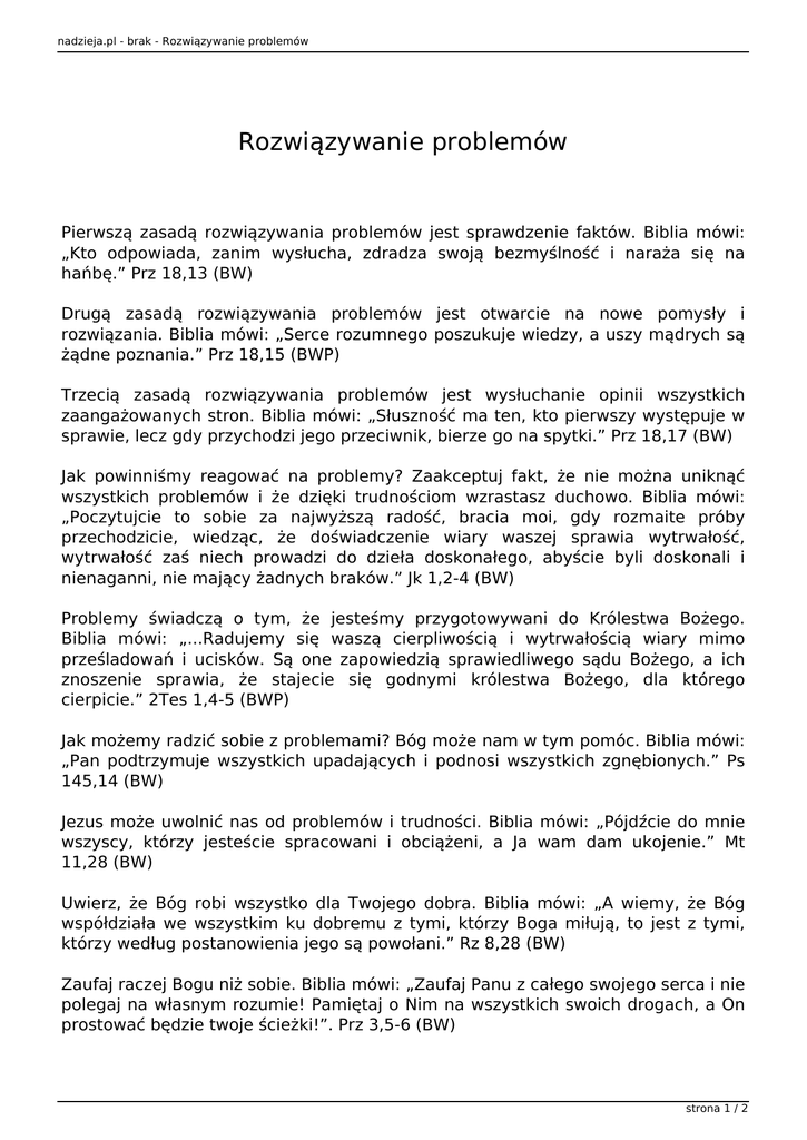 nadzieja.pl - brak - Rozwiązywanie problemów Rozwiązywanie problemów Pierwszą zasadą rozwiązywania problemów jest sprawdzenie faktów. Biblia mówi: „Kto odpowiada, zanim wysłucha, zdradza swoją bezmyślność i naraża się na hańbę.” Prz 18,13 (BW) Drugą zasadą rozwiązywania problemów jest otwarcie na nowe pomysły i rozwiązania. Biblia mówi: „Serce rozumnego poszukuje wiedzy, a uszy mądrych są żądne poznania.” Prz 18,15 (BWP) Trzecią zasadą rozwiązywania problemów jest wysłuchanie opinii wszystkich zaangażowanych stron. Biblia mówi: „Słuszność ma ten, kto pierwszy występuje w sprawie, lecz gdy przychodzi jego przeciwnik, bierze go na spytki.” Prz 18,17 (BW) Jak powinniśmy reagować na problemy? Zaakceptuj fakt, że nie można uniknąć wszystkich problemów i że dzięki trudnościom wzrastasz duchowo. Biblia mówi: „Poczytujcie to sobie za najwyższą radość, bracia moi, gdy rozmaite próby przechodzicie, wiedząc, że doświadczenie wiary waszej sprawia wytrwałość, wytrwałość zaś niech prowadzi do dzieła doskonałego, abyście byli doskonali i nienaganni, nie mający żadnych braków.” Jk 1,2-4 (BW) Problemy świadczą o tym, że jesteśmy przygotowywani do Królestwa Bożego. Biblia mówi: „...Radujemy się waszą cierpliwością i wytrwałością wiary mimo prześladowań i ucisków. Są one zapowiedzią sprawiedliwego sądu Bożego, a ich znoszenie sprawia, że stajecie się godnymi królestwa Bożego, dla którego cierpicie.” 2Tes 1,4-5 (BWP) Jak możemy radzić sobie z problemami? Bóg może nam w tym pomóc. Biblia mówi: „Pan podtrzymuje wszystkich upadających i podnosi wszystkich zgnębionych.” Ps 145,14 (BW) Jezus może uwolnić nas od problemów i trudności. Biblia mówi: „Pójdźcie do mnie wszyscy, którzy jesteście spracowani i obciążeni, a Ja wam dam ukojenie.” Mt 11,28 (BW) Uwierz, że Bóg robi wszystko dla Twojego dobra. Biblia mówi: „A wiemy, że Bóg współdziała we wszystkim ku dobremu z tymi, którzy Boga miłują, to jest z tymi, którzy według postanowienia jego są powołani.” Rz 8,28 (BW) Zaufaj raczej Bogu niż sobie. Biblia mówi: „Zaufaj Panu z całego swojego serca i nie polegaj na własnym rozumie! Pamiętaj o Nim na wszystkich swoich drogach, a On prostować będzie twoje ścieżki!”. Prz 3,5-6 (BW) strona 1 / 2 nadzieja.pl - brak - Rozwiązywanie problemów Czy rozwiązywanie problemów jest dla Ciebie trudne? Bóg Ci pomoże. Biblia mówi: „Jeżeli zaś komuś z was brakuje mądrości, niech modli się o nią do Boga, a na pewno będzie wysłuchany, gdyż Bóg wszystkim chętnie i bez wymówek udziela swych darów. Trzeba jednak zawsze modlić się z wiarą, bez cienia wątpliwości. Kto bowiem poddaje się zwątpieniu, podobny jest do morskiej fali, miotanej wiatrem i przerzucanej z miejsca na miejsce. Człowiekowi takiemu niech się nawet nie wydaje, że uzyska coś od Pana.” Jk 1,5-7 (BWP) *** Stosowane skróty: BW - Biblia Warszawska (tzw. Nowy Przekład) BT - Biblia Tysiąclecia BWP - Biblia Warszawsko-Praska (Biblia bpa Romaniuka) strona 2 / 2 Powered by TCPDF (www.tcpdf.org)