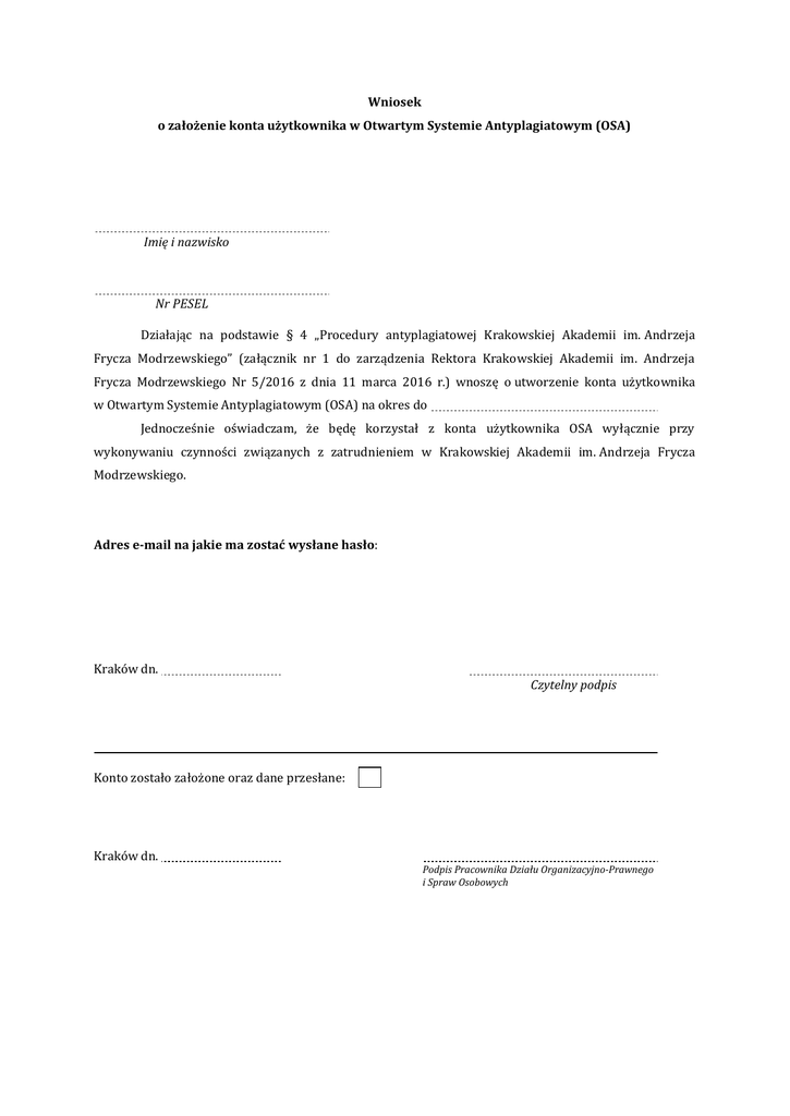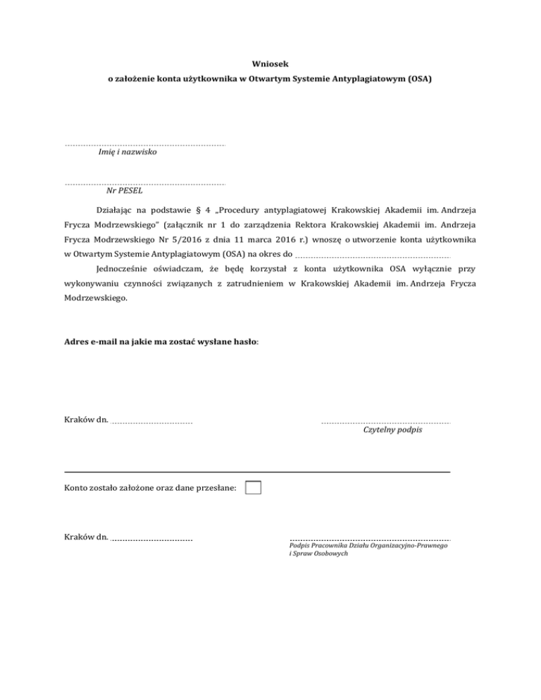 Wniosek o założenie konta użytkownika w Otwartym Systemie Antyplagiatowym (OSA) Imię i nazwisko Nr PESEL Działając na podstawie § 4 „Procedury antyplagiatowej Krakowskiej Akademii im. Andrzeja Frycza Modrzewskiego” (załącznik nr 1 do zarządzenia Rektora Krakowskiej Akademii im. Andrzeja Frycza Modrzewskiego Nr 5/2016 z dnia 11 marca 2016 r.) wnoszę o utworzenie konta użytkownika w Otwartym Systemie Antyplagiatowym (OSA) na okres do Jednocześnie oświadczam, że będę korzystał z konta użytkownika OSA wyłącznie przy wykonywaniu czynności związanych z zatrudnieniem w Krakowskiej Akademii im. Andrzeja Frycza Modrzewskiego. Adres e-mail na jakie ma zostać wysłane hasło: Kraków dn. Czytelny podpis Konto zostało założone oraz dane przesłane: Kraków dn. Podpis Pracownika Działu Organizacyjno-Prawnego i Spraw Osobowych