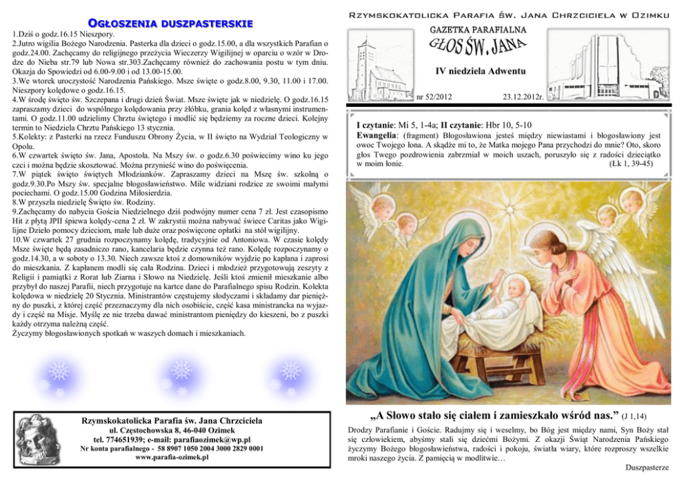 OGŁOSZENIA DUSZPASTERSKIE 1.Dziś o godz.16.15 Nieszpory. 2.Jutro wigilia Bożego Narodzenia. Pasterka dla dzieci o godz.15.00, a dla wszystkich Parafian o godz.24.00. Zachęcamy do religijnego przeżycia Wieczerzy Wigilijnej w oparciu o wzór w Drodze do Nieba str.79 lub Nowa str.303.Zachęcamy również do zachowania postu w tym dniu. Okazja do Spowiedzi od 6.00-9.00 i od 13.00-15.00. 3.We wtorek uroczystość Narodzenia Pańskiego. Msze święte o godz.8.00, 9.30, 11.00 i 17.00. Nieszpory kolędowe o godz.16.15. 4.W środę święto św. Szczepana i drugi dzień Świat. Msze święte jak w niedzielę. O godz.16.15 zapraszamy dzieci do wspólnego kolędowania przy żłóbku, grania kolęd z własnymi instrumentami. O godz.11.00 udzielimy Chrztu świętego i modlić się będziemy za roczne dzieci. Kolejny termin to Niedziela Chrztu Pańskiego 13 stycznia. 5.Kolekty: z Pasterki na rzecz Funduszu Obrony Życia, w II święto na Wydział Teologiczny w Opolu. 6.W czwartek święto św. Jana, Apostoła. Na Mszy św. o godz.6.30 poświecimy wino ku jego czci i można będzie skosztować. Można przynieść wino do poświęcenia. 7.W piątek święto świętych Młodzianków. Zapraszamy dzieci na Mszę św. szkolną o godz.9.30.Po Mszy św. specjalne błogosławieństwo. Mile widziani rodzice ze swoimi małymi pociechami. O godz.15.00 Godzina Miłosierdzia. 8.W przyszła niedzielę Święto św. Rodziny. 9.Zachęcamy do nabycia Gościa Niedzielnego dziś podwójny numer cena 7 zł. Jest czasopismo Hit z płytą JPII śpiewa kolędy-cena 2 zł. W zakrystii można nabywać świece Caritas jako Wigilijne Dzieło pomocy dzieciom, małe lub duże oraz poświęcone opłatki na stół wigilijny. 10.W czwartek 27 grudnia rozpoczynamy kolędę, tradycyjnie od Antoniowa. W czasie kolędy Msze święte będą zasadniczo rano, kancelaria będzie czynna też rano. Kolędę rozpoczynamy o godz.14.30, a w soboty o 13.30. Niech zawsze ktoś z domowników wyjdzie po kapłana i zaprosi do mieszkania. Z kapłanem modli się cała Rodzina. Dzieci i młodzież przygotowują zeszyty z Religii i pamiątki z Rorat lub Ziarna i Słowo na Niedzielę. Jeśli ktoś zmienił mieszkanie albo przybył do naszej Parafii, niech przygotuje na kartce dane do Parafialnego spisu Rodzin. Kolekta kolędowa w niedzielę 20 Stycznia. Ministrantów częstujemy słodyczami i składamy dar pieniężny do puszki, z której część przeznaczymy dla nich osobiście, część kasa ministrancka na wyjazdy i część na Misje. Myślę ze nie trzeba dawać ministrantom pieniędzy do kieszeni, bo z puszki każdy otrzyma należną część. Życzymy błogosławionych spotkań w waszych domach i mieszkaniach. Rzymskokatolicka Parafia św. Jana Chrzciciela ul. Częstochowska 8, 46-040 Ozimek tel. 774651939; e-mail: [email protected] Nr konta parafialnego - 58 8907 1050 2004 3000 2829 0001 www.parafia-ozimek.pl IV niedziela Adwentu nr 52/2012 23.12.2012r. I czytanie: Mi 5, 1-4a; II czytanie: Hbr 10, 5-10 Ewangelia: (fragment) Błogosławiona jesteś między niewiastami i błogosławiony jest owoc Twojego łona. A skądże mi to, że Matka mojego Pana przychodzi do mnie? Oto, skoro głos Twego pozdrowienia zabrzmiał w moich uszach, poruszyło się z radości dzieciątko w moim łonie. (Łk 1, 39-45) „A Słowo stało się ciałem i zamieszkało wśród nas.” (J 1,14) Drodzy Parafianie i Goście. Radujmy się i weselmy, bo Bóg jest między nami, Syn Boży stał się człowiekiem, abyśmy stali się dziećmi Bożymi. Z okazji Świąt Narodzenia Pańskiego życzymy Bożego błogosławieństwa, radości i pokoju, światła wiary, które rozproszy wszelkie mroki naszego życia. Z pamięcią w modlitwie… Duszpasterze PORZĄDEK NABOŻEŃSTW IV NIEDZIELA ADWENTU. 6.45 Za + męża Edwarda Świąć, rodziców obu stron, rodzeństwo Jana i Janinę, szwagrów, ciocię Marię, Jana Lipińskiego i d. cz. 8.00 Za + matkę Hildegardę Hasterok w 2 r. śm. i + ojca Maksymiliana i ++ dziadków obu stron. 9.30 Za + męża Jerzego Halupczok, syna Joachima, rodz. Marię i Konrada Kampa, siostrę Jadwigę i Różę, brata Jana, szwagra i szwagierki, teściów Agnieszkę i Franciszka Halupczok i ++ z pokrew. 11.00 Do B. Op. z podz. za otrzymane łaski z prośbą o dalsze błogosławieństwo Boże i zdrowie dla Jana Reimann z ok.70 r. urodzin i w rodzinie. 15.00 szpital: Za + ukochanego syna Dawida i jego ojca oraz cała rodzinę Giesa i Szrajber. 16.15 NIESZPORY 17.00 Za ++ rodziców Irenę i Longina Grabowskich oraz wszystkich ++ z rodzin Grabowskich, Lalić, Piechaczek i Doleckich. Poniedziałek-24.12Wigilia Bożego Narodzenia. 6.30 1.W podz. za otrzymane łaski z prośbą o dalsze błogosławieństwo Boże i światło Ducha Świętego w posłudze duszpasterskiej dla ks. Proboszcza w dniu urodzin (od Rady Parafialnej). 2.Za +męża i ojca Ireneusza Proszewskiego w 8 r. śm. i ++ z rodz Kręskich i Proszewskich 15.00 Pasterka dla Dzieci: Za +Jana Wójcik (od byłych i obecnych pracowników Przedszkola nr 1 w Ozimku). 24.00 PASTERKA Do Dzieciatka Jezus za wszystkich Parafian żyjących i zmarłych. Wtorek – 25.12-UROCZYSTOŚĆ BOŻEGO NARODZENIA. 8.00 Za ++ rodziców Jolantę i Kazimierza Olak, ++ dziadków Olak i Paluszczak i d. cz. 9.30 Za + męża i ojca Jana Kościelnego w 2 r. śm. 11.00 Z podz. za otrzymane łaski z prośbą o dalsze błogosławieństwo Boże i zdrowie dla Anny i Mariana Białek z ok.50 r. ślubu (złoty jubileusz). 15.00 szpital: Za + kuzynkę siostrę zakonną Maternę Król. 16.15 NIESZPORY KOLEDOWE 17.00 Za ++ rodziców Krystynę i Stanisława Brzezińskich, siostrę Dorotę i brata Arkadiusza. Środa - 26.12-ŚWIĘTO ŚW. SZCZEPANA-DRUGI DZIEŃ ŚWIĄT. 6.45 Z podz. za otrzymane łaski z prośbą o błogosławieństwo Boze i zdrowie dla matki Stefanii z ok.69 r. urodzin. 8.00 1.Za ++ rodziców Jana i Paulinę Barczyk, Henryka i Łucję Bronek oraz dziadków z obu stron i + Edytę Bronek. 2.Za + Henrykę Czereda w 1 r. śm. i wszystk