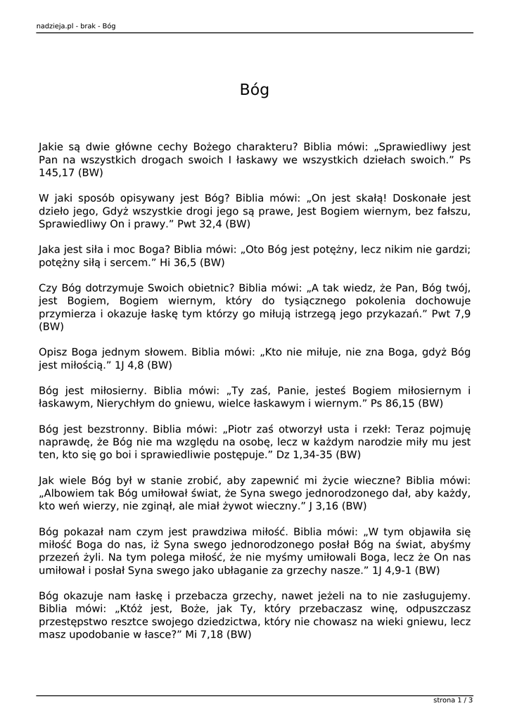 nadzieja.pl - brak - Bóg Bóg Jakie są dwie główne cechy Bożego charakteru? Biblia mówi: „Sprawiedliwy jest Pan na wszystkich drogach swoich I łaskawy we wszystkich dziełach swoich.” Ps 145,17 (BW) W jaki sposób opisywany jest Bóg? Biblia mówi: „On jest skałą! Doskonałe jest dzieło jego, Gdyż wszystkie drogi jego są prawe, Jest Bogiem wiernym, bez fałszu, Sprawiedliwy On i prawy.” Pwt 32,4 (BW) Jaka jest siła i moc Boga? Biblia mówi: „Oto Bóg jest potężny, lecz nikim nie gardzi; potężny siłą i sercem.” Hi 36,5 (BW) Czy Bóg dotrzymuje Swoich obietnic? Biblia mówi: „A tak wiedz, że Pan, Bóg twój, jest Bogiem, Bogiem wiernym, który do tysiącznego pokolenia dochowuje przymierza i okazuje łaskę tym którzy go miłują istrzegą jego przykazań.” Pwt 7,9 (BW) Opisz Boga jednym słowem. Biblia mówi: „Kto nie miłuje, nie zna Boga, gdyż Bóg jest miłością.” 1J 4,8 (BW) Bóg jest miłosierny. Biblia mówi: „Ty zaś, Panie, jesteś Bogiem miłosiernym i łaskawym, Nierychłym do gniewu, wielce łaskawym i wiernym.” Ps 86,15 (BW) Bóg jest bezstronny. Biblia mówi: „Piotr zaś otworzył usta i rzekł: Teraz pojmuję naprawdę, że Bóg nie ma względu na osobę, lecz w każdym narodzie miły mu jest ten, kto się go boi i sprawiedliwie postępuje.” Dz 1,34-35 (BW) Jak wiele Bóg był w stanie zrobić, aby zapewnić mi życie wieczne? Biblia mówi: „Albowiem tak Bóg umiłował świat, że Syna swego jednorodzonego dał, aby każdy, kto weń wierzy, nie zginął, ale miał żywot wieczny.” J 3,16 (BW) Bóg pokazał nam czym jest prawdziwa miłość. Biblia mówi: „W tym objawiła się miłość Boga do nas, iż Syna swego jednorodzonego posłał Bóg na świat, abyśmy przezeń żyli. Na tym polega miłość, że nie myśmy umiłowali Boga, lecz że On nas umiłował i posłał Syna swego jako ubłaganie za grzechy nasze.” 1J 4,9-1 (BW) Bóg okazuje nam łaskę i przebacza grzechy, nawet jeżeli na to nie zasługujemy. Biblia mówi: „Któż jest, Boże, jak Ty, który przebaczasz winę, odpuszczasz przestępstwo resztce swojego dziedzictwa, który nie chowasz na wieki gniewu, lecz masz upodobanie w łasce?” Mi 7,18 (BW) strona 1 / 3 nadzieja.pl - brak - Bóg Nie tylko sprawiedliwi korzystają z Bożych błogosławieństw. Biblia mówi: „...Bo słońce jego wschodzi nad złymi i dobrymi i deszcz pada na sprawiedliwych i niesprawiedliwych. Bo jeślibyście miłowali tylko tych, którzy was miłują, jakąż macie zapłatę? Czyż i celnicy tego nie czynią?” Mt 5,45-46 (BW) Bóg nie cofa się przed niczym! On chce dać nam wszystko. Biblia mówi: „On, który nawet własnego Syna nie oszczędził, ale go za nas wszystkich wydał, jakżeby nie miał z nim darować nam wszystkiego?” Rz 8,32 (BW) Bóg kocha nas jak oddany i miłujący ojciec. Biblia mówi: „Patrzcie, jaką miłość okazał nam Ojciec, że zostaliśmy nazwani dziećmi Bożymi i nimi jesteśmy. Dlatego świat nas nie zna, że jego nie poznał.” 1J 3,1 (BW) Boża wierność jest dla nas bezpiecznym schronieniem. Biblia mówi: „Piórami swymi okryje cię. I pod skrzydłami jego znajdziesz schronienie. Wierność jego jest tarczą i puklerzem.” Ps 91,4 (BW) Powinniśmy naśladować Boga. Biblia mówi: „Umiłowani, jeżeli Bóg nas tak umiłował, i myśmy powinni nawzajem się miłować.” 1J 4,11 (BW) Czasem Bóg karze tych, których kocha. Biblia mówi: „Bo kogo Pan miłuje, tego karze, i chłoszcze każdego syna, którego przyjmuje.” Hbr 12,6 (BW) Bóg nigdy nie zrezygnuje i zawsze będzie na nas czekał. Biblia mówi: „A Pan staje przed nim daleko: Miłością odwieczną cię ukochałem i dlatego nadal jestem ci życzliwy.” Jr 31,3 (BWP) Czy cokolwiek może nas oddzielić od Bożej miłości? Biblia mówi: „Albowiem jestem tego pewien, że ani śmierć, ani życie, ani aniołowie, ani potęgi niebieskie, ani teraźniejszość, ani przyszłość, ani moce, ani wysokość, ani głębokość, ani żadne inne stworzenie nie zdoła nas odłączyć od miłości Bożej, która jest w Chrystusie Jezusie, Panu naszym.” Rz 8,38-39 (BW) Jeśli chcesz przeczytać więcej na temat miłości Bożej, polecamy w dziale "Książki" zagadnienie pt. BEZWARUNKOWA MIŁOŚĆ. *** Stosowane skróty: BW - Biblia Warszawska (tzw. Nowy Przekład) BT - Biblia Tysiąclecia strona 2 / 3 nadzieja.pl - brak - Bóg BWP - Biblia Warszawsko-Praska (Biblia bpa Romaniuka) strona 3 / 3 Powered by TCPDF (www.tcpdf.org)