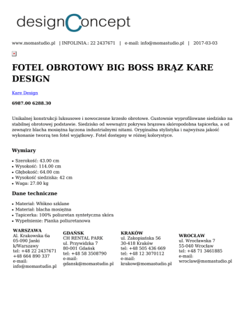 www.momastudio.pl | INFOLINIA.: 22 2437671 | e-mail: [email protected] | 2017-03-03 FOTEL OBROTOWY BIG BOSS BRĄZ KARE DESIGN Kare Design 6987.00 6288.30 Unikalnej konstrukcji luksusowe i nowoczesne krzesło obrotowe. Gustownie wyprofilowane siedzisko na stabilnej obrotowej podstawie. Siedzisko od wewnątrz pokrywa brązowa skóropodobna tapicerka, a od zewnątrz blacha mosiężna łączona industrialnymi nitami. Oryginalna stylistyka i najwyższa jakość wykonanie tworzą ten fotel wyjątkowy. Fotel dostępny w różnej kolorystyce. Wymiary ● ● ● ● ● Szerokość: 43.00 cm Wysokość: 114.00 cm Głębokość: 64.00 cm Wysokość siedziska: 42 cm Waga: 27.00 kg Dane techniczne ● ● ● ● Materiał: Włókno szklane Materiał: blacha mosiężna Tapicerka: 100% poliuretan syntetyczna skóra Wypełnienie: Pianka poliuretanowa WARSZAWA Al. Krakowska 6a 05-090 Janki k/Warszawy tel: +48 22 2437671 +48 664 890 337 e-mail: [email protected] GDAŃSK CH RENTAL PARK ul. Przywidzka 7 80-001 Gdańsk tel: +48 58 3508790 e-mail: [email protected] KRAKÓW ul. Zakopiańska 56 30-418 Kraków tel: +48 505 436 669 tel: +48 12 3070112 e-mail: [email protected] WROCŁAW ul. Wrocławska 7 55-040 Wrocław tel: +48 71 3461885 e-mail: [email protected]