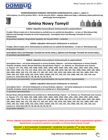 Centrum Obsługi Klienta +48 61 44 24 091 (czynne w dni robocze) Nowy Tomyśl, dnia 25-11-2015 r. HARMONOGRAM ODBIORU ODPADÓW KOMUNALNYCH; sektor I, sektor II Informujemy, że od 01 grudnia 2015 r. do 05 stycznia 2016 r. odpady odbierane będą z zabudowy jednorodzinnej wg poniższego harmonogramu: Gmina Nowy Tomyśl Odbiór odpadów komunalnych (zmieszanych) w pojemnikach Przyłęk, Glinno (część od ul. Komunalnej na zachód oraz na zachód od obwodnicy – w tym ul. Wierzbowy Gaj), Sękowo (od Nowego Tomyśla do torów kolejowych), Jastrzębsko Stare (od Nowego Tomyśla do torów kolejowych) 04 grudzień (piątek), 18 grudzień (piątek), 02 styczeń 2016 r. (sobota) Odbiór odpadów zbieranych selektywnie w workach Przyłęk, Glinno (część od ul. Komunalnej na zachód oraz na zachód od obwodnicy – w tym ul. Wierzbowy Gaj) 04 grudzień (piątek) Jastrzębsko Stare (od Nowego Tomyśla do torów kolej.), Sękowo (od Nowego Tomyśla do torów kolej.) 07 grudzień (poniedziałek) Odbiór odpadów komunalnych (zmieszanych) w pojemnikach Jastrzębsko Stare – od torów kolejowych w stronę Grubska, Sękowo – od torów kolejowych w stronę Chojnik, Chojniki, Grubsko, Szarki, Boruja Kościelna, Boruja Nowa, Paproć – os. Kolonia, os. Orzechowe oraz numery m. Paproć: 177, 176, 193A, 194, 194B, 194D, 194C, 194A, 187B, 193H, 195Ł, 195L, 195C, 195E, 195F, 193C, 191B, 195, 174A, 174B, 174, 173, 172, 191B, 191A, 191, 190, 189, 188, 187A, 186, 187, 192, 192B, 192A, 192F, 185, 185A, 184, 184A, 183A, 183, 176, 170, 168, 171, 169, 167, 167C, 165, 167A, 164, 163A, 163, 162, 161, 160A, 159C, 159, 159A, 160, 152, 152D, 152B, 143, 152A, 142A, 152AD, 158, 157, 156, 155, 153, 140A, 140, 141, 139, 154, oraz numery m. Cicha Góra 58, 57, 56, 38, 36, 35, 34, 32, 33 07 grudzień (poniedziałek), 21 grudzień (poniedziałek), 04 styczeń 2016 r. (poniedziałek) Odbiór odpadów zbieranych selektywnie w workach Jastrzębsko Stare – od torów kolejowych w stronę Grubska, Sękowo – od torów kolejowych w stronę Chojnik, Chojniki, Grubsko, Szarki, Boruja Kościelna (na zachód od ul. Wolsztyńskiej) 21 grudzień (poniedziałek) Boruja Nowa, Boruja Kościelna (na wschód od ul. Wolsztyńskiej), Paproć – os. Kolonia, os. Orzechowe oraz numery m. Paproć: 177, 176, 193A, 194, 194B, 194D, 194C, 194A, 187B, 193H, 195Ł, 195L, 195C, 195E, 195F, 193C, 191B, 195, 174A, 174B, 174, 173, 172, 191B, 191A, 191, 190, 189, 188, 187A, 186, 187, 192, 192B, 192A, 192F, 185, 185A, 184, 184A, 183A, 183, 176, 170, 168, 171, 169, 167, 167C, 165, 167A, 164, 163A, 163, 162, 161, 160A, 159C, 159, 159A, 160, 152, 152D, 152B, 143, 152A, 142A, 152AD, 158, 157, 156, 155, 153, 140A, 140, 141, 139, 154, oraz numery m. Cicha Góra 58, 57, 56, 38, 36, 35, 34, 32, 33 18 grudzień (piątek) Ważne: Odpady komunalne niesegregowane (zmieszane) należy gromadzić tylko w pojemnikach zgodnie z regulaminem utrzymania czystości i porządku na terenie Gminy Nowy Tomyśl. PROSIMY O WYSTAWIANIE POJEMNIKÓW I WORKÓW DO GODZINY 600 W DNIU WYWOZU! ODPADY Z POJEMNIKÓW I WORKI WYSTAWIONE PO PRZEJEŹDZIE POJAZDU SPECJALISTYCZNEGO NIE BĘDĄ ODEBRANE! Strona 1/6 Ciąg dalszy na następnej stronie (verte) Centrum Obsługi Klienta +48 61 44 24 091 (czynne w dni robocze) Nowy Tomyśl, dnia 25-11-2015 r. HARMONOGRAM ODBIORU ODPADÓW KOMUNALNYCH; sektor I, sektor II Odbiór odpadów komunalnych (zmieszanych) w pojemnikach Miasto Nowy Tomyśl ulice: Poziomkowa, Malinowa, Jeżynowa, Truskawkowa, Jagodowa, Agrestowa, Zbąszyńska, Musiała, Sczanieckiej, Wiatrakowa, Janusa, Działkowa, Zielona, 3 Stycznia, Zacisze, Wiklinowa, Koszykowa, Zaułek, Hołogi, Kanałowa, Ślósarskiego, Wodna, Żwirowa, Cicha, Spokojna, Zakątek, Piaskowa, Kamienna, Komunalna, Plac Niepodległości, Mickiewicza, Różana, Konopnickiej, Chmielna, Śniadeckich, Polna, Powstańców Wlkp., Łąkowa, Długa, Bohaterów, Krótka, Sadowa, Storczykowa, Słonecznikowa, Daliowa, Lawendowa, Kościuszki, Poznańska, Nowa, Szpitalna, Baranowskiego, Dojazd, Zbożowa, Zagrodowa, Paprocka, Rolna, Łanowa, Wiejska, Półwiejska, Granowa, Akacjowa, Osiedlowa, Świerkowa, Klonowa, Sienkiewicza, osiedle Tęczowe, numery z m. Glinno: 1A, 1, 3, 4, 5, 5A, 71, 93, 159, 159A, 83, 82, 81, 80, 78, 78D, 78A, 79, 161A, 162, 161, 160, 174, 164, 183, 172, 173, 173A, 173B, 173C, 164D, 163C, 163A, 163, 183L, 183K, 183J, 183H, 184N, 184F, 184I, 184E, 184D, 184B, 184A, 184, 185E, 185D, 185, 186, 187, 188, 189A, 189, 194, 190, 191, 191A, 196, 195A, 195B, 195, 196, 196M, 199, 198, 197, 203, 203C, 203B, 210, 221, 222, 223, 225K, 225I, 225H, 225G, 225F, 225E, 225N, 225, 225B, 225C, 225D, 224, 226, 227, 228, 229, 230, 231, 232, 234, 234A, 235, 236, 237, 238, 239, 240, 241, 242, 243, 244, 248, 249, 250, 249A, 246, 244, 245, 263A, 263B, 263C, 251, 252, 253, 254F, 254G, 254H, 254E, 255B, 255A, 254, 257, 257A, 259A, 259, 260, 258C, 258B, 258, 256, 261, 262 oraz ulice m. Glinno: Irysowa, Grudniowa, Słonecznikowa, Chabrowa, Lawendowa, Goździkowa, Jaśminowa, Malwowa, Tulipanowa, Azaliowa, Liliowa, Nagietkowa, Storczykowa, Konwaliowa, Fiołkowa, Różana, Krokusowa, Kwarcowa, Granitowa, Żwirowa, Dębowa, Działkowa oraz m. Paproć ul. Łamana 08 grudzień (wtorek), 22 grudzień (wtorek), 05 styczeń 2016 r. (wtorek) Odbiór odpadów zbieranych selektywnie w workach Miasto Nowy Tomyśl ulice: Poziomkowa, Malinowa, Jeżynowa, Truskawkowa, Jagodowa, Agrestowa, Zbąszyńska, Musiała, Sczanieckiej, Wiatrakowa, Janusa, Działkowa, Zielona, 3 Stycznia, Zacisze, Wiklinowa, Koszykowa, Zaułek, Hołogi, Kanałowa, Ślósarskiego, Wodna, Żwirowa, Cicha, Spokojna, Zakątek, Piaskowa, Kamienna, Komunalna, Różana, Storczykowa, Słonecznikowa, Daliowa, Lawendowa, Plac Niepodległości, numery z m. Glinno: 1A, 1, 3, 4, 5, 5A, 71, 93, 159, 159A, 83, 82, 81, 80, 78, 78D, 78A, 79, 161A, 162, 161, 160, 174, 164, 183, 172, 173, 173A, 173B, 173C, 164D, 163C, 163A, 163, 183L, 183K, 183J, 183H, 184N, 184F, 184I, 184E, 184D, 184B, 18