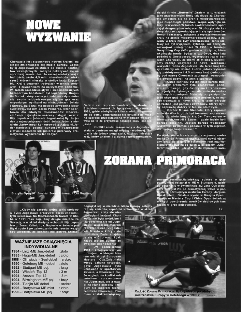 NOWE WYZW ANIE WYZWANIE Chorwacja jest stosunkowo nowym krajem na ci¹gle zmieniaj¹cej siê mapie Europy. Czêæ by³ej Jugos³awii zaistnia³a po okresie konfliktów wewnêtrznych zaczyna pokazywaæ siê na sportowej arenie. Jest to raczej niedu¿y kraj z ludnoci¹ oko³o 4,5 mln. mieszkañców, wiêkszoæ których mieszka w stolicy kraju Zagrzebiu. Kraj o bogatych tradycjach w tenisie sto³owym, z zawodnikami na najwy¿szym poziomie. W latach szeædziesi¹tych i siedemdziesi¹tych bezspornym bohaterem by³ legendarny Dragutin Surbek, który zachwyci³ ludzi na ca³ym wiecie swoim widowiskowym stylem gry oraz wspania³ymi wynikami na mistrzostwach wiata i Europy. Dzi kraj ma nowego zawodnika klasy wiatowej.Jest nim Zoran Primorac, wzór sportowca dla m³odych mieszkañców Chorwacji.Swoje najwiêksze sukcesy osi¹ga³ wraz z Ilij¹ Lupulescu (obecnie Jugos³awia).By³ to jeden z najmocniejszych debli wiata.Jeden z niewielu ,który móg³ konkurowaæ z Azjatami.Jedenastoletnie pasmo sukcesów rozpoczête z³otymi medalami ME juniorów przerwa³y dramatyczne wydarzenia lat 90-tych. Ostatni raz reprezentowa³em Jugos³awiê na ródziemnomorskich Igrzyskach w czerwcu 1991, gdzie zdobylimy kilka medali. Po powrocie do domu pogarszaj¹ca siê sytuacja polityczna szeroko przedstawiana w mediach wskazywa³a na to ¿e przysz³oæ naszego kraju jest niejasna. Konflikt zosta³ zakoñczony a Jugos³awia sta³a w centrum uwagi miêdzynarodowej. Sytuacja siê jednak pogarsza³a, w ci¹gu miesi¹ca kraj, który zna³em i z dum¹ reprezentowa³em, dziêki firmie Butterfly.Gra³em w turniejach jako przedstawiciel firmy tak d³ugo a¿ Chorwacja umocni³a siê na arenie miêdzynarodowej jako niepodleg³e pañstwo. Wojna wp³ynê³a na losy wszystkich.W takich okolicznociach sport zaj¹³ drugorzêdne miejsce. Skoñczy³y siê kariery dobrze zapowiadaj¹cych siê sportowców. Honor i zaszczyty zwi¹zane z reprezentowaniem kraju na arenie miêdzynarodowej zgas³y, a zawody w kraju nie by³y organizowane. Tenis sto³owy nie by³ wyj¹tkiem, sytuacja nie sprzyja³a rozwojowi umiejêtnoci. W 1991r. w turnieju Swaythling Cup (M) gra³em w dru¿ynie, która ukoñczy³a turniej bêd¹c w czo³ówce, dwa lata pó¿niej w Goeteborgu, wystêpuj¹c ju¿ w barwach Chorwacji, zajêlimi 35 miejsce. Musielimy zacz¹æ wszystko od nowa. Wczeniej wszystko robi³a Jugos³awia ,ale teraz kraj który znalimy nie istnia³. Ludzie jednak wykazali siê patriotyzmem i 4.5 mlnowy kraj zjednoczony pod nazw¹ Chorwacja zapragn¹³ wzmocnienia swojej pozycji na arenie sportowej. Okres konfliktu by³ dla mnie bardzo trudny, du¿ym problemem by³o zachowanie poziomu sportowego, gdy æwiczy³em i trenowa³em w pojedynkê.Sytuacja zmusi³a mnie do szukania innych rozwi¹zañ. Sta³o siê oczywistym ,¿e jeli chcê graæ na wiatowym poziomie, to muszê trenowaæ w innym kraju. W takim okresie potrzebna jest pomoc i zawodnicy, którzy byliby naprawdê dobrzy w tenisie sto³owym. Oprócz Milana Stencela, który zaprosi³ mnie do W³och, gdzie by³ trenerem, zapraszano mnie do wielu innych krajów. Trenowa³em w Niemczech,Austrii i Szwecji, gdzie ludzie byli bardzo gocinni. Jestem bardzo wdziêczny wszystkim za pomoc i poparcie w tych ciê¿kich dla mojego kraju czasach. Po wydarzeniach zwi¹zanych z wojenn¹ zawieruch¹ Zoran Primorac gra dla swej nowej ojczyzny, pn¹c siê w górê w wiatowym rankingu.Wystêpuje obecnie na co dzieñ w belgijskim Charleroi,bierze te¿ udzia³ w wielu imprezach wia- ZORANA PRIMORACA Brazylia Open 97: finalici Zoran Primorac i Liu Guoliang Kiedy siê zaczê³a wojna tenis sto³owy w by³ej Jugos³awii prze¿ywa³ okres znakomitych sukcesów. Na Mistrzostwach wiata w Chiba w 1991 roku zajêlimy drugie miejsce za Szwecj¹, a w sk³ad dru¿yny wchodzili Ilija Lupulescu, Zoran Kalinic i ja. Napiêcie w wiecie polityki ros³o i po zakoñczeniu mistrzostw wszyscy wiedzieli, ¿e konflikt nie potrwa krótko. WA¯NIEJSZE OSI¥GNIÊCIA INDYWIDUALNE 1984 - Linz -ME Jun.-debel 1985 - Haga-ME Jun.-debel 1988 - Olimpiada - Seul-debel 1990 - Geteborg ME - debel 1992 - Stuttgart ME poj. 1992 - Wiedeñ Top 12 1994 - Arezzo Top 12 1994 - Birmingham ME poj. 1995 - Tianjin M debel 1996 - Bratys³awa ME mixt 1996 - Bratys³awa ME poj. : z³oto : z³oto : srebro : z³oto : br¹z :3m :3m : br¹z : srebro : z³oto : br¹z towego formatu.Najwiêkszy sukces w grze pojedynczej osi¹gn¹³ w ME w Stuttgarcie, gdzie po pokonaniu w æwieræfinale 3:2 Jana Ove-Waldnera przegra³ 2:3 po dramatycznej walce w pó³finale z póniejszym mistrzem Europy Jorgiem Rosskopfem . Ostatnie wyniki w Brazylia Open , European Masters Cup i China Open wiadcz¹ o chêci powtórzenia wyników deblowych tym razem w grze pojedynczej. pogr¹¿y³ siê w nie³adzie. Mapa Europy kolejny raz siê zmieni³a, republiki wchodz¹ce w sk³ad Jugos³awii sta³y siê niepodleg³ymi krajami. Chorwacja nie by³a wyj¹tkiem i te¿ oddzieli³a siê od Jugos³awii. Wiêcej nie mog³em reprezentowaæ Jugos³awii. Miasto w którym siê urodzi³em, Zadar znajduje siê w Chorwacji i jak ka¿dy jestem dumny ze swojego pochodzenia. W padzierniku 1991 r. kolejnym wa¿nym turniejem, w którym bra³em udzia³ by³ European Masters Cup.Zaistnia³a wtedy dziwna sytuacja, gdy¿ Jugos³awia by³a uznawana w sportowym wiecie, a Chorwacja nie. Ze wzglêdu na konflikt odmówi³em reprezentowania Jugos³awii, ale z uwagi na ró¿ne przepisy i regu³y nie mog³em reprezentowaæ Chorwacji. ProRadoæ Zorana Primoraca i Ilji Lupulescu po zdobyciu blem zosta³ rozwi¹zany mistrzostwa Europy w Geteborgu w 1990 r Foto: DTS J.K