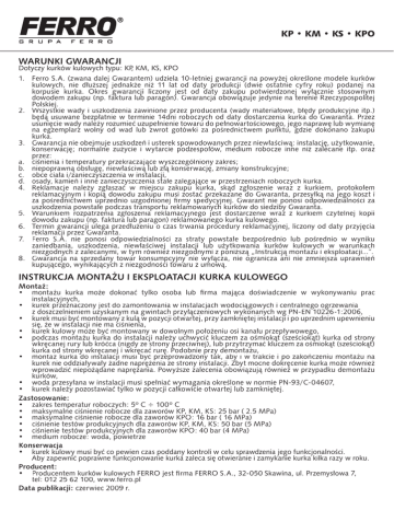 KP • KM • KS • KPO WARUNKI GWARANCJI Dotyczy kurków kulowych typu: KP, KM, KS, KPO 1. Ferro S.A. (zwana dalej Gwarantem) udziela 10-letniej gwarancji na powyżej określone modele kurków kulowych, nie dłuższej jednakże niż 11 lat od daty produkcji (dwie ostatnie cyfry roku) podanej na korpusie kurka. Okres gwarancji liczony jest od daty zakupu potwierdzonej wyłącznie stosownym dowodem zakupu (np. faktura lub paragon). Gwarancja obowiązuje jedynie na terenie Rzeczypospolitej Polskiej. 2. Wszystkie wady i uszkodzenia zawinione przez producenta (wady materiałowe, błędy produkcyjne itp.) będą usuwane bezpłatnie w terminie 14dni roboczych od daty dostarczenia kurka do Gwaranta. Przez usunięcie wady należy rozumieć uzupełnienie towaru do pełnowartościowego, jego naprawę lub wymianę na egzemplarz wolny od wad lub zwrot gotówki za pośrednictwem punktu, gdzie dokonano zakupu kurka. 3. Gwarancja nie obejmuje uszkodzeń i usterek spowodowanych przez niewłaściwą: instalację, użytkowanie, konserwację; normalne zużycie i wytarcie podzespołów, medium robocze inne niż zalecane itp. oraz przez: a. ciśnienia i temperatury przekraczające wyszczególniony zakres; b. niepoprawną obsługę, niewłaściwą lub złą konserwację, zmiany konstrukcyjne; c. obce ciała i/zanieczyszczenia w instalacji, d. osady, kamień i inne zanieczyszczenia stałe zalegające w przestrzeniach roboczych kurka. 4. Reklamacje należy zgłaszać w miejscu zakupu kurka, skąd zgłoszenie wraz z kurkiem, protokołem reklamacyjnym i kopią dowodu zakupu musi zostać przekazane do Gwaranta, przesyłką na jego koszt i za pośrednictwem uprzednio uzgodnionej firmy spedycyjnej. Gwarant nie ponosi odpowiedzialności za uszkodzenia powstałe podczas transportu reklamowanych kurków do siedziby Gwaranta. 5. Warunkiem rozpatrzenia zgłoszenia reklamacyjnego jest dostarczenie wraz z kurkiem czytelnej kopii dowodu zakupu (np. faktura lub paragon) reklamowanego kurka kulowego. 6. Termin gwarancji ulega przedłużeniu o czas trwania procedury reklamacyjnej, liczony od daty przyjęcia reklamacji przez Gwaranta. 7. Ferro S.A. nie ponosi odpowiedzialności za straty powstałe bezpośrednio lub pośrednio w wyniku zaniedbania, uszkodzenia, niewłaściwej instalacji lub użytkowania kurków kulowych w warunkach niezgodnych z zalecanymi, w tym również niezgodnymi z poniższą „Instrukcją montażu i eksploatacji...”. 8. Gwarancja na sprzedany towar konsumpcyjny nie wyłącza, nie ogranicza ani nie zmniejsza uprawnień kupującego, wynikających z niezgodności towaru z umową. INSTRUKCJA MONTAŻU I EKSPLOATACJI KURKA KULOWEGO Montaż: • montażu kurka może dokonać tylko osoba lub firma mająca doświadczenie w wykonywaniu prac instalacyjnych, • kurek przeznaczony jest do zamontowania w instalacjach wodociągowych i centralnego ogrzewania z doszczelnieniem uzyskanym na gwintach przyłączeniowych wykonanych wg PN-EN 10226-1:2006, • kurek musi być montowany z kulą w pozycji otwartej, przy zamkniętej instalacji i po uprzednim upewnieniu się, że w instalacji nie ma ciśnienia, • kurek kulowy może być montowany w dowolnym położeniu osi kanału przepływowego, • podczas montażu kurka do instalacji należy uchwycić kluczem za ośmiokąt (sześciokąt) kurka od strony wkręcanej rury lub króćca (nigdy ze strony przeciwnej), lub przytrzymać kluczem za ośmiokąt (sześciokąt) kurka od strony wkręcanej i wkręcać rurę. Podobnie przy demontażu, • montaż kurka do instalacji musi być przeprowadzony tak, aby i w trakcie i po zakończeniu montażu na kurek nie oddziaływały żadne naprężenia ze strony instalacji. Zbyt mocne dokręcenie kurka może również wprowadzić niepożądane naprężania. Powyższe zalecenia obowiązują również w przypadku demontażu kurków, • woda przesyłana w instalacji musi spełniać wymagania określone w normie PN-93/C-04607, • kurek należy pozostawiać tylko w pozycji całkowicie otwartej lub zamkniętej. Zastosowanie: • zakres temperatur roboczych: 5º C ÷ 100º C • maksymalne ciśnienie robocze dla zaworów KP, KM, KS: 25 bar ( 2.5 MPa) • maksymalne ciśnienie robocze dla zaworów KPO: 16 bar ( 16 MPa) • ciśnienie testów produkcyjnych dla zaworów KP, KM, KS: 50 bar (5 MPa) • ciśnienie testów produkcyjnych dla zaworów KPO: 40 bar (4 MPa) • medium robocze: woda, powietrze Konserwacja • kurek kulowy musi być co pewien czas poddany kontroli w celu sprawdzenia jego funkcjonalności. Aby zapewnić poprawne funkcjonowanie kurka zaleca się otwieranie i zamykanie kurka kilka razy w roku. Producent: • Producentem kurków kulowych FERRO jest firma FERRO S.A., 32-050 Skawina, ul. Przemysłowa 7, tel: 012 25 62 100, www.ferro.pl Data publikacji: czerwiec 2009 r.
