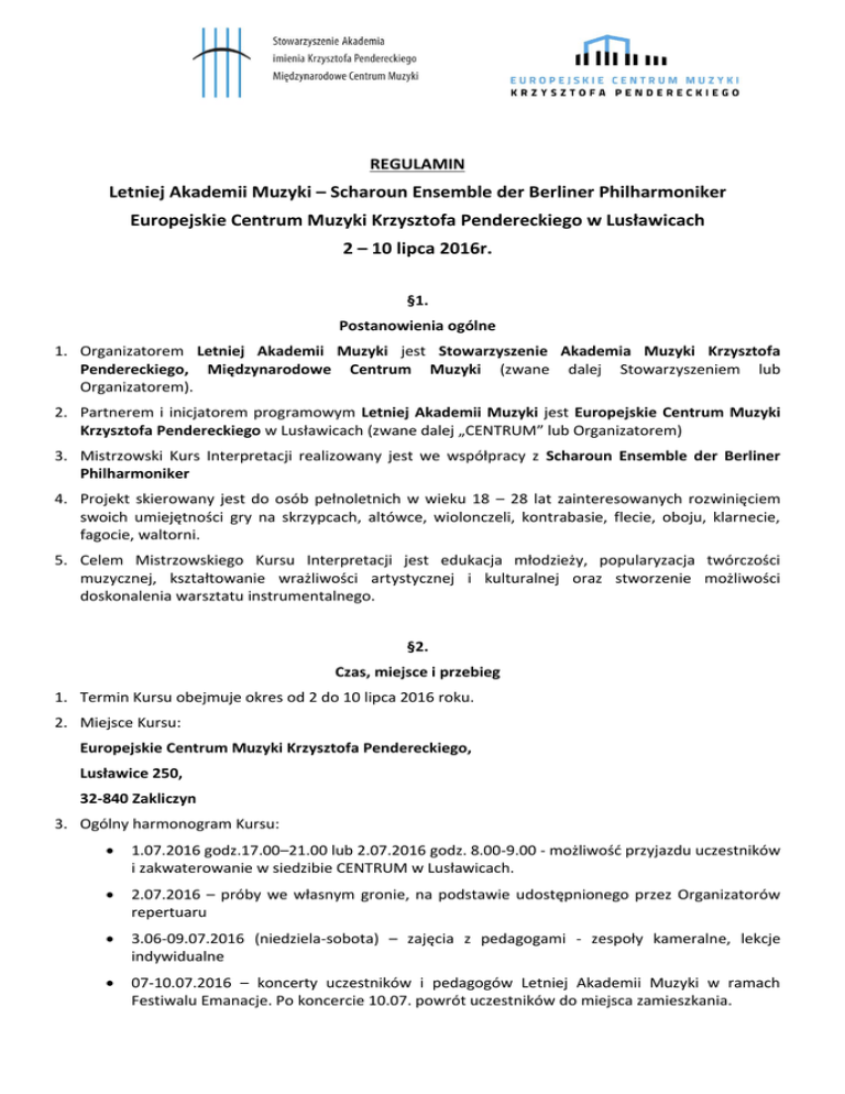 REGULAMIN Letniej Akademii Muzyki – Scharoun Ensemble der Berliner Philharmoniker Europejskie Centrum Muzyki Krzysztofa Pendereckiego w Lusławicach 2 – 10 lipca 2016r. §1. Postanowienia ogólne 1. Organizatorem Letniej Akademii Muzyki jest Stowarzyszenie Akademia Muzyki Krzysztofa Pendereckiego, Międzynarodowe Centrum Muzyki (zwane dalej Stowarzyszeniem lub Organizatorem). 2. Partnerem i inicjatorem programowym Letniej Akademii Muzyki jest Europejskie Centrum Muzyki Krzysztofa Pendereckiego w Lusławicach (zwane dalej „CENTRUM” lub Organizatorem) 3. Mistrzowski Kurs Interpretacji realizowany jest we współpracy z Scharoun Ensemble der Berliner Philharmoniker 4. Projekt skierowany jest do osób pełnoletnich w wieku 18 – 28 lat zainteresowanych rozwinięciem swoich umiejętności gry na skrzypcach, altówce, wiolonczeli, kontrabasie, flecie, oboju, klarnecie, fagocie, waltorni. 5. Celem Mistrzowskiego Kursu Interpretacji jest edukacja młodzieży, popularyzacja twórczości muzycznej, kształtowanie wrażliwości artystycznej i kulturalnej oraz stworzenie możliwości doskonalenia warsztatu instrumentalnego. §2. Czas, miejsce i przebieg 1. Termin Kursu obejmuje okres od 2 do 10 lipca 2016 roku. 2. Miejsce Kursu: Europejskie Centrum Muzyki Krzysztofa Pendereckiego, Lusławice 250, 32-840 Zakliczyn 3. Ogólny harmonogram Kursu: 1.07.2016 godz.17.00–21.00 lub 2.07.2016 godz. 8.00-9.00 - możliwość przyjazdu uczestników i zakwaterowanie w siedzibie CENTRUM w Lusławicach. 2.07.2016 – próby we własnym gronie, na podstawie udostępnionego przez Organizatorów repertuaru 3.06-09.07.2016 (niedziela-sobota) – zajęcia z pedagogami - zespoły kameralne, lekcje indywidualne 07-10.07.2016 – koncerty uczestników i pedagogów Letniej Akademii Muzyki w ramach Festiwalu Emanacje. Po koncercie 10.07. powrót uczestników do miejsca zamieszkania. 4. Szczegółowy harmonogram Kursu zostanie podany Uczestnikom nie później niż w dniu przyjazdu. §3. Uczestnicy Kursu 1. Warunkiem uczestnictwa w Mistrzowskim Kursie Interpretacji jest wypełnienie i podpisanie formularza zgłoszeniowego – Karty Zgłoszenia, stanowiącej Załącznik 1 do niniejszego regulaminu, w terminie do dnia 8 maja 2016 r. oraz przesłanie pocztą elektroniczną na adres: [email protected] . Oryginał podpisanej karty zgłoszenia należy przekazać organizatorom w dniu przyjazdu na Kurs. 2. Uczestnik zgłaszający się do projektu wyraża zgodę na przetwarzanie danych osobowych przez Organizatorów. 3. Uczestnicy zostaną wybrani na podstawie informacji zawartych w Karcie Zgłoszenia lub do niej dołączonych. 4. W przypadku większej ilości zgłoszeń zostanie utworzona lista rezerwowa kandydatów. W przypadku rezygnacji kandydata z udziału w Letniej Akademii Muzyki, może zostać zakwalifikowany kandydat z listy rezerwowej. 5. Spośród nadesłanych zgłoszeń, które spełniają kryteria opisane powyżej, Organizatorzy wybiorą Uczestników. Od decyzji Organizatorów w sprawie wyłonienia Uczestników nie przysługuje odwołanie. Organizatorzy podejmują decyzje na podstawie subiektywnej oceny nadesłanych zgłoszeń i nie są zobowiązani do ich uzasadniania. 6. W przypadku przyjęcia zgłoszenia drogą elektroniczną, Uczestnik zakwalifikowany do Kursu jest zobowiązany do przesłania Organizatorowi lub dostarczenia w dniu rozpoczęcia Kursu oryginałów formularza zgłoszeniowego oraz zgody na przetwarzanie danych osobowych. §4. Postanowienia organizacyjne 1. Organizatorzy Kursu zapewniają uczestnikom: a. pobyt (zakwaterowanie w 2-osobowych pokojach w siedzibie CENTRUM w Lusławicach), b. pełne wyżywienie (3 posiłki dziennie), c. udział w zajęciach dydaktycznych (zespoły kameralne, lekcje indywidualne) d. dostęp do pomocy medycznej w razie zaistniałej potrzeby. 2. Organizatorzy nie są zobowiązani do pokrycia kosztów związanych z transportem Uczestników do i z miejsca odbywania Kursu. 3. Udział w kosztach Kursu wynosi 950 zł. 4. Nr konta zostanie przekazany zakwalifikowanym uczestnikom, termin uregulowania należności za udział w Letniej Akademii Muzyki mija 10 czerwca 2016 r. Wpłat należy dokonywać w formie jednorazowego przelewu. W tytule przelewu należy podać następujące informacje „LAM 2016 imię nazwisko uczestnika, instrument, przedział czasowy udziału w kursie” (np. „LAM 2016 Jan Kowalski wiolonczela 5-8.07.2016 r.” lub „LAM 2016 Jan Kowalski skrzypce 2-10.07.2016”). 5. Wszelkie informacje dotyczące organizacji oraz realizacji projektu będą ogłaszane na stronie internetowej www.penderecki-center.pl oraz będą przekazywane drogą mailową lub/i telefoniczną. 6. Kurs z przyczyn niezależnych od Organizatora może być w dowolnym momencie odwołany. 7. Uczestnicy Kursu zobowiązani są do zapewnienia sobie transportu na własną rękę w ustalonym terminie: a. w dniu 1 lipca 2016 r. do obiektu Europejskiego Centrum Muzyki Krzysztofa Pendereckiego w Lusławicach , b. w dniu 10 lipca 2016 r. do miejsca zamieszkania. 8. Uczestnicy Kursu zobowiązani są do udziału w zaplanowanych zajęciach, w szczególności do udziału we wszystkich zespołach kameralnych. Ponadto, uczestnicy zobowiązani są do punktualności i przestrzegania harmonogramu (w tym także godzin posiłków, ciszy nocnej etc.), kulturalnego zachowania oraz dbałości o dobrą atmosferę i stosunki koleżeńskie z innymi uczestnikami. 9. Cisza nocna na terenie Europejskiego Centrum Muzyki Krzysztofa Pendereckiego obowiązuje w godzinach od 22:00 do 6:00 10. Na terenie Europejskiego Centrum Muzyki Krzysztofa Pendereckiego obowiązuje zakaz palenia tytoniu oraz spożywania alkoholu. 11. Każdy Uczestnik zobowiązany jest przestrzegać Regulamin Europejskiego Centrum Muzyki Krzysztofa Pendereckiego, który określa zasady przebywania na terenie CENTRUM w Lusławicach oraz odpowiedzialność materialną za wszelkie szkody mogące powstać podczas pobytu w CENTRUM. Każdy Uczestnik ma obowiąz