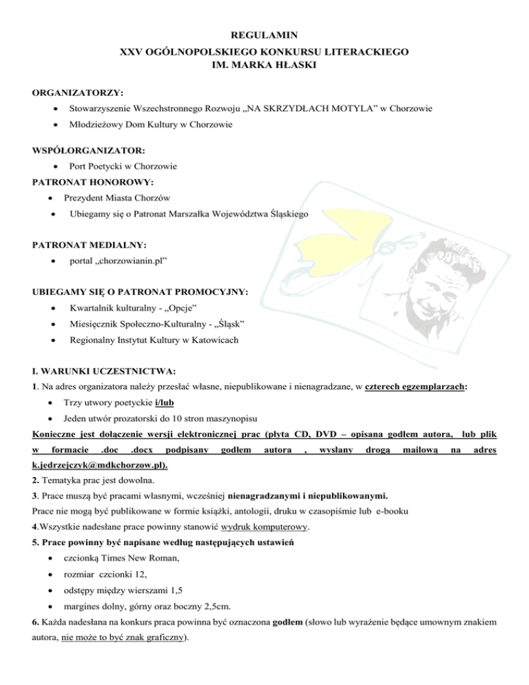 REGULAMIN XXV OGÓLNOPOLSKIEGO KONKURSU LITERACKIEGO IM. MARKA HŁASKI ORGANIZATORZY: Stowarzyszenie Wszechstronnego Rozwoju „NA SKRZYDŁACH MOTYLA” w Chorzowie Młodzieżowy Dom Kultury w Chorzowie WSPÓŁORGANIZATOR: Port Poetycki w Chorzowie PATRONAT HONOROWY: Prezydent Miasta Chorzów Ubiegamy się o Patronat Marszałka Województwa Śląskiego PATRONAT MEDIALNY: portal „chorzowianin.pl” UBIEGAMY SIĘ O PATRONAT PROMOCYJNY: Kwartalnik kulturalny - „Opcje” Miesięcznik Społeczno-Kulturalny - „Śląsk” Regionalny Instytut Kultury w Katowicach I. WARUNKI UCZESTNICTWA: 1. Na adres organizatora należy przesłać własne, niepublikowane i nienagradzane, w czterech egzemplarzach: Trzy utwory poetyckie i/lub Jeden utwór prozatorski do 10 stron maszynopisu Konieczne jest dołączenie wersji elektronicznej prac (płyta CD, DVD – opisana godłem autora, lub plik w formacie .doc .docx podpisany godłem autora , wysłany drogą mailową na adres [email protected]). 2. Tematyka prac jest dowolna. 3. Prace muszą być pracami własnymi, wcześniej nienagradzanymi i niepublikowanymi. Prace nie mogą być publikowane w formie książki, antologii, druku w czasopiśmie lub e-booku 4.Wszystkie nadesłane prace powinny stanowić wydruk komputerowy. 5. Prace powinny być napisane według następujących ustawień czcionką Times New Roman, rozmiar czcionki 12, odstępy między wierszami 1,5 margines dolny, górny oraz boczny 2,5cm. 6. Każda nadesłana na konkurs praca powinna być oznaczona godłem (słowo lub wyrażenie będące umownym znakiem autora, nie może to być znak graficzny). 7. Do prac należy dołączyć kopertę opatrzoną tym samym godłem autora. W kopercie należy umieścić podpisane oświadczenie* oraz kwestionariusz, który musi zawierać: imię i nazwisko autora, datę urodzenia, dokładny adres zamieszkania, telefon kontaktowy, adres e-mail. W kwestionariuszu należy umieścić godło oraz prawdziwe dane autora - nie pseudonim artystyczny. 8. PRACE, KTÓRE NIE BĘDĄ SPEŁNIAŁY WYŻEJ WYMIENIONYCH WYMOGÓW BĘDĄ ODRZUCANE. 9. Koszty przygotowania i dostarczenia prac oraz koszty przyjazdu na uroczyste wręczenie nagród ponosi uczestnik konkursu. II. TERMINY: 1. Prace należy przesyłać do 28 kwietnia 2017r. (decyduje data stempla pocztowego) na adres: Młodzieżowy Dom Kultury ul. J. Lompy 13 41-500 Chorzów [ z dopiskiem KONKURS LITERACKI IM.MARKA HŁASKI ] 2. O uroczystym rozstrzygnięciu konkursu, które nastąpi w pierwszych dwóch tygodniach czerwca 2017 r. w Młodzieżowym Domu Kultury w Chorzowie organizatorzy poinformują laureatów pisemnie lub telefonicznie. III. NAGRODY: 1. Powołane przez organizatorów jury dokona oceny nadesłanych prac oraz zadecyduje o podziale nagród. 2. Jury ma prawo odrzucić prace, które wskazywałyby na przywłaszczenie sobie niematerialnych dóbr intelektualnych osób trzecich. 3. Organizatorzy przewidują nagrody pieniężne dla laureatów I, II i III miejsca w dziedzinie prozy oraz I, II i III miejsca w dziedzinie poezji oraz wyróżnienia w obu kategoriach. Przewidywane kwoty nagród pieniężnych to 600 PLN (I miejsce), 500 PLN (II miejsce), 400 PLN (III miejsce). Kwoty te mogą być wyższe, jeżeli organizator pozyska dodatkowych sponsorów. 4. Laureat pierwszego miejsca w dziedzinie poezji będzie miał możliwość również zaprezentowania się jako gość podczas XV edycji „Portu Poetyckiego” organizowanego w Chorzowie. IV. USTALENIA KOŃCOWE: 1. Zgłoszenie prac do konkursu jest równoznaczne z wyrażeniem zgody na przetwarzanie danych osobowych do celów organizacyjnych Młodzieżowego Domu Kultury oraz zgody na nieodpłatne prawo do rejestracji prezentacji dowolną techniką zapisu oraz na publikację wizerunku autora (zdjęć i nagrań wykonanych podczas imprezy) do celów edukacyjnych i popularyzatorskich konkursu. Organizatorzy zastrzegają sobie prawo do publikacji wyróżnionych utworów w materiałach promocyjnych, prasie lokalnej, na stronie internetowej MDK, na profilu społecznościowym Facebook oraz na stronach internetowych instytucji współpracujących. 2. Organizatorzy nie zwracają nadesłanych prac, stają się one własnością organizatora. 3. Sprawy nie ujęte w regulaminie rozstrzyga organizator. 4. Administratorem danych jest Młodzieżowy Dom Kultury w Chorzowie 5. Koordynator imprezy: Katarzyna Jędrzejczyk ([email protected]) *Załącznik do Regulaminu XXV Ogólnopolskiego Konkursu Literackiego im. Marka Hłaski Dane osobowe uczestnika konkursu: Imię / imiona Nazwisko Data urodzenia Adres zamieszkania (ulica, nr domu, nr lokalu, miejscowość, kod pocztowy) Numer telefonu kontaktowego Adres e-mail Godło Tytuł utworu OŚWIADCZENIE Oświadczam, iż przekazane prace konkursowe nie były wcześniej nagradzane i publikowane oraz nie naruszają majątkowych i osobistych praw autorskich osób trzecich. ………………………………….... (Podpis uczestnika konkursu)